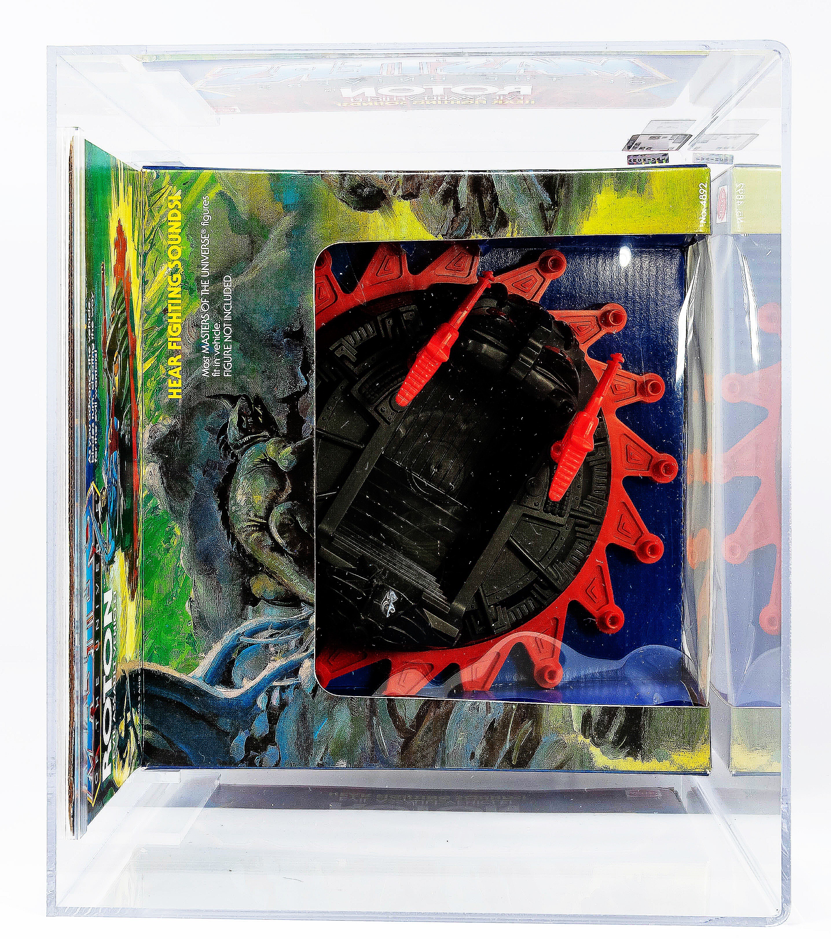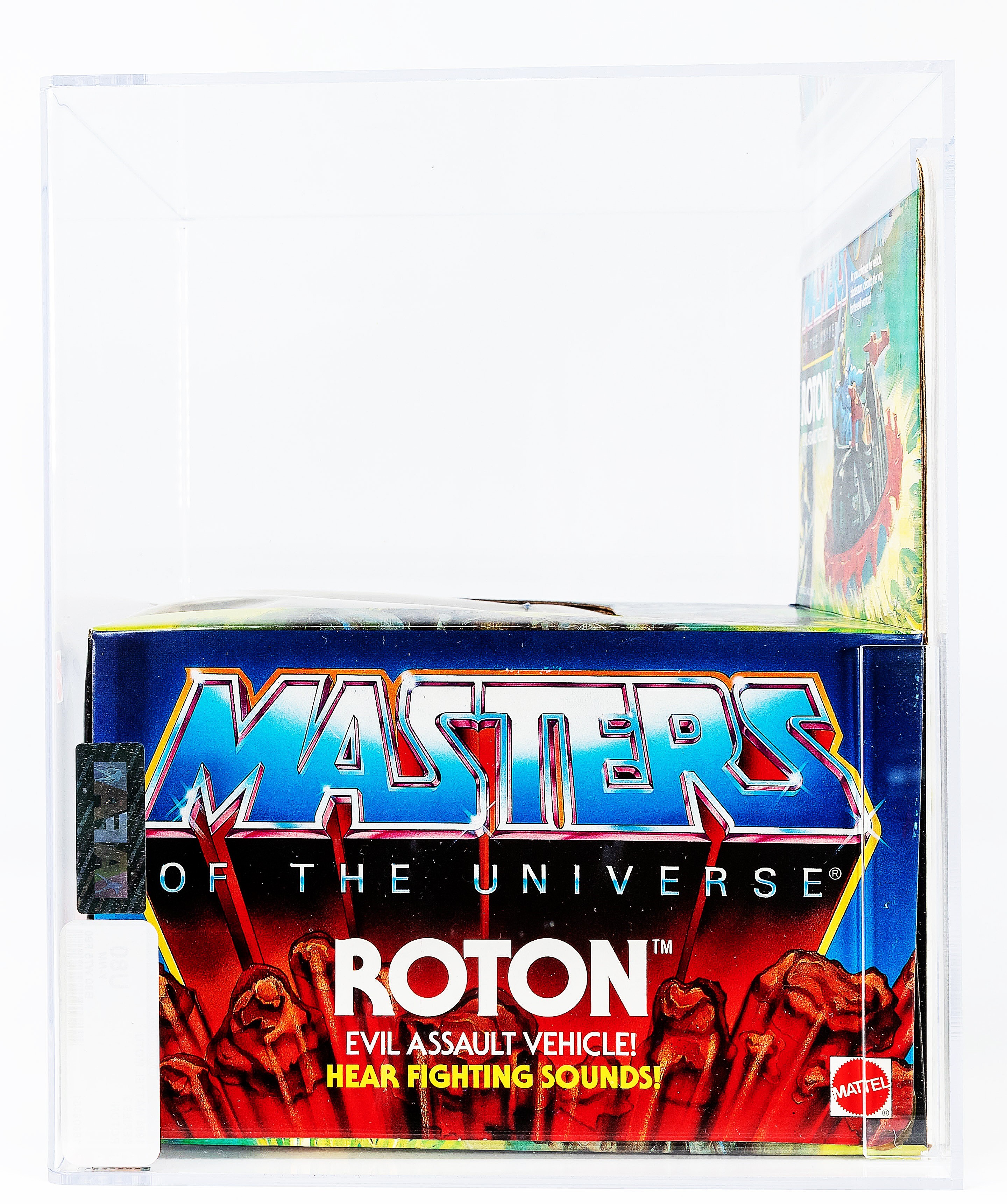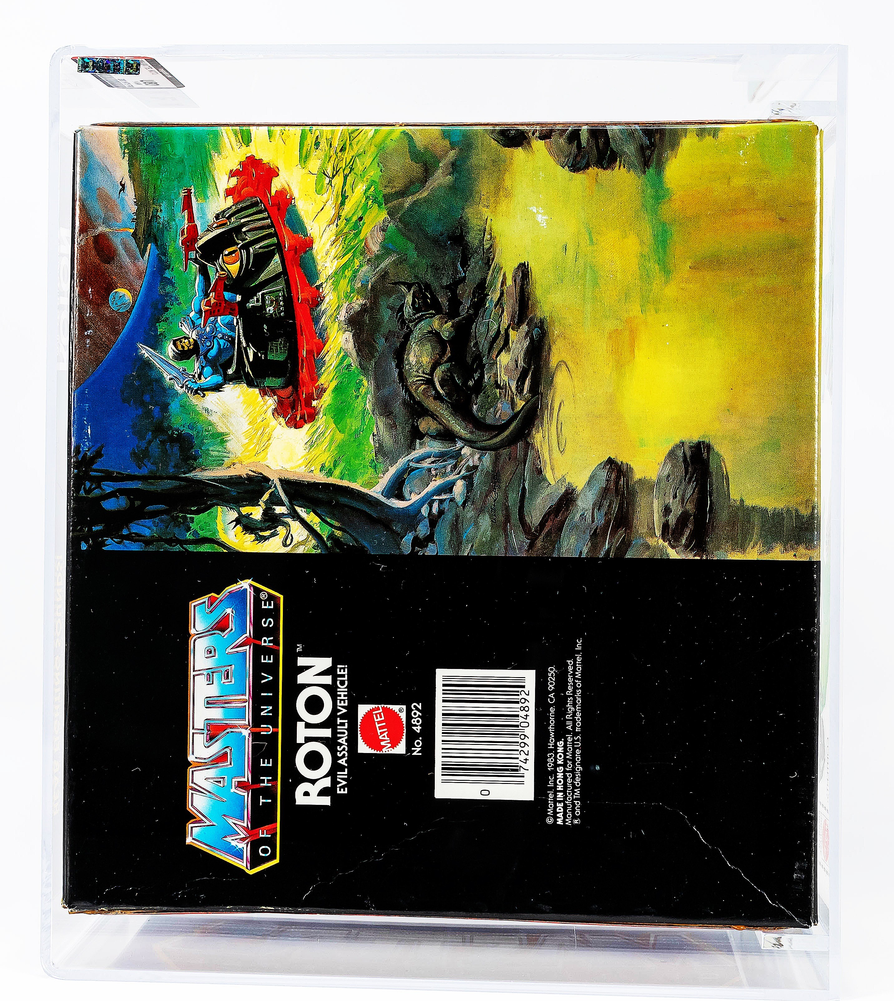 Great box art depicting the villainous Skeletor make this a very popular Series Three vehicle. Presented is a case-fresh Roton. Factory sealed with no flap crease whatsoever, collectors will be hard pressed to find a superior example. Very slight yellowing of the window and a tiny ding at the top of the window account for the 75 subgrade. Overall an awesome piece sure to excite collectors. Made in Hong Kong. Encapsulated by AFA (Uncirculated 80y, 80-75-90), #18908551
