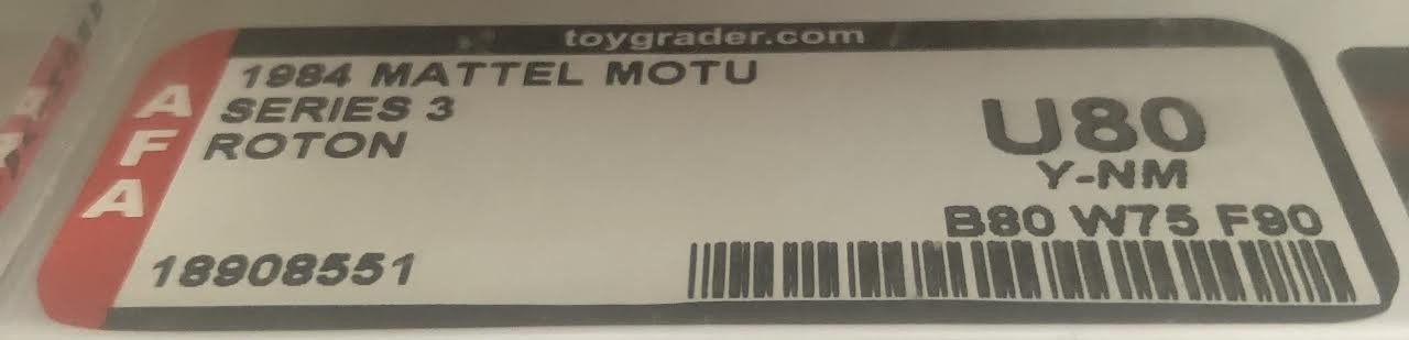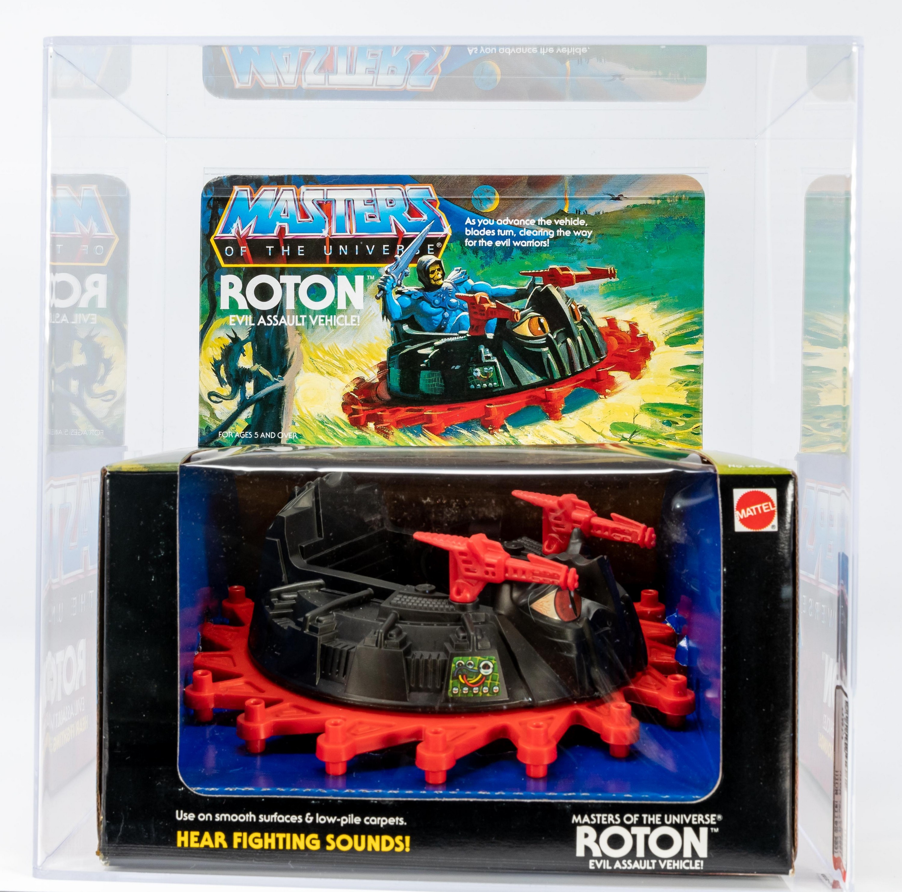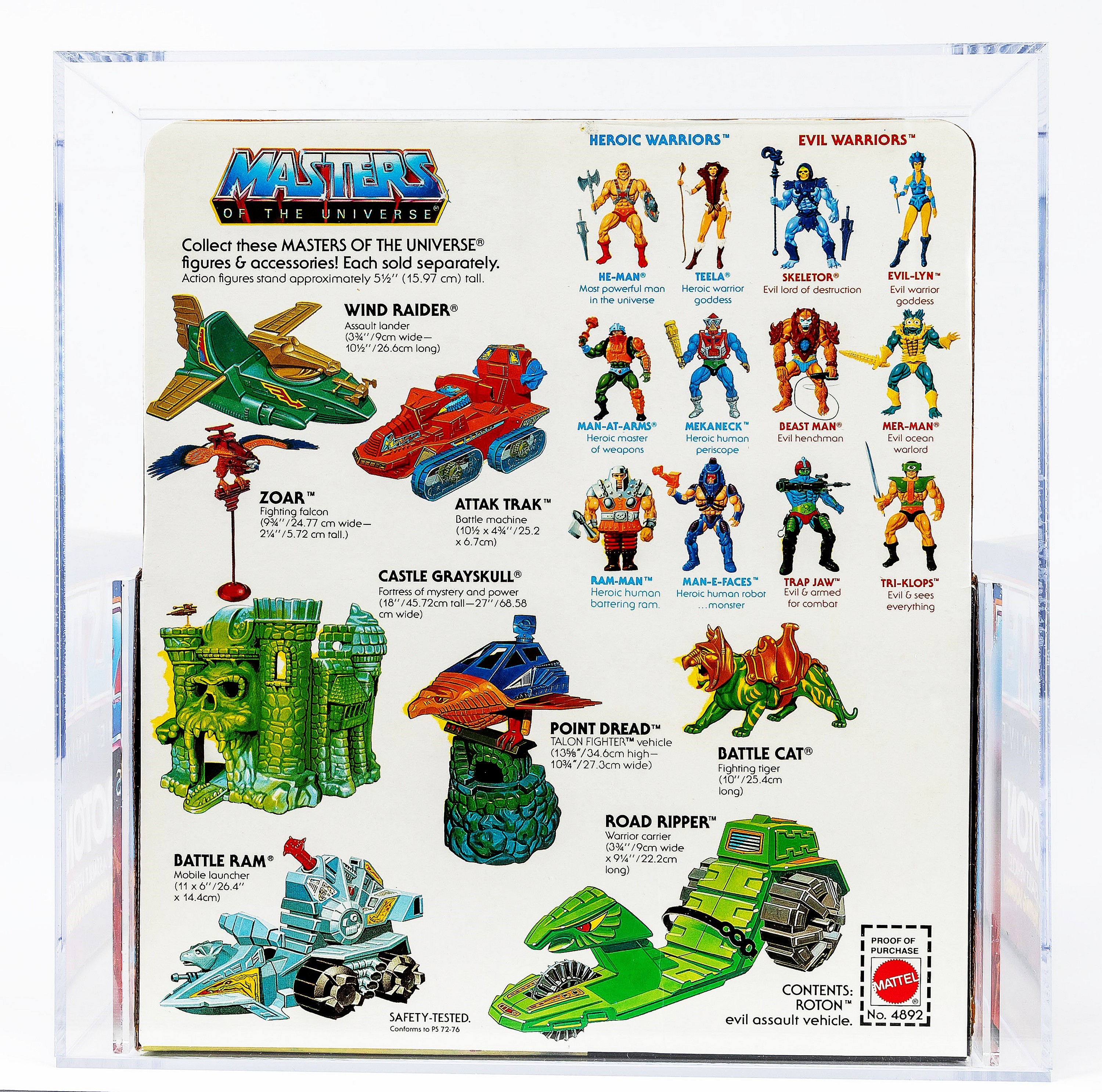 Great box art depicting the villainous Skeletor make this a very popular Series Three vehicle. Presented is a case-fresh Roton. Factory sealed with no flap crease whatsoever, collectors will be hard pressed to find a superior example. Very slight yellowing of the window and a tiny ding at the top of the window account for the 75 subgrade. Overall an awesome piece sure to excite collectors. Made in Hong Kong. Encapsulated by AFA (Uncirculated 80y, 80-75-90), #18908551