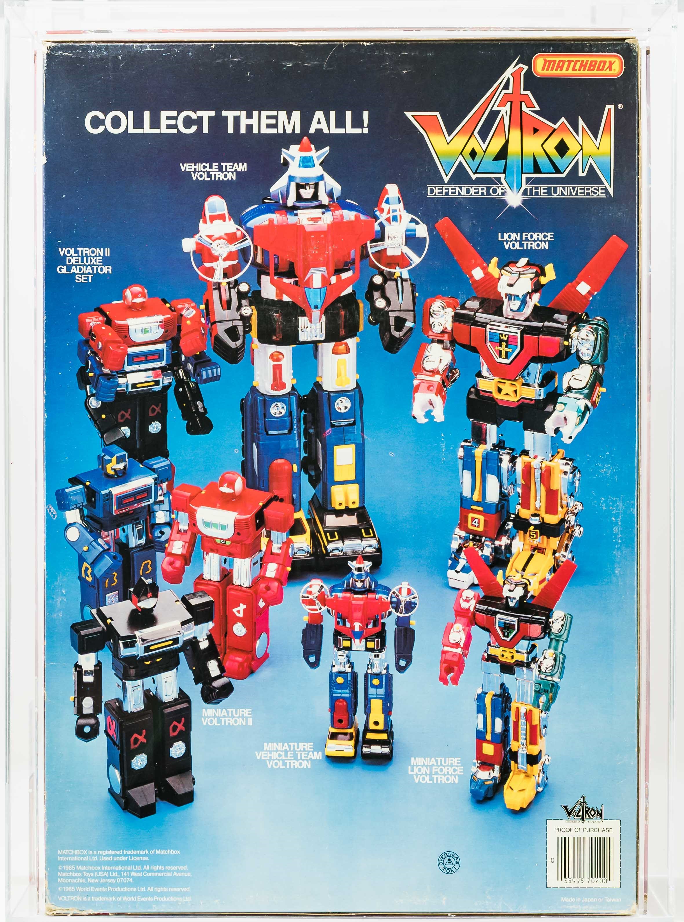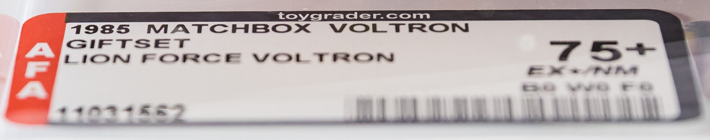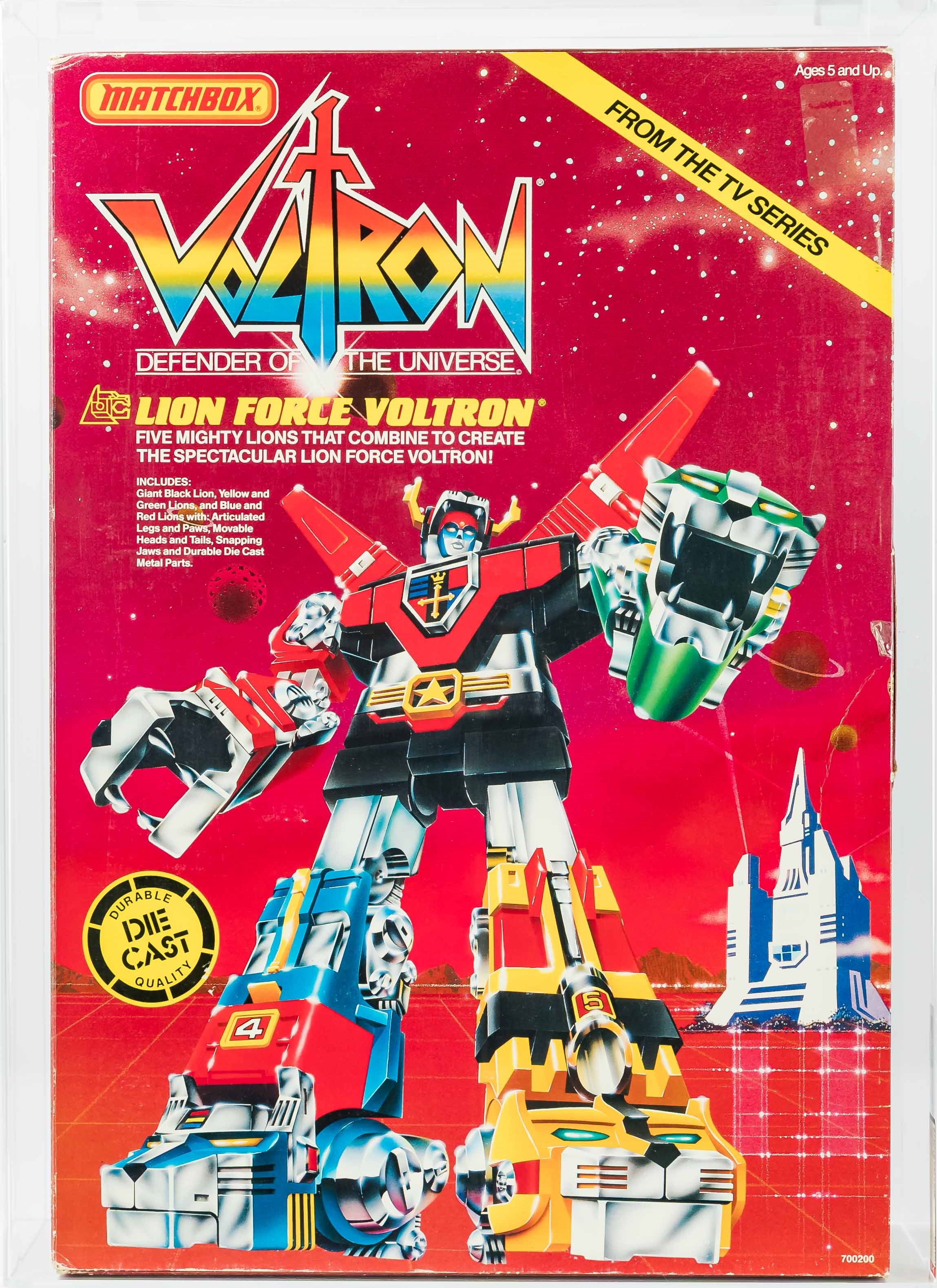 Ultra rare AFA red label Lion Force Giftset from the highly coveted Matchbox Voltron line released in 1985. Unlike the more common Voltron toys released by Panosh Place and LJN, the Matchbox releases, especially the giftsets, were of exceptional high-quality (die cast). The offered giftset is the “holy grail” in the Voltron line, and it’s rare - very rare. In fact, AFA has only assigned a red label to six examples (inclusive of all grades) in its 25 year history.