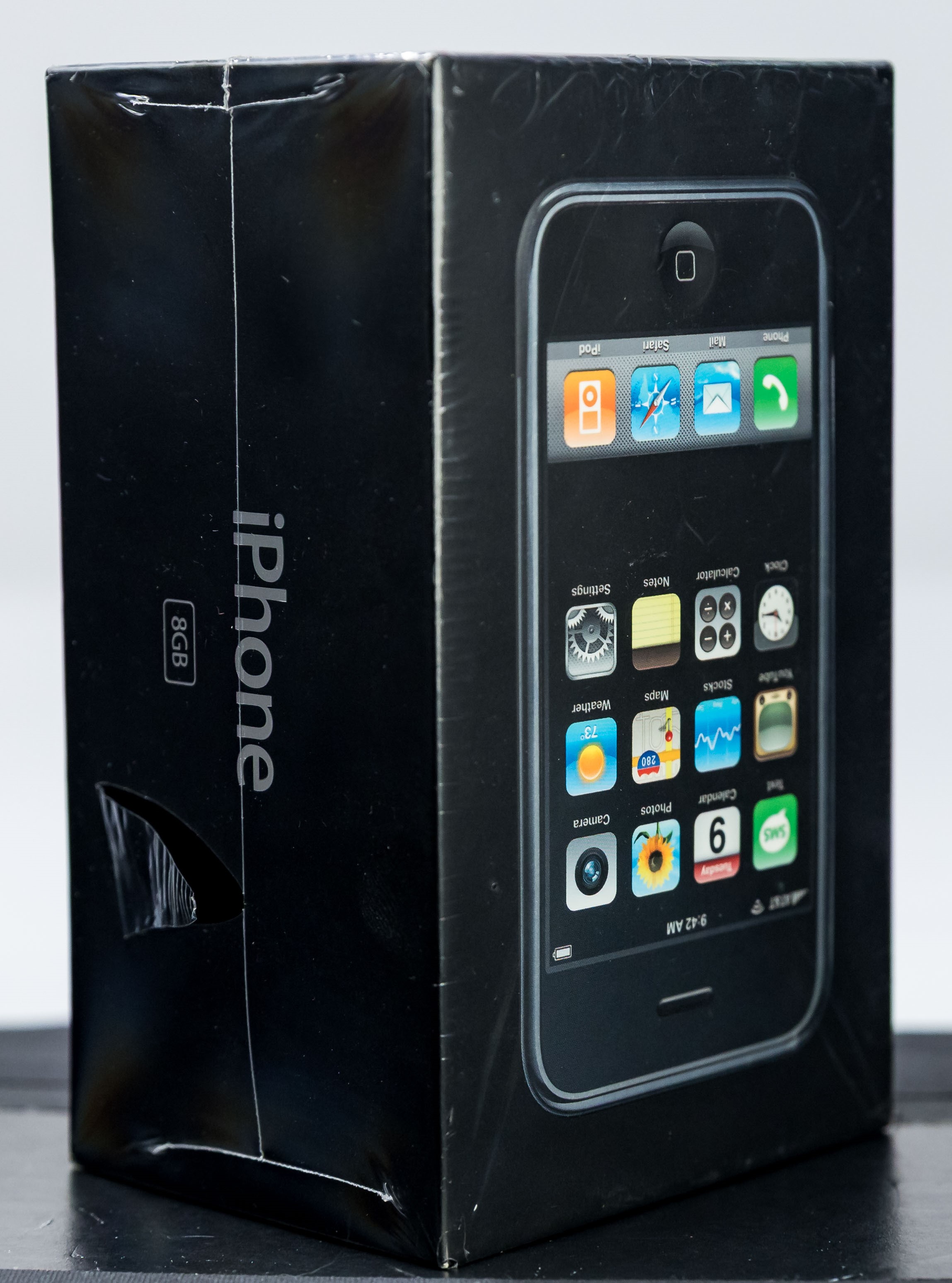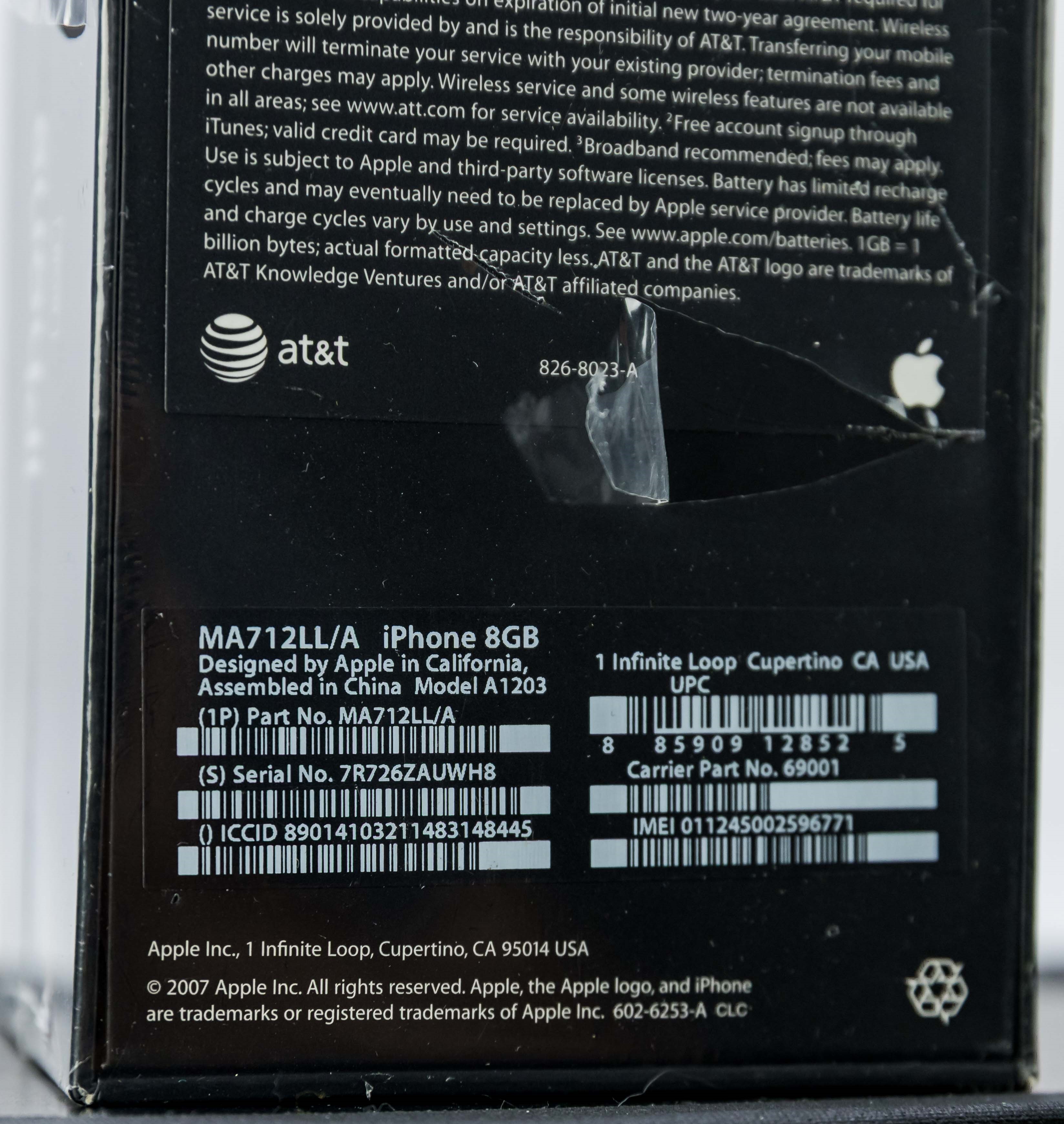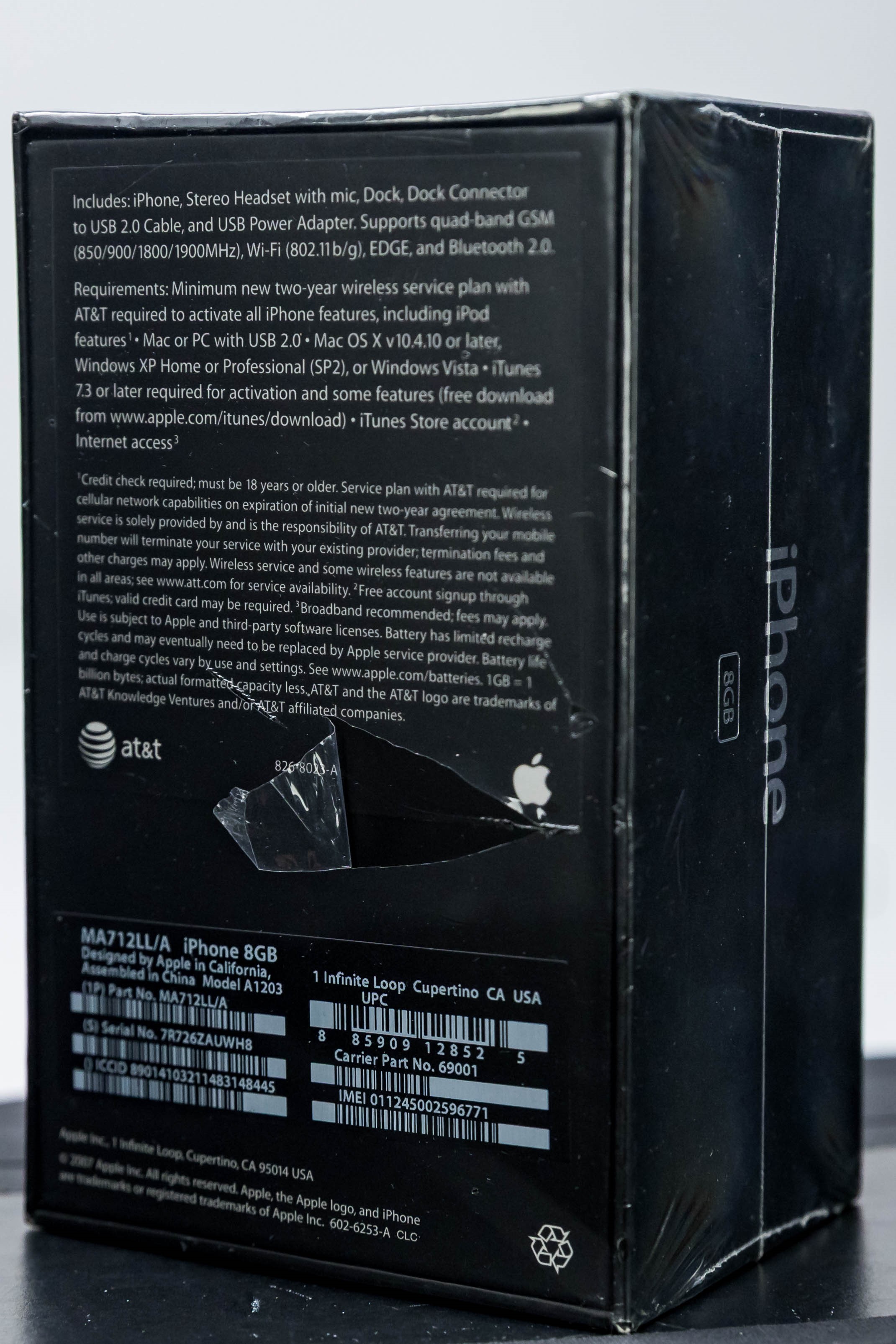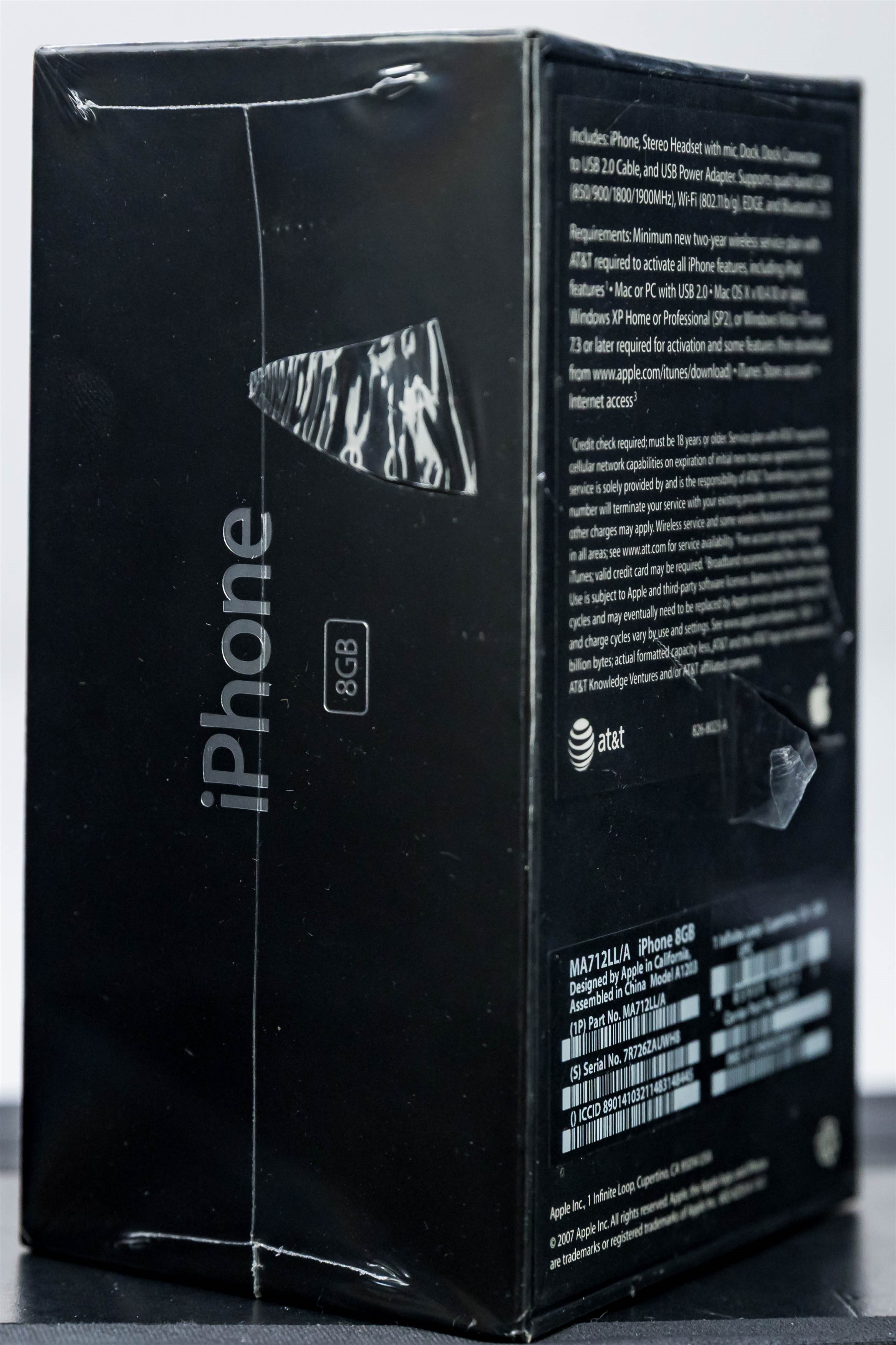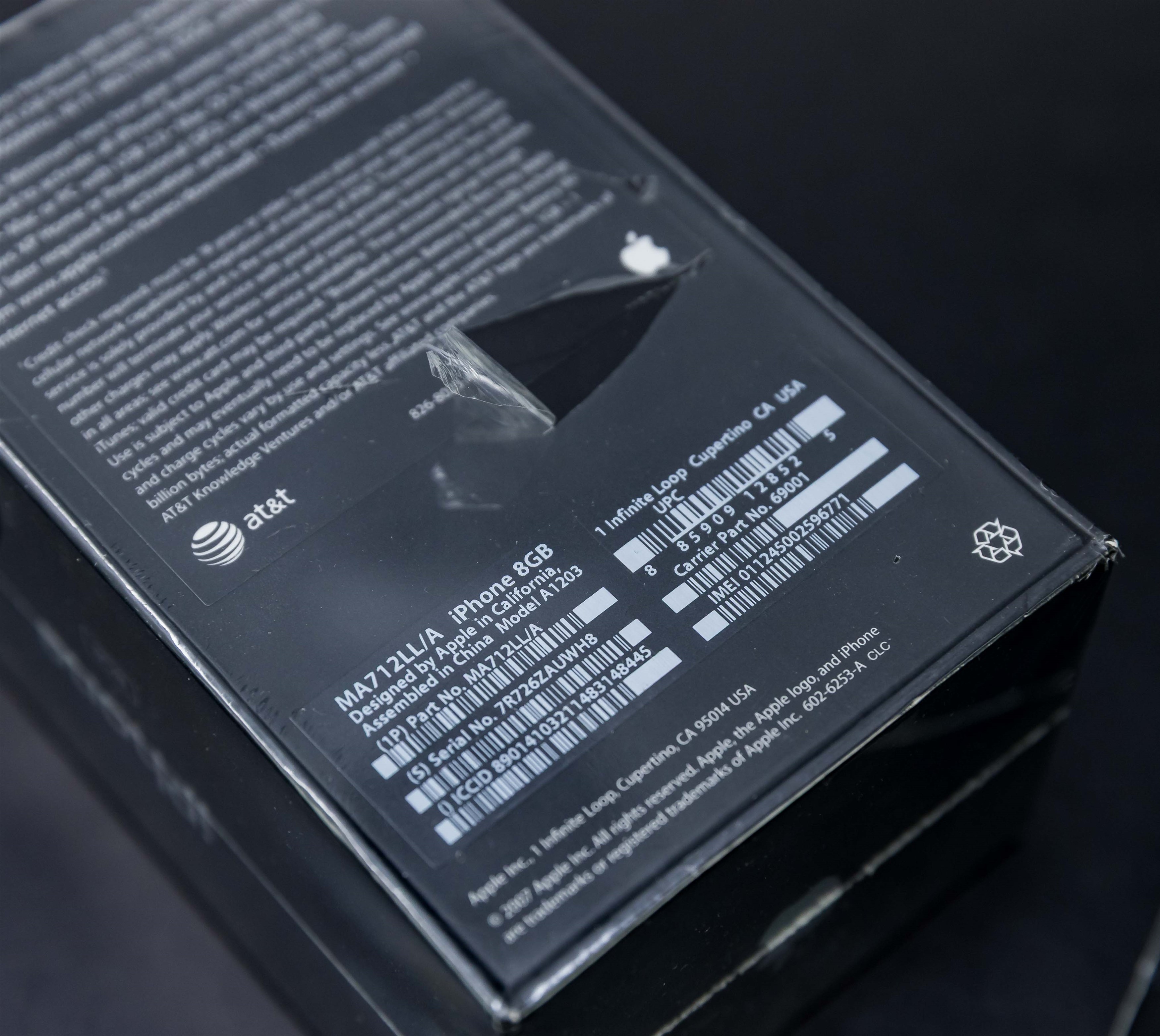 This factory sealed, first-release example is in excellent overall condition. Box is virtually flawless along the surface and edges, the factory seal is clean with little to no surface wear and complete with correct seam details and tightness. Please note, there is a tear to the seal on the side panel and to the back panel – see photos. Labels on the reverse are correctly pristine beneath the seal.  Brand new, never activated. Relevance, rarity, and provenance linked to the original visionary comprise a winning formula for this highly coveted collectible.  Model A1203, Order MA712LL/A (8GB)
