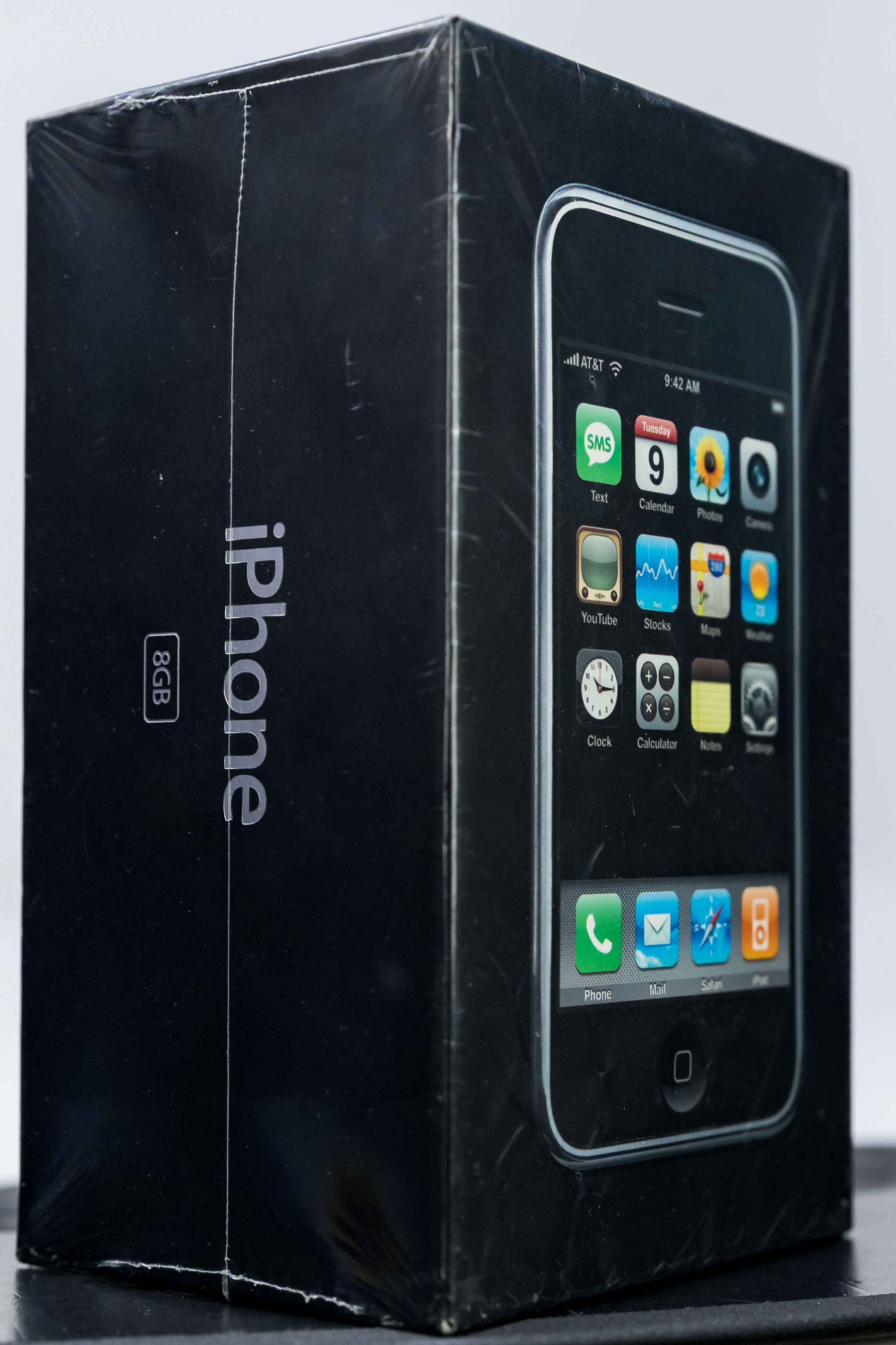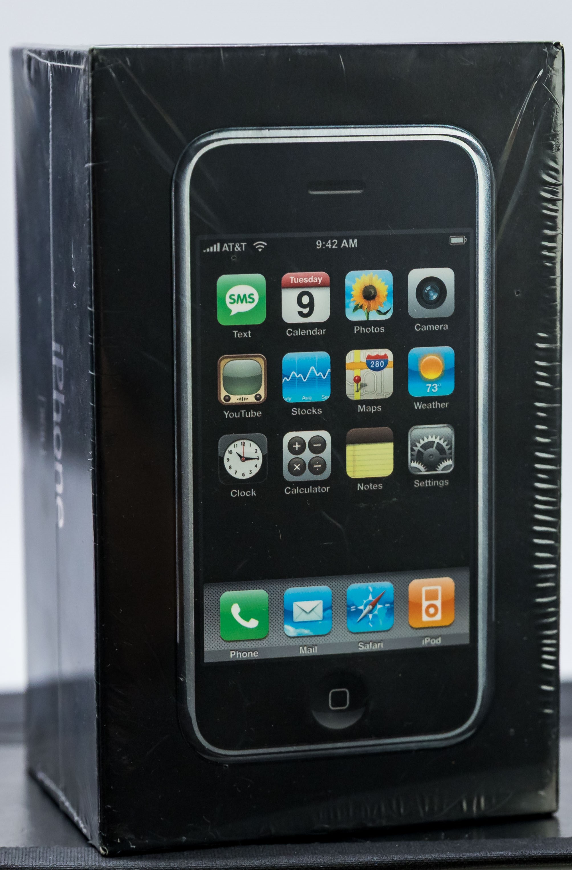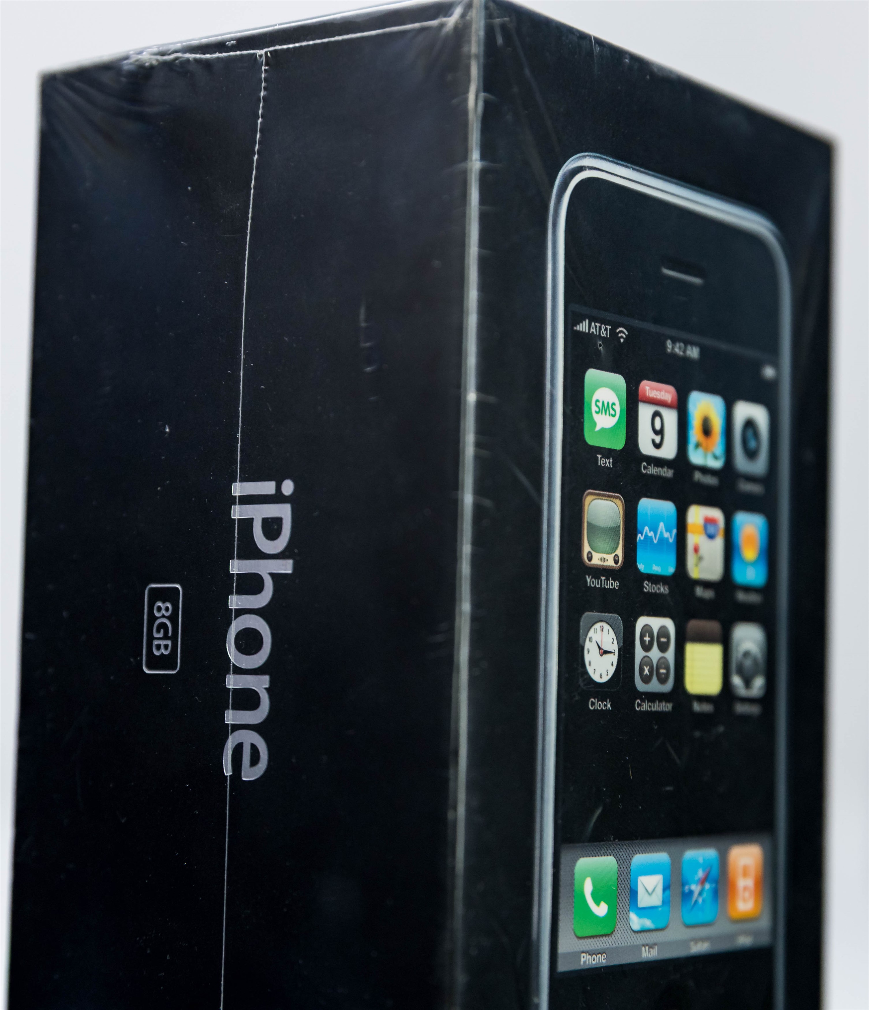 Highly desirable unopened first-release Apple iPhone from 2007. One of the most important and ubiquitous inventions of our lifetime, the iPhone was first introduced by Steve Jobs on January 9, 2007 at MacWorld San Francisco. Just over five months later it was released at retail for $499/$599 on June 29th. The original iPhone included 4/8 GB of storage, an innovative touchscreen, a 2-megapixel camera, and a web browser. The iconic box featured a life-size image of the iPhone with 12 icons on the screen. It quickly became Apple’s most successful product, forever changed the smartphone industry, and was named the Time Magazine Invention of the Year in 2007.