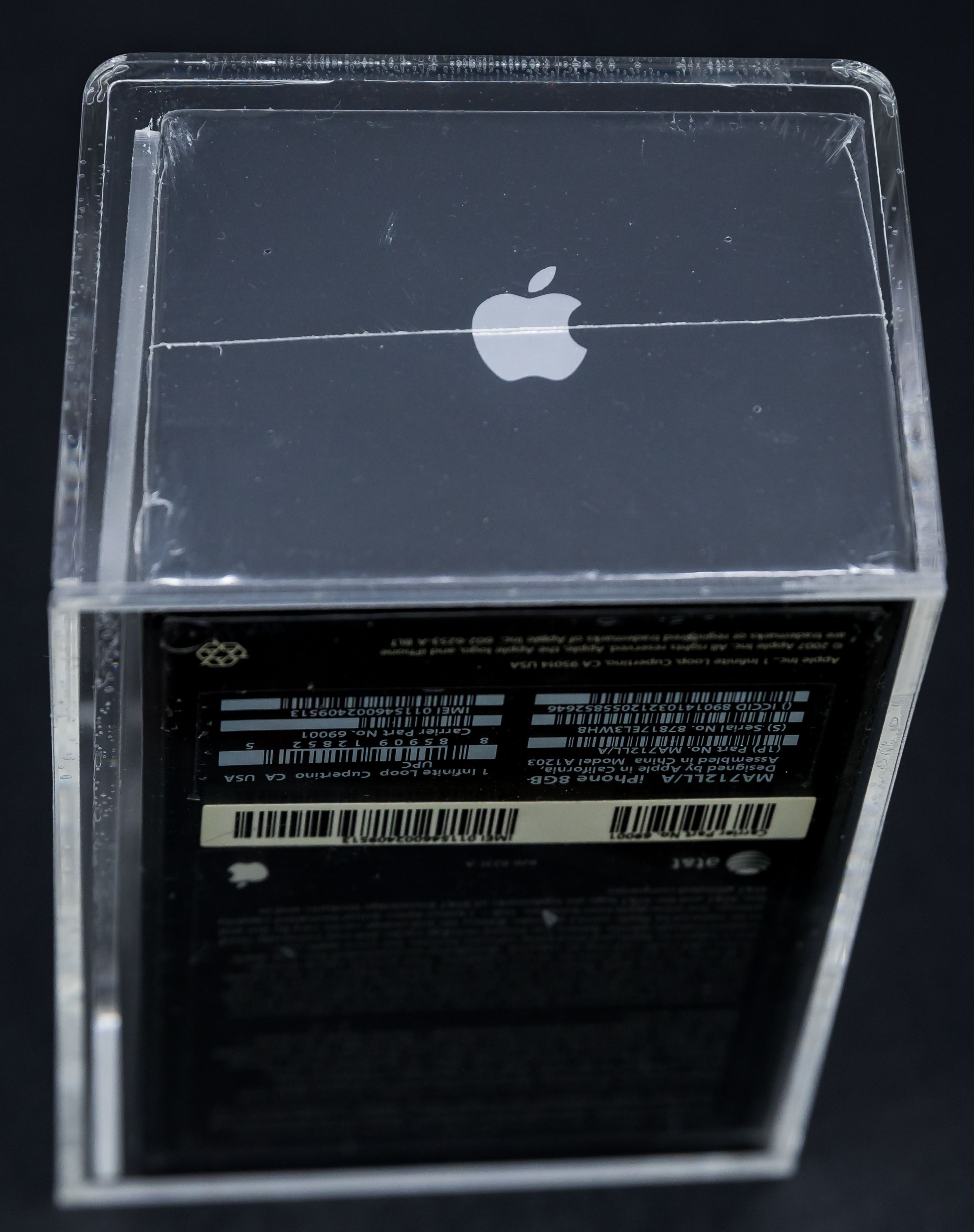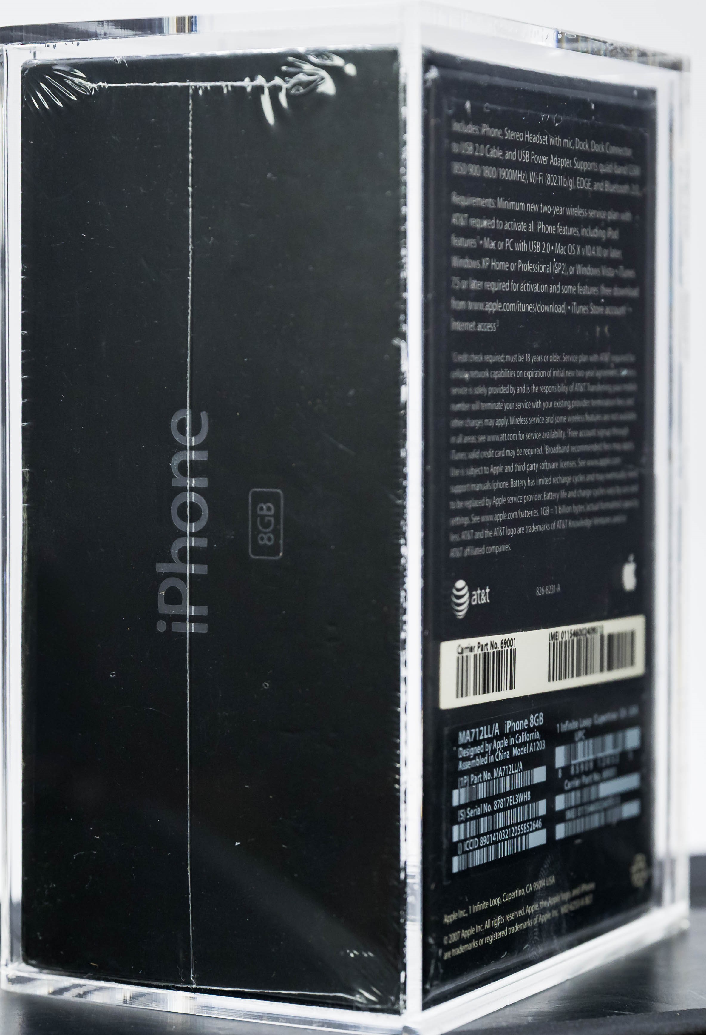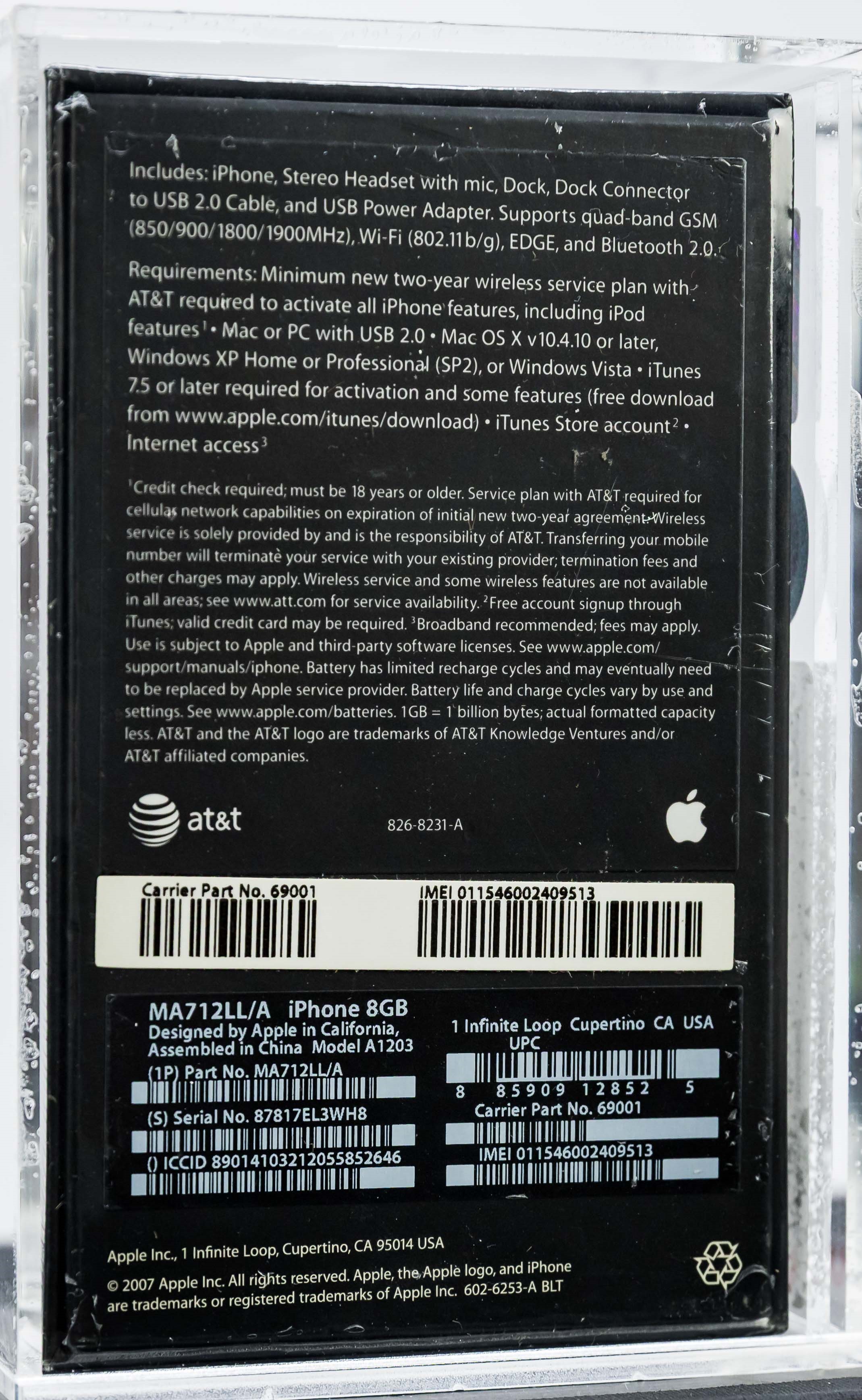 We are pleased to present an iconic factory sealed, first generation iPhone in outstanding condition. The iTunes icon was added to the front of the box in late 2007. White label that includes the Carrier Part No. and IMEI appears on the reverse. A tremendous opportunity for hobbyists looking to add a genuine factory sealed first generation iPhone to their collection. Model A1203, Order MA712LL/A (8GB)