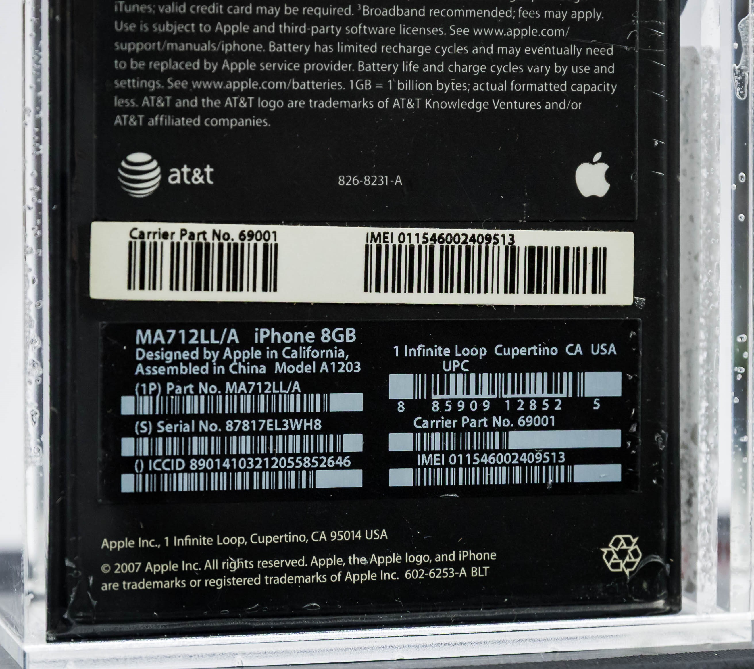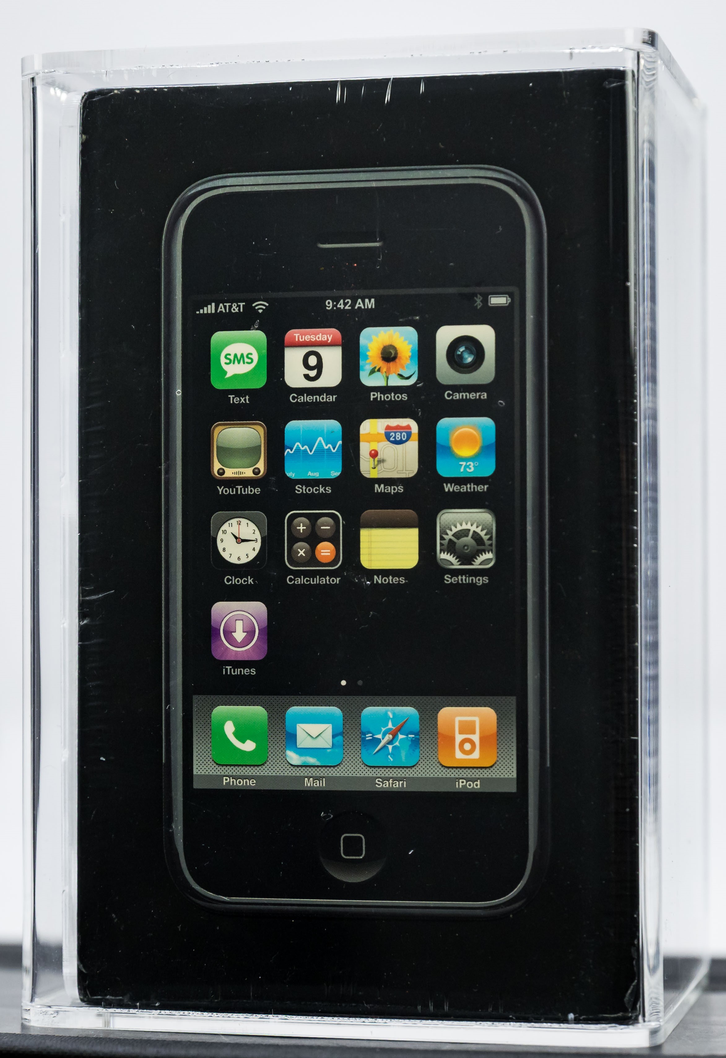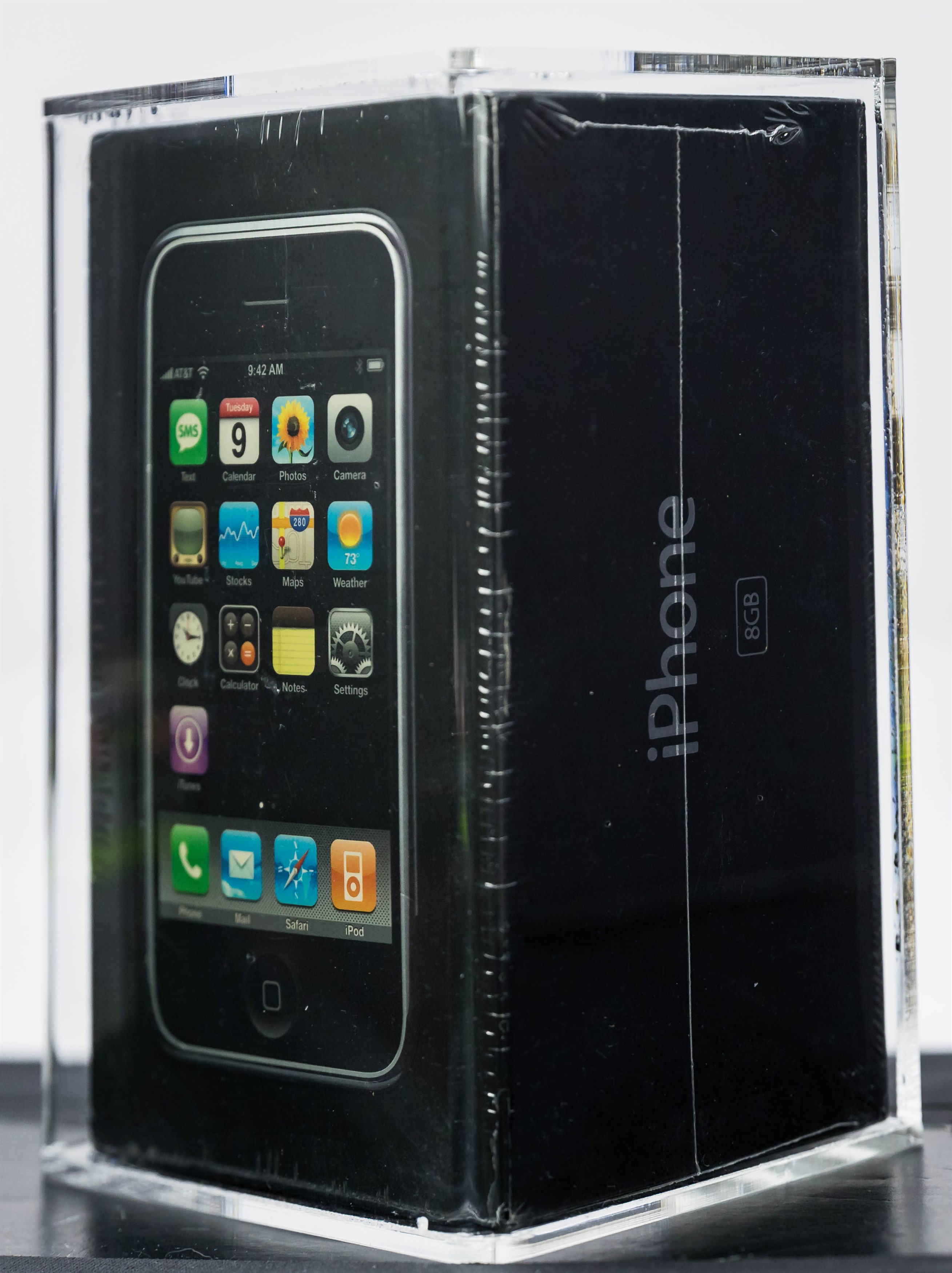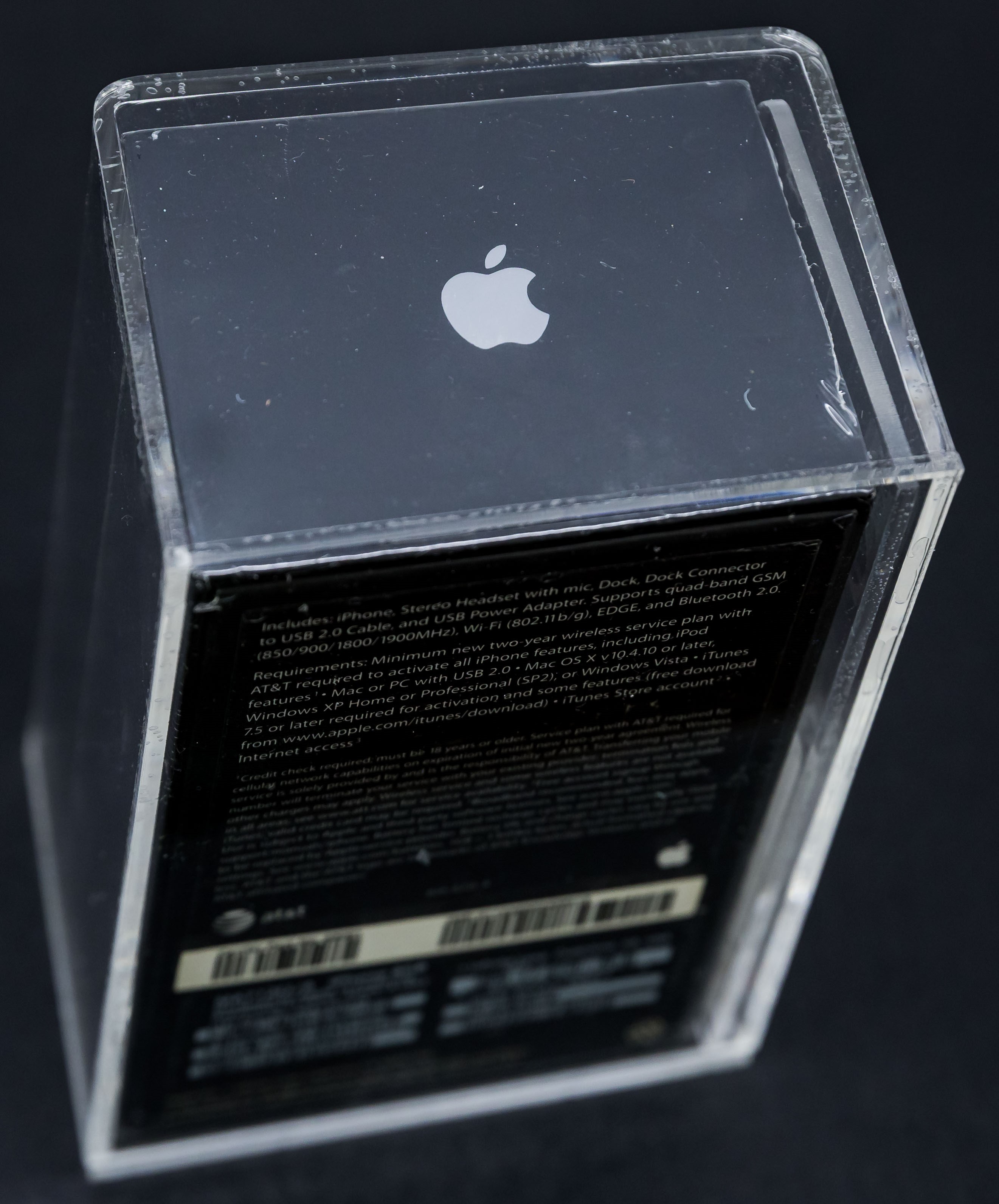 We are pleased to present an iconic factory sealed, first generation iPhone in outstanding condition. The iTunes icon was added to the front of the box in late 2007. White label that includes the Carrier Part No. and IMEI appears on the reverse. A tremendous opportunity for hobbyists looking to add a genuine factory sealed first generation iPhone to their collection. Model A1203, Order MA712LL/A (8GB)