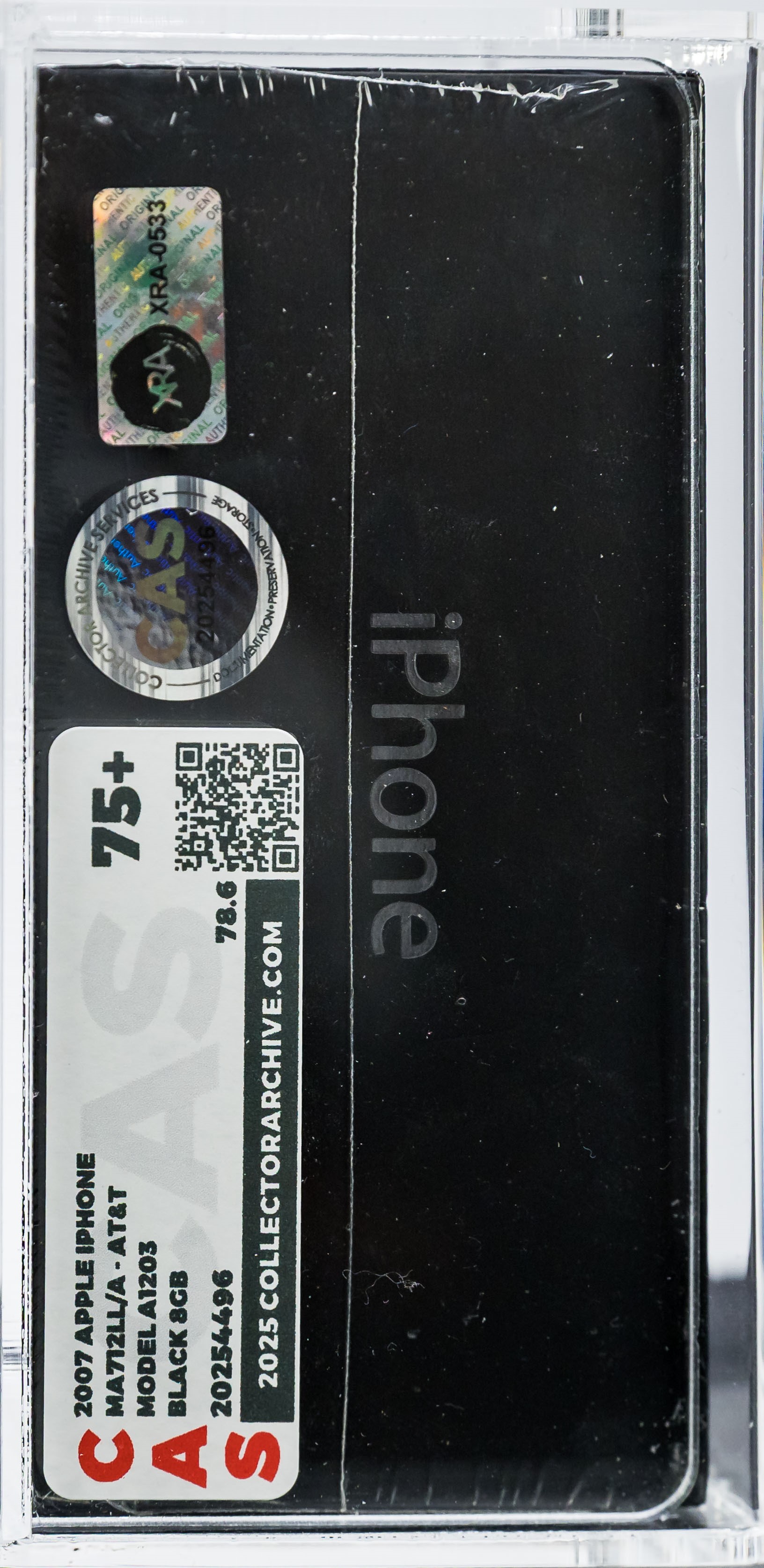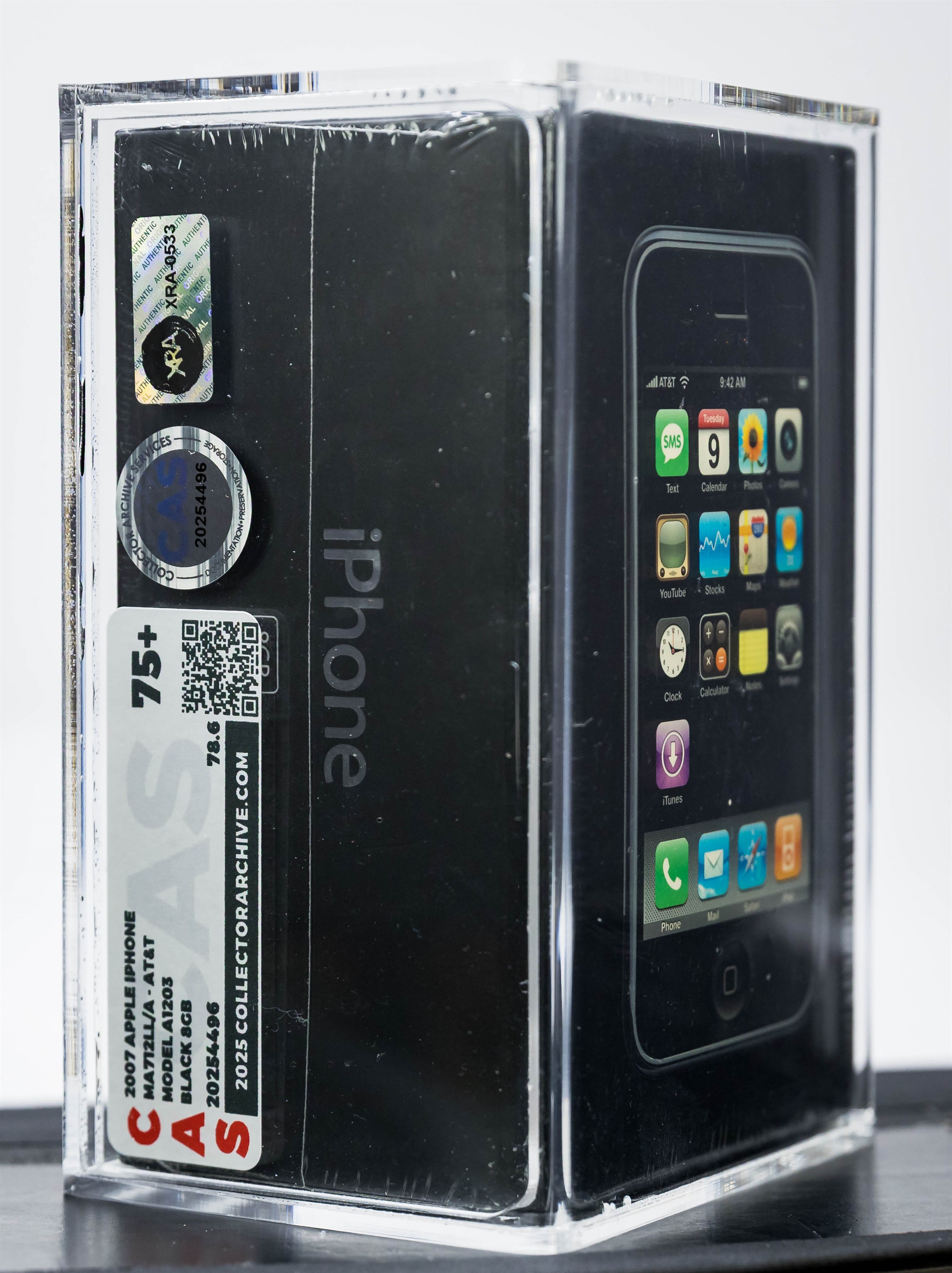 It was consigned to us directly by the original owner. Additionally, the phone was authenticated, graded, and encased in October 2025 by Collectible Grading Services (CAS) in partnership with X-Ray Authority (XRA), using state-of-the-art CT scanning technology. Authentication labels from both CAS and XRA are affixed to the acrylic casing. COA’s from both companies are included as well.