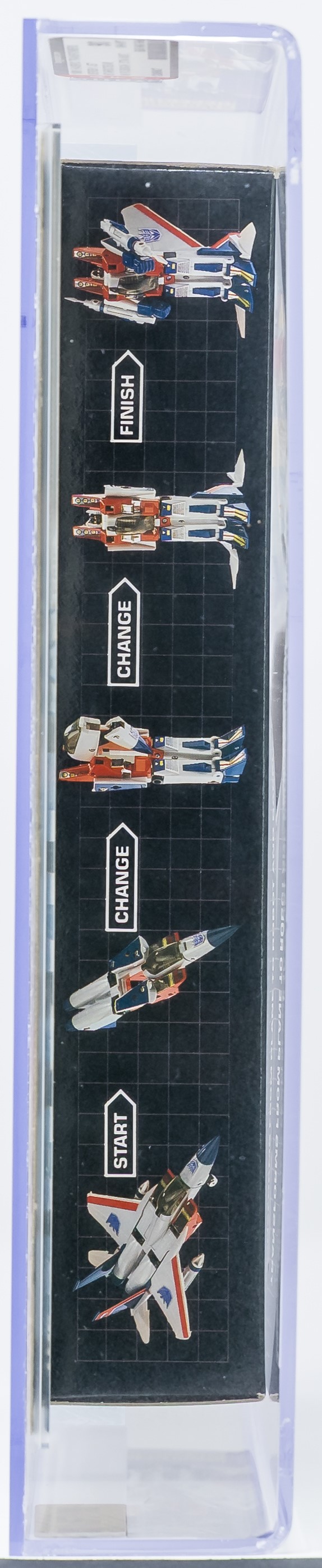 Starscream along with Optimus Prime, Megatron, Soundwave, Grimlock, Bumblebee, and Shockwave are considered the most popular G1 pieces. As many collectors have learned the hard way, when the opportunity presents to land the highest graded example, it should not be taken lightly! Our example is simply fantastic. The box is virtually flawless with only the most minor of imperfections. Exceptional color throughout! Each end is firmly factory tape sealed with no color break along either of the front edges. Window is crystal clear as is the bubble within that holds the jet in place. The clear bubble is firmly attached to the cardboard backing. The Starscream jet itself is in pristine condition. As nice of an example as there is in existence, when the dust settles on November 9th, we expect this G1 trophy piece to be locked away for a long, long time.