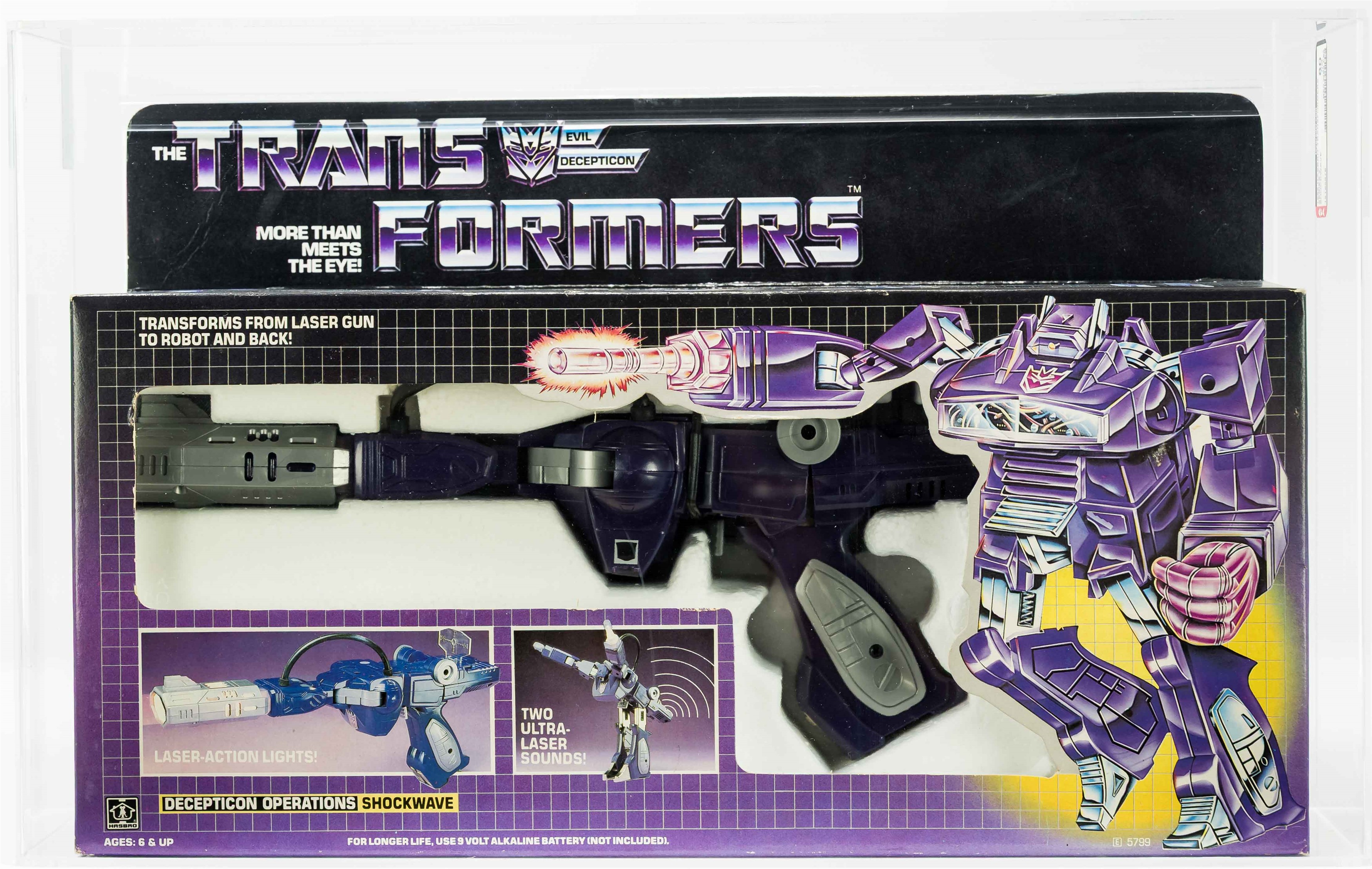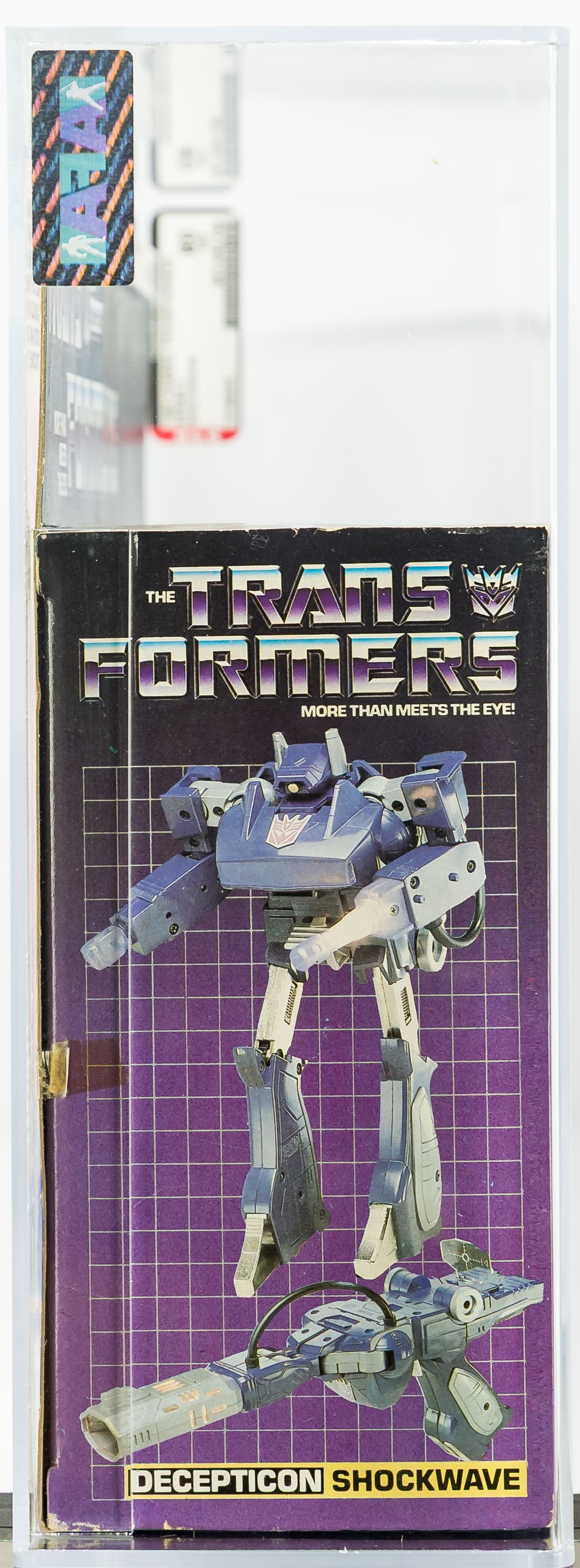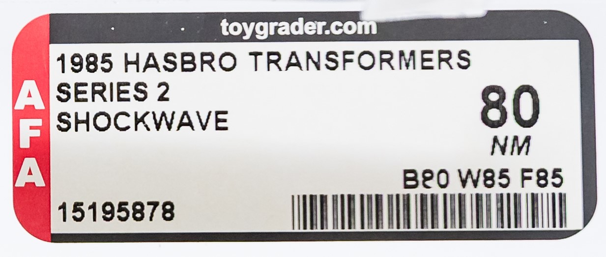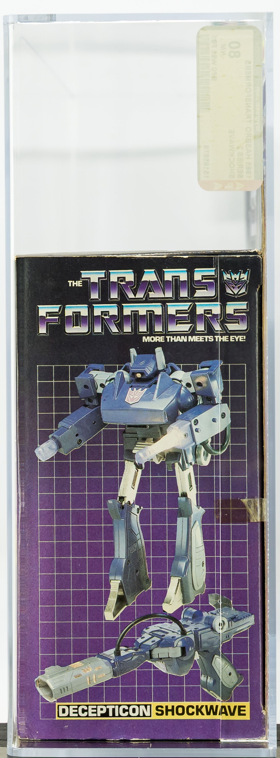 Highly coveted MISB Shockwave from Series 2 in 1985. One of the most elusive factory sealed Transformers in the G1 line. High grade examples of 80 and higher rarely come to market. In fact, not a single factory sealed example graded 80 or higher has hit the auction block. We combed through the auction archives and the highest graded example we found was an AFA 75+ (no rubsign) that realized $14,278 in March of 2025.