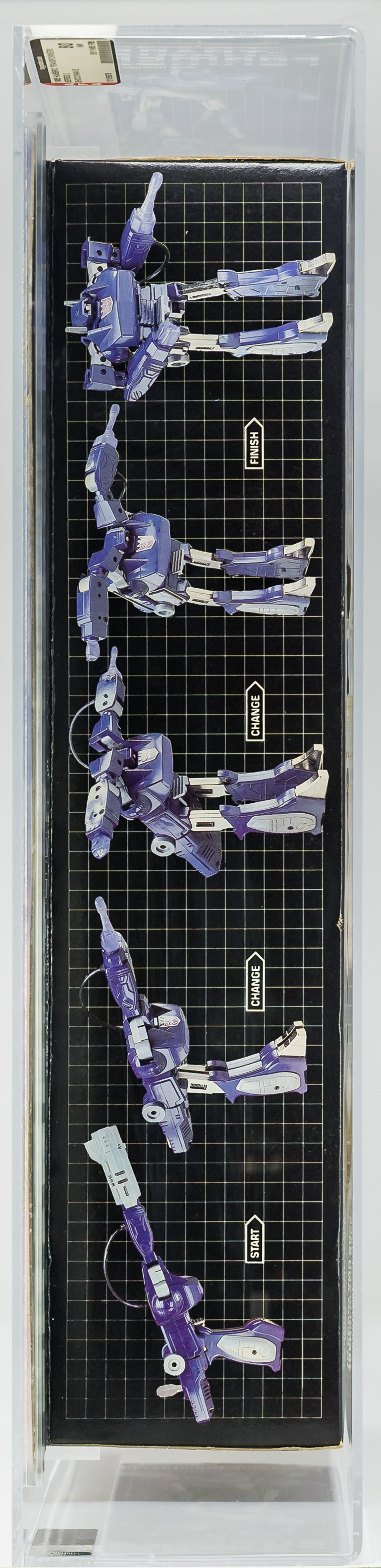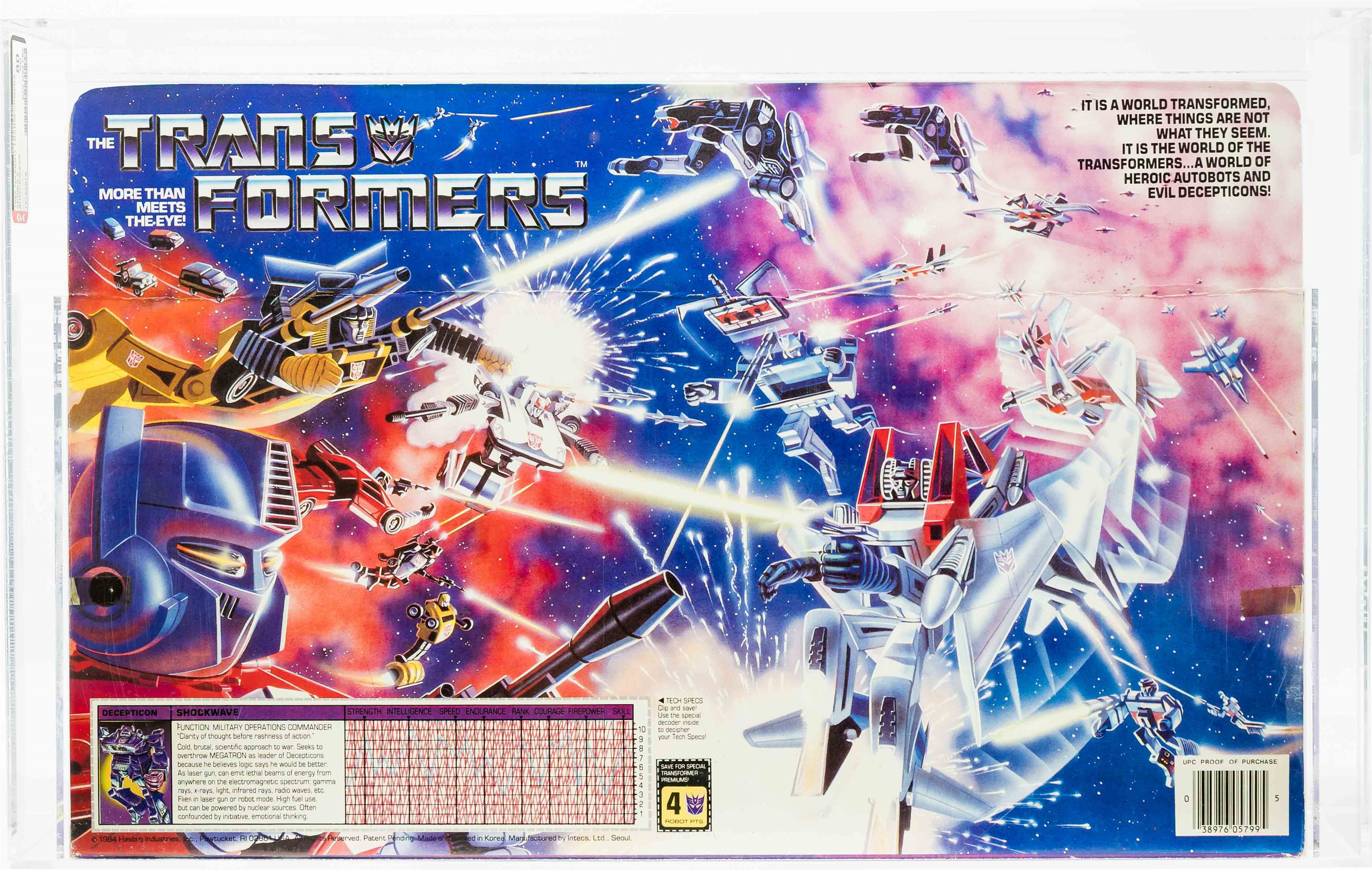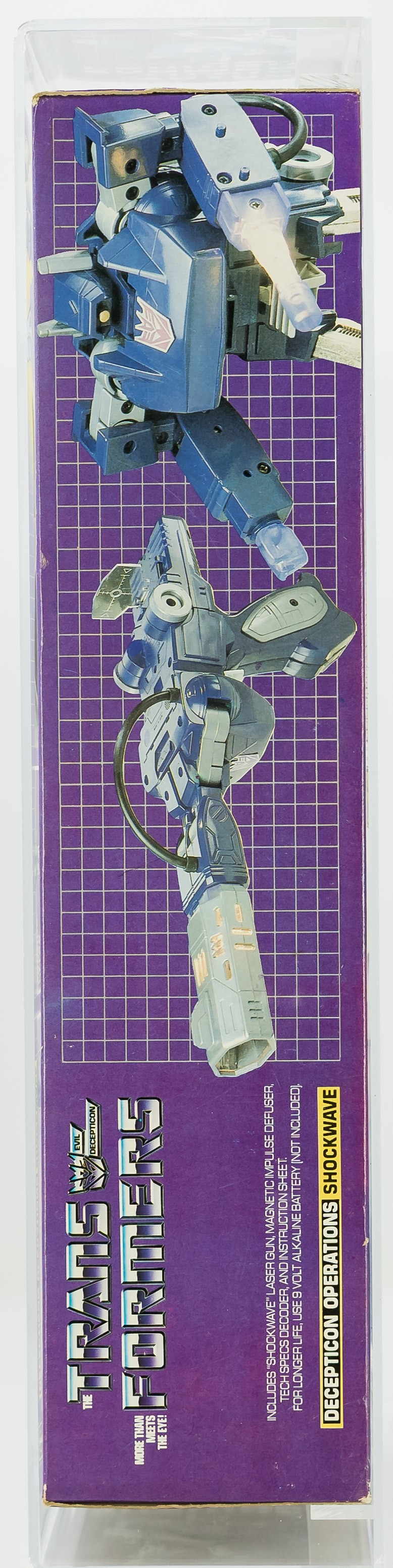 Highly coveted MISB Shockwave from Series 2 in 1985. One of the most elusive factory sealed Transformers in the G1 line. High grade examples of 80 and higher rarely come to market. In fact, not a single factory sealed example graded 80 or higher has hit the auction block. We combed through the auction archives and the highest graded example we found was an AFA 75+ (no rubsign) that realized $14,278 in March of 2025.