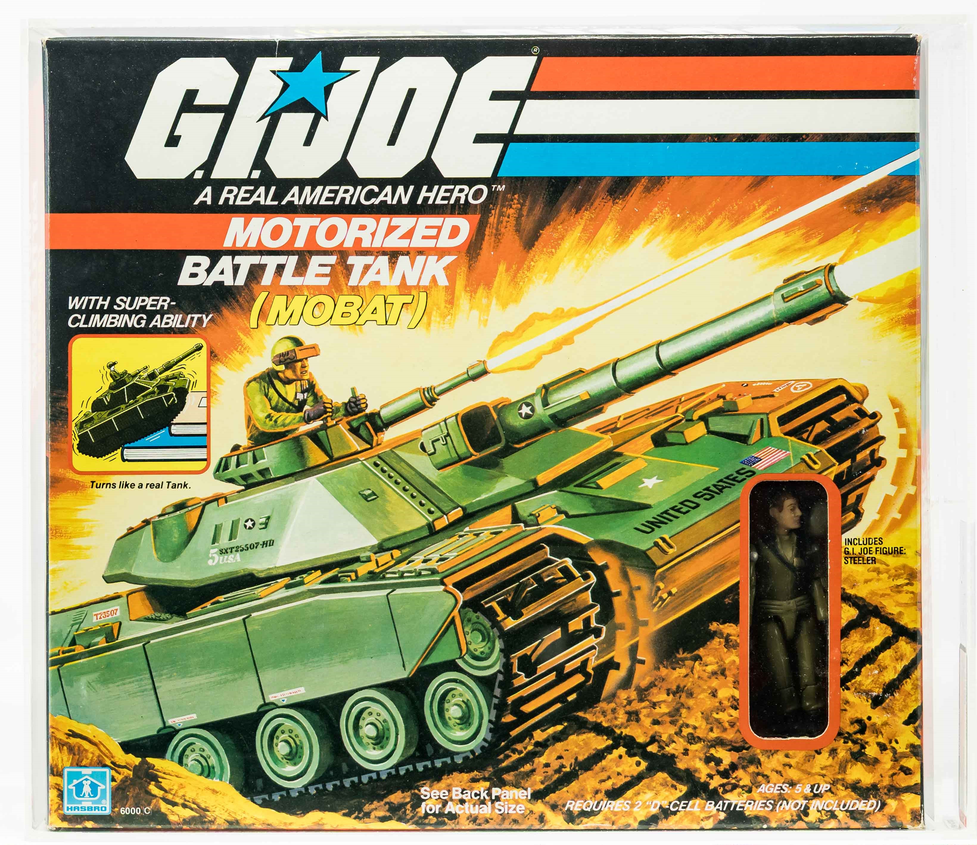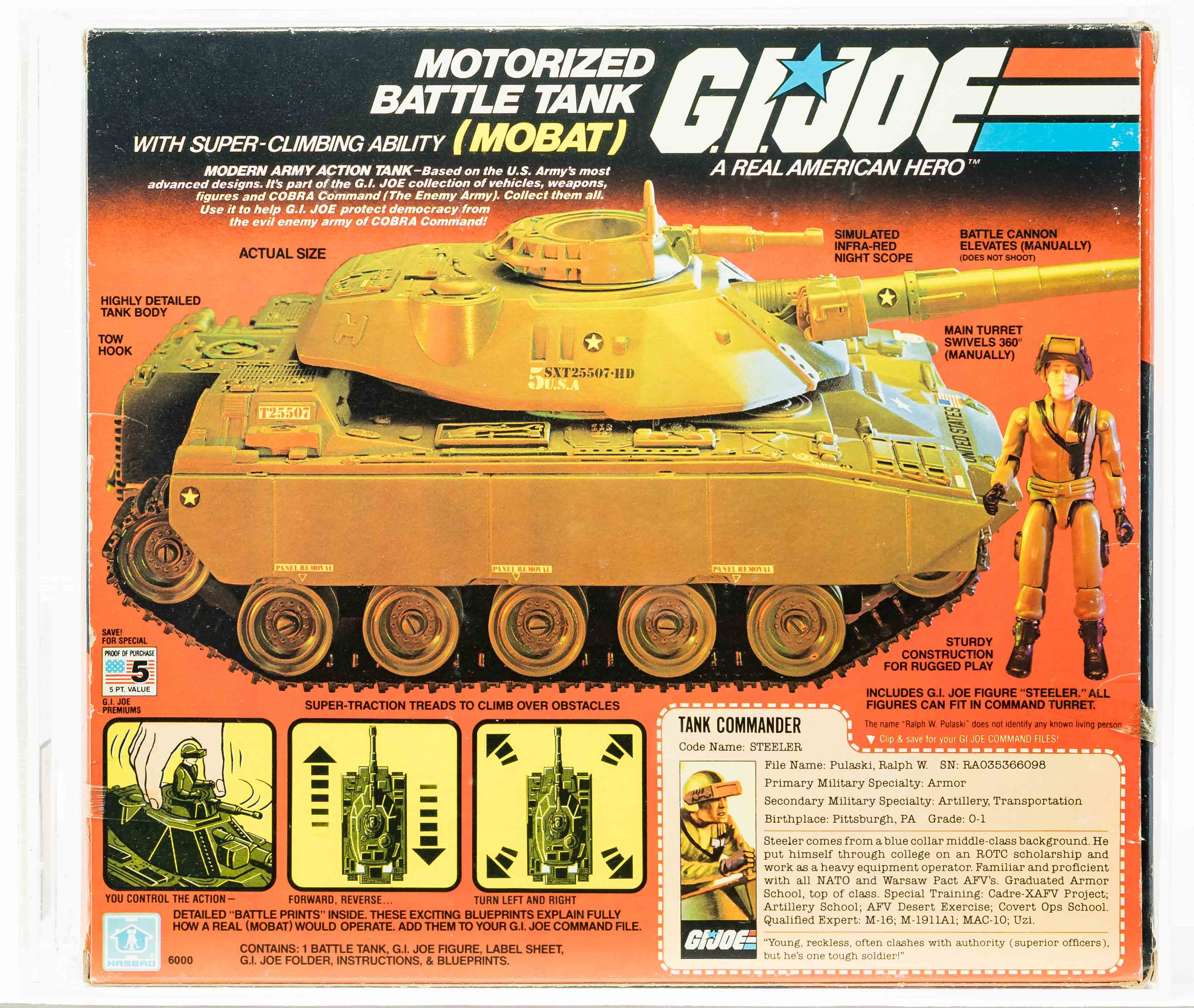 Widely considered the first great G.I. Joe vehicle released as part of Hasbro’s A Real American Hero line, we are pleased to present the best AFA graded example in existence. The first-release MOBAT includes the straight-arm version of Steeler (not swivel-arm). It’s exceedingly rare – AFA has only graded two factory sealed examples in their 25-year history (the other is an AFA 80 example). Our MISB example is superb showcasing outstanding color on all panels with few imperfections. Each end is firmly factory tape sealed. Display window is clear and Steeler exhibited no movement in the legs or waist when tested. Awesome piece, a true classic in the ARAH toyline.