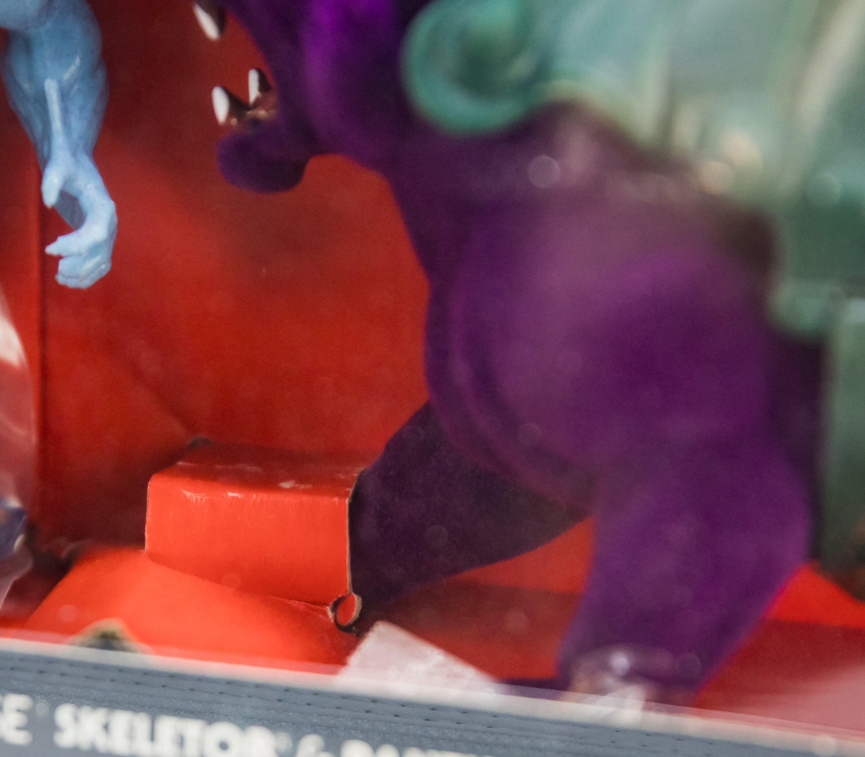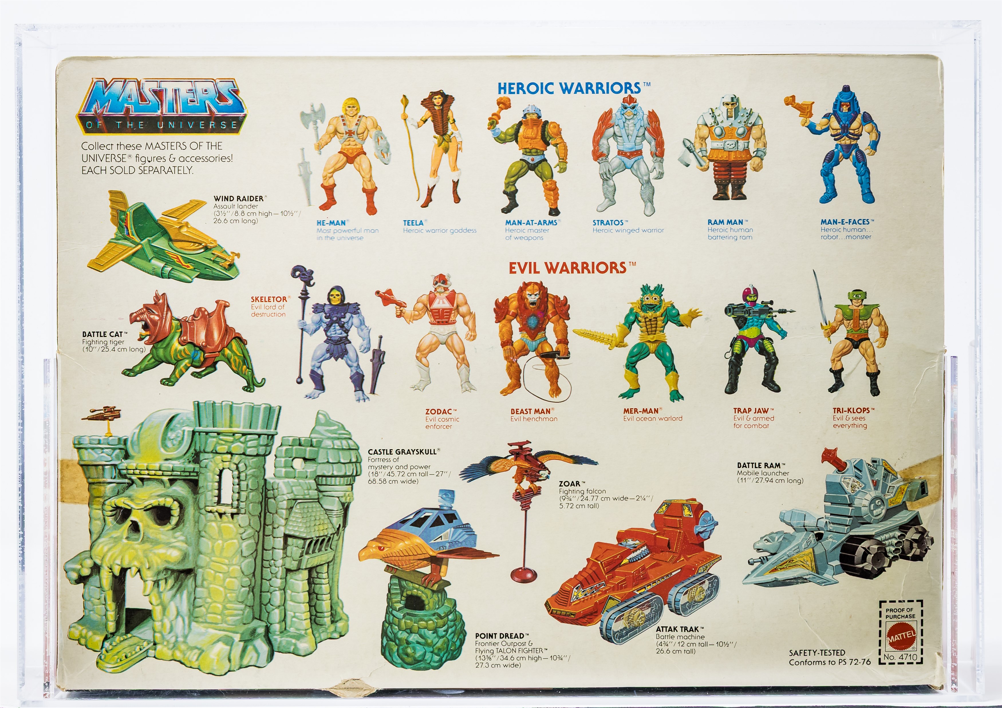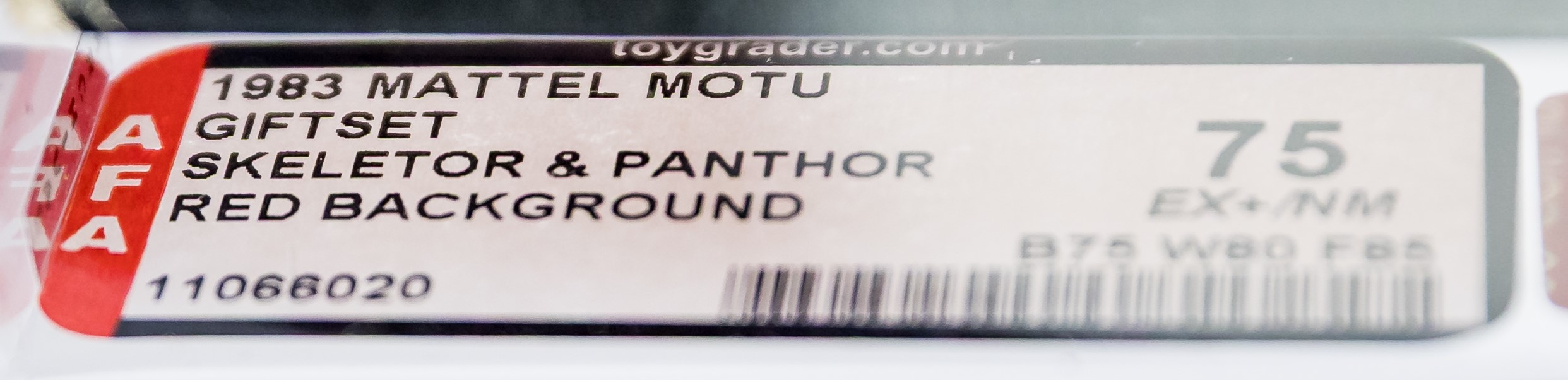 Rare and desirable MISB Skeletor & Panthor giftset with red backdrop released in 1983. Not to be confused with the much more common Battle Armor Skeletor & Panthor pairing, this is the earlier release that includes the original version of Skeletor. Recently graded in January of 2024, this giftset does not disappoint. The box showcases classic artwork depicting He-Man and Skeletor in battle. Box exhibits imperfections throughout – see photos. Box color looks good – no fading. No flap crease on the reverse and only light toning. Each end is factory sealed and there is no colorbreak whatsoever along either of the front edges. Display window was graded clear but it looks to be either very lightly tinted or a slightly cloudy when viewed against a white background. The 80 subgrade is a result of several stress marks found on the top panel of the window. Within the window is Skeletor and Panthor. It appears some of Panthors fur/flock has attached to the Skeletor figure (see photo). Panthor is in mint condition. Please note there is a loose piece of tape at the base. It’s important to note that Skeletor is firmly tied around the waist and both front and back feet of Panthor are also secured. A very iconic giftset that rarely surfaces for sale – this is only the second time we have offered it in our auctions. Encapsulated by AFA 75, (75-80-85) #11066020