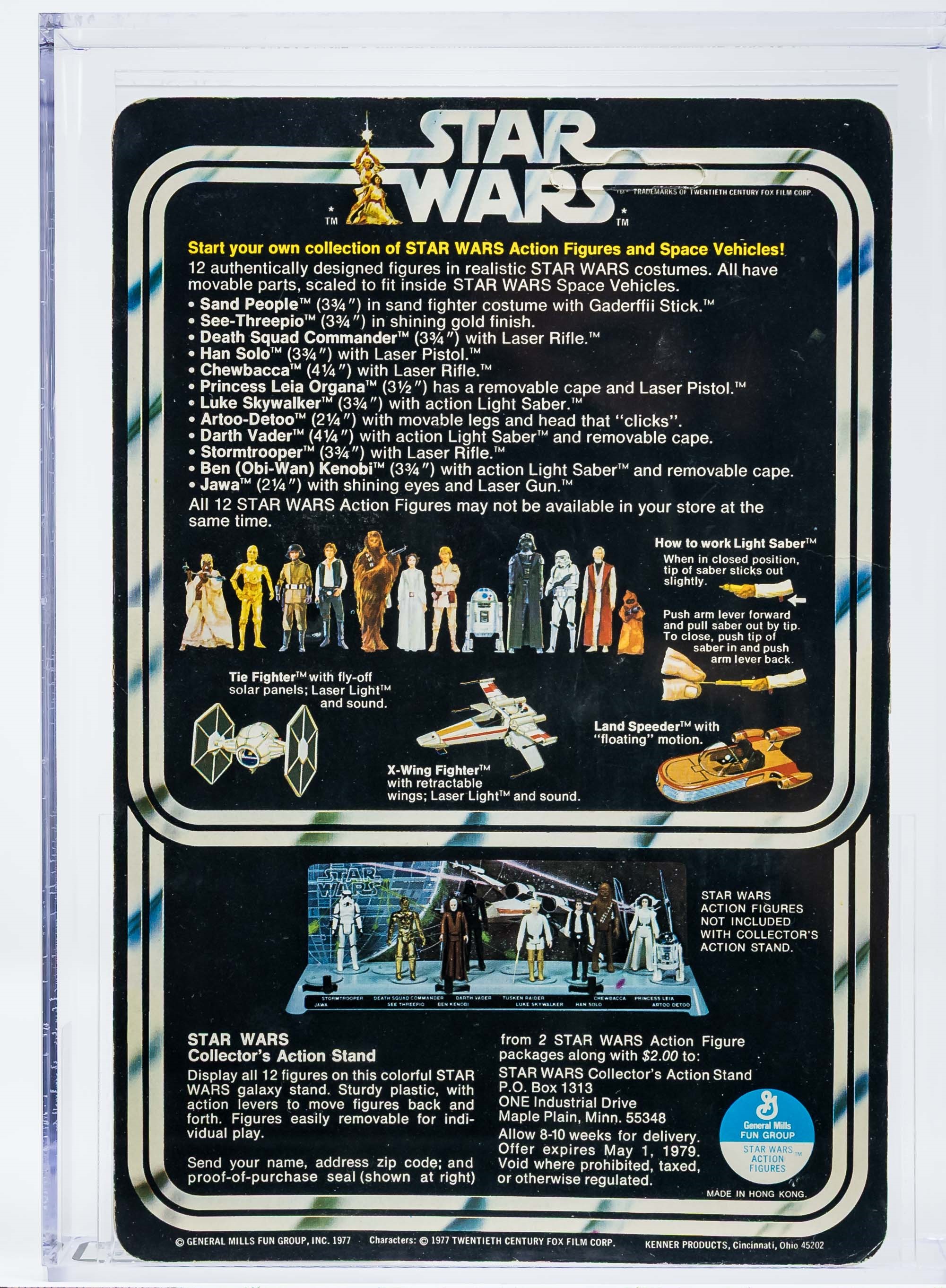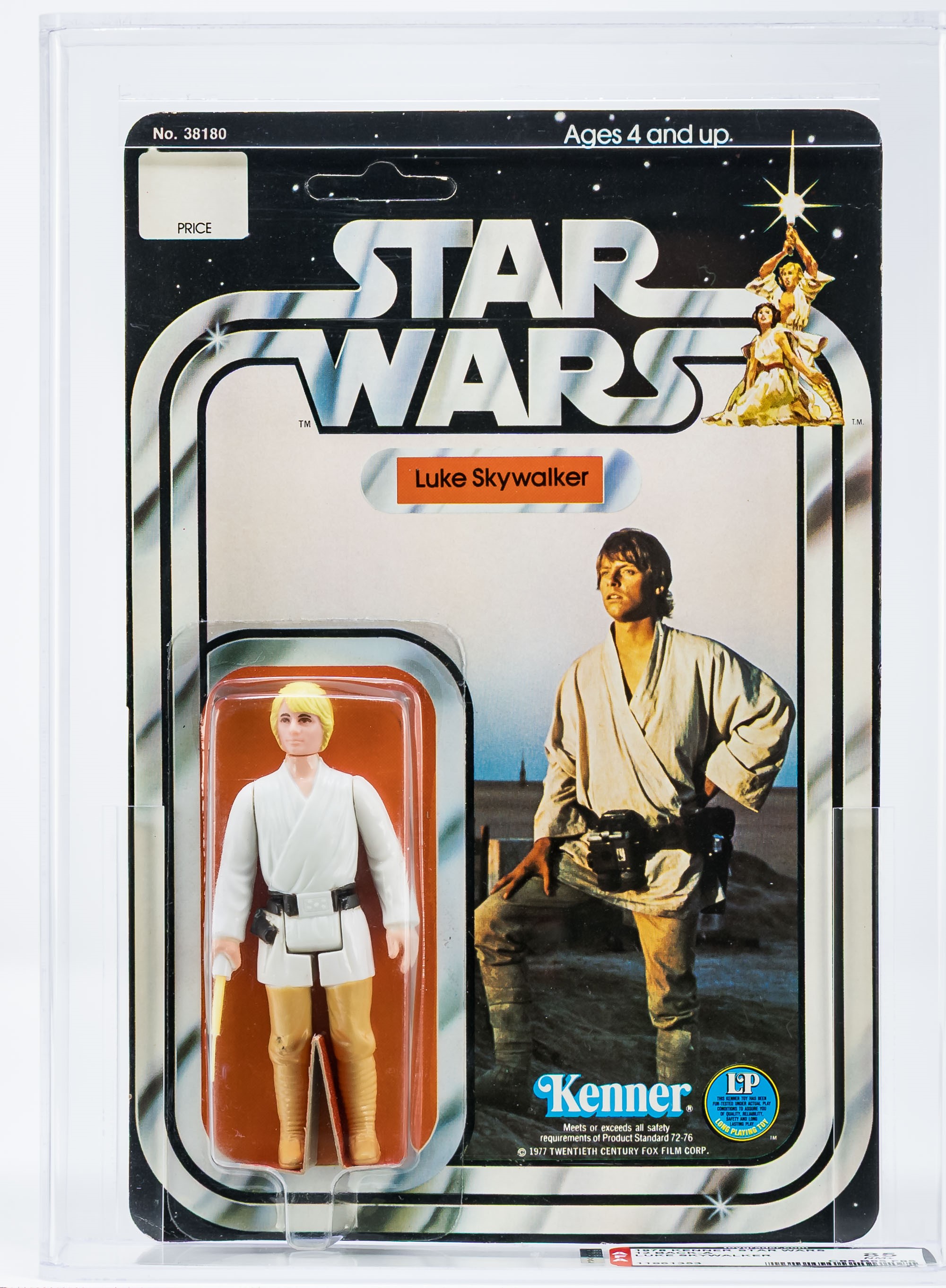 High-grade Luke Skywalker 12 Back released by Kenner in 1978. Gorgeous example on early 12 Back-A card. Our consignor upgraded this release three times before finally finding this particular example. It is being made available only because he acquired a rare (and very expensive!) double-telescoping example for his collection.