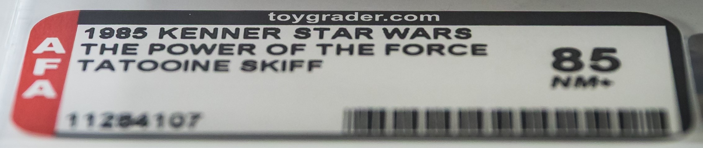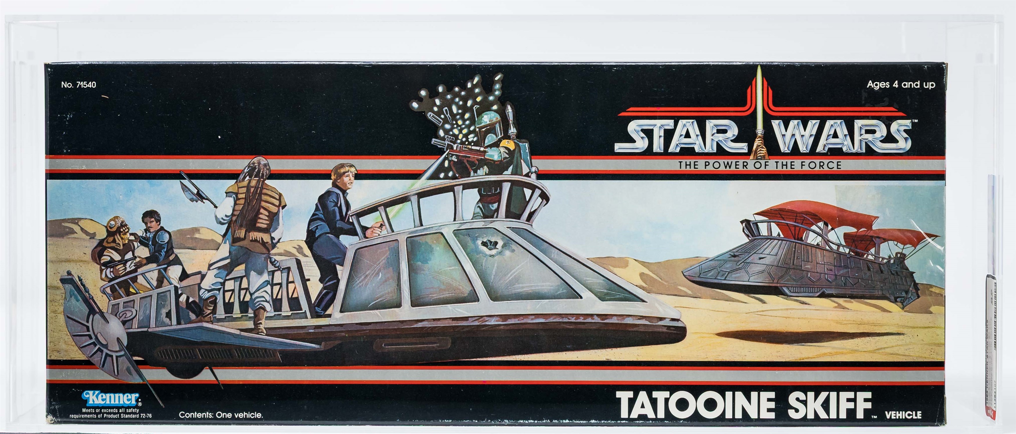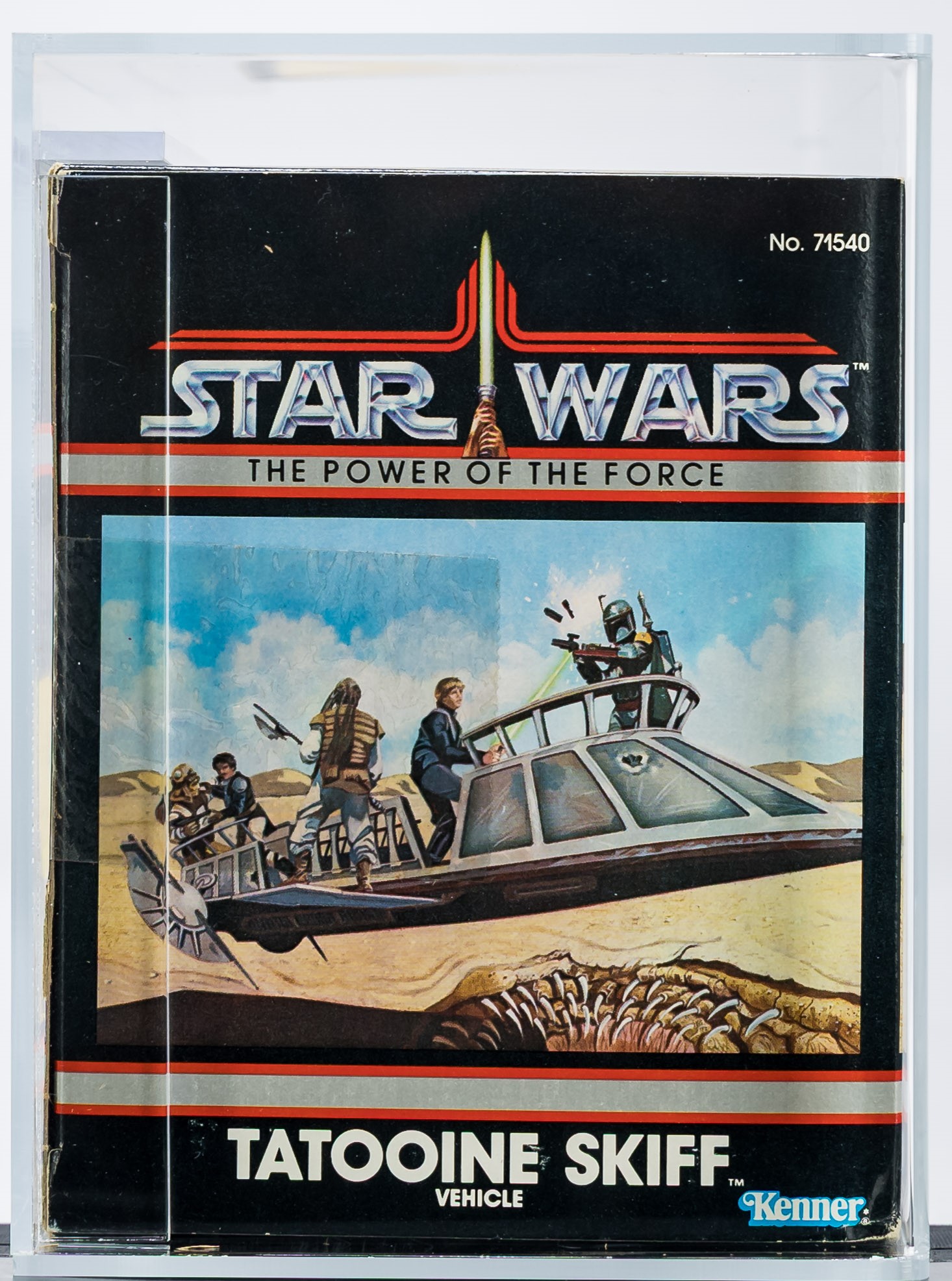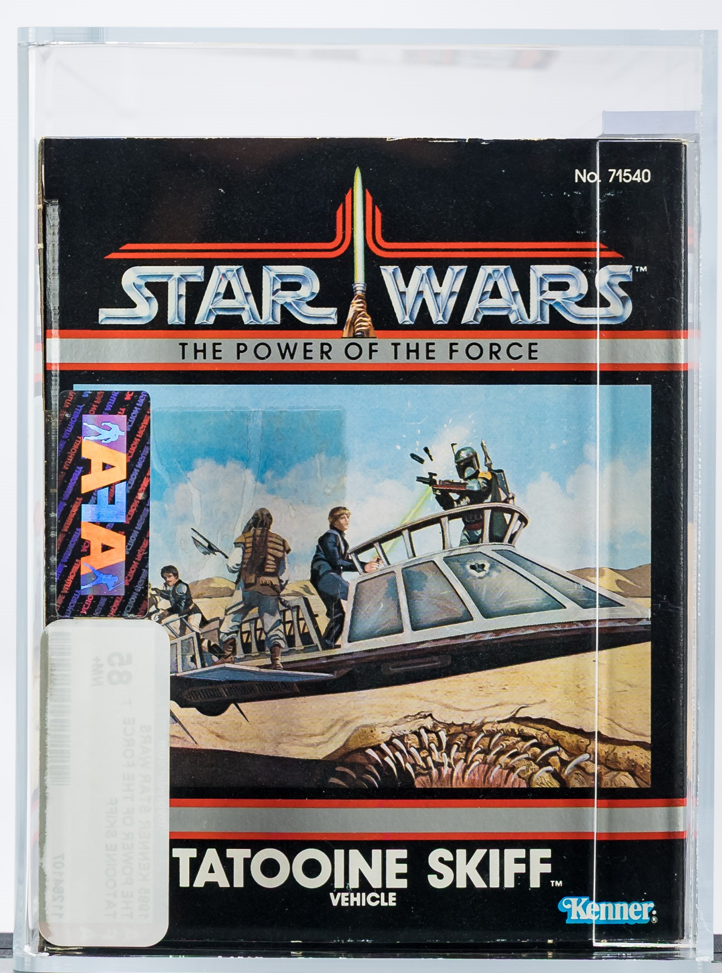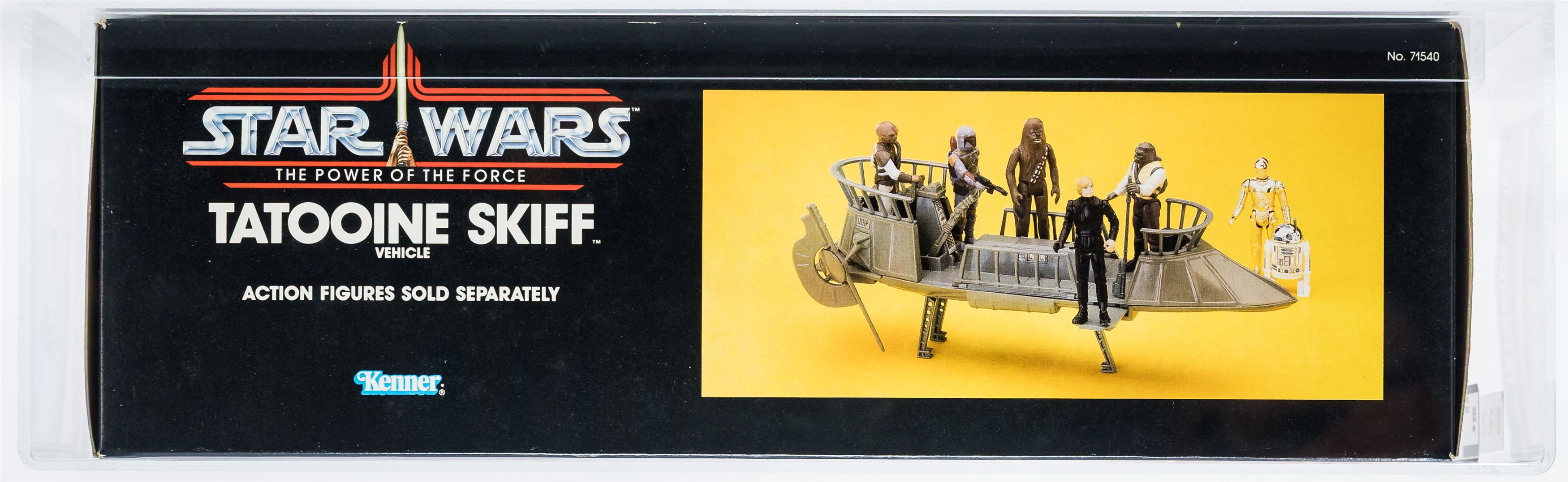 Gorgeous MISB Tatooine Skiff in elite grade. Released in 1985 as part of Kenner’s popular Power of the Force line. This one is seldom seen at the AFA 85 grade level. In fact, it has been four years since an AFA 85 example has hit the auction block. We are pleased to announce the wait is finally over!