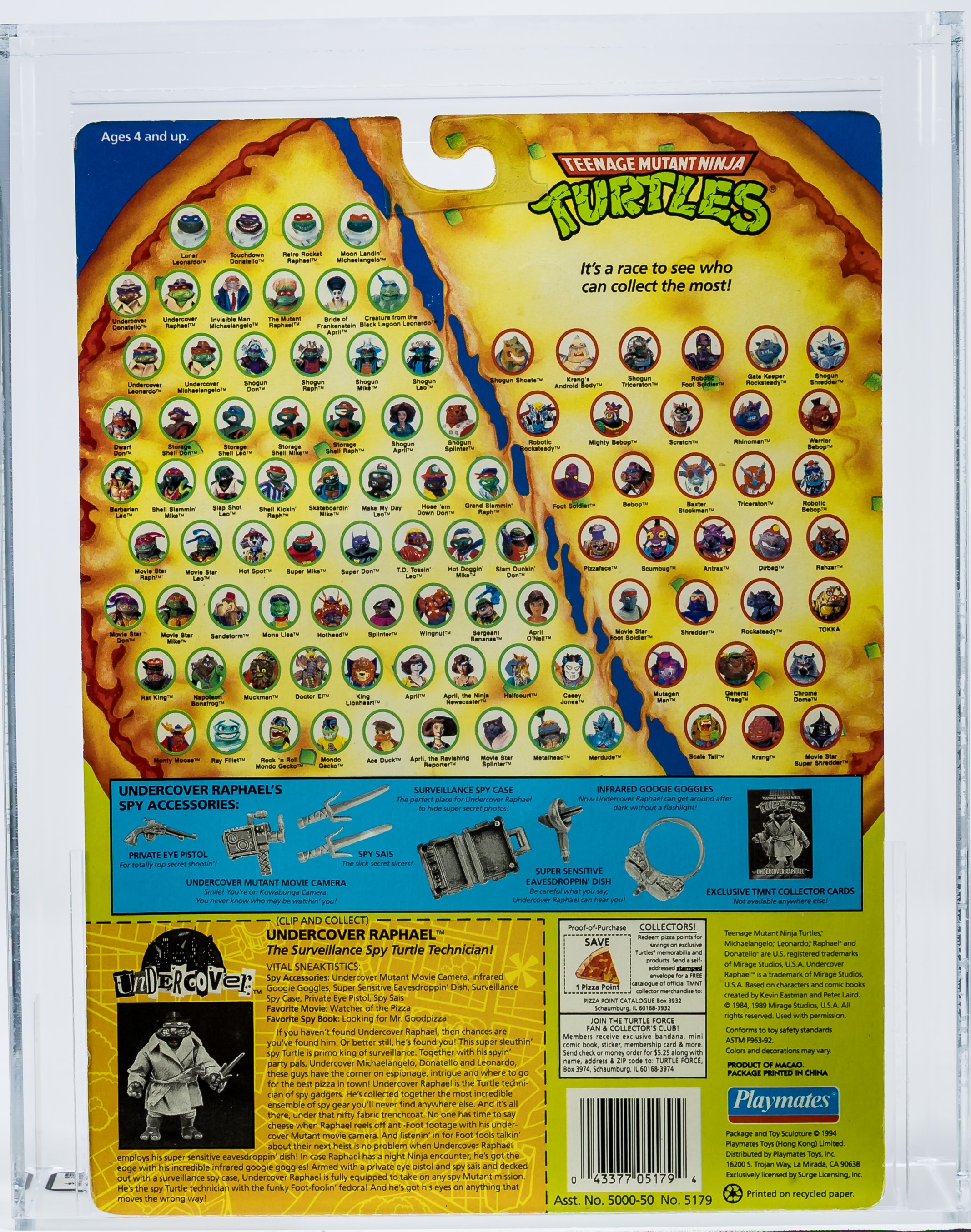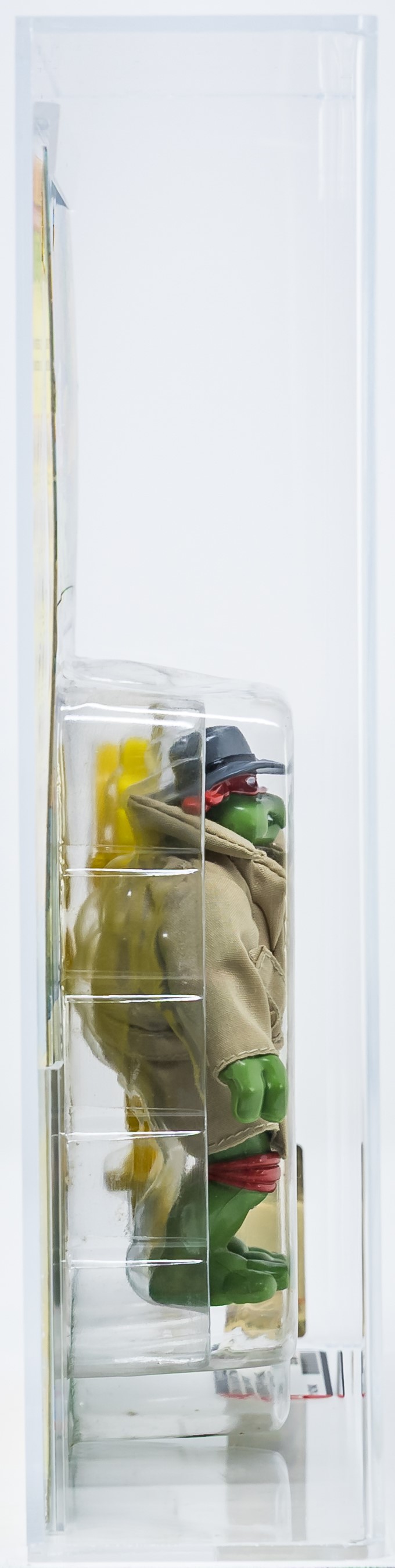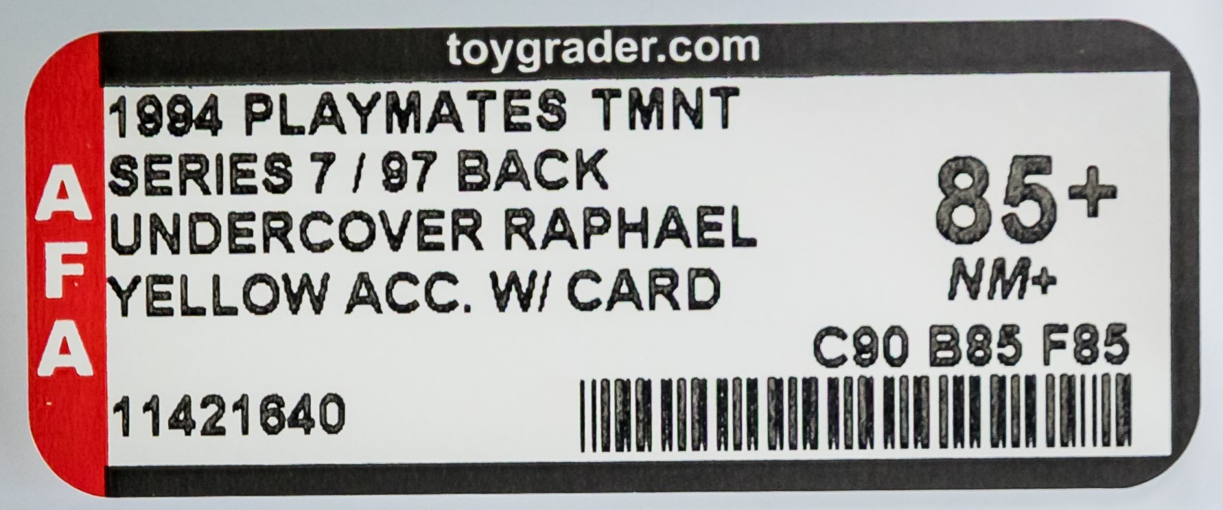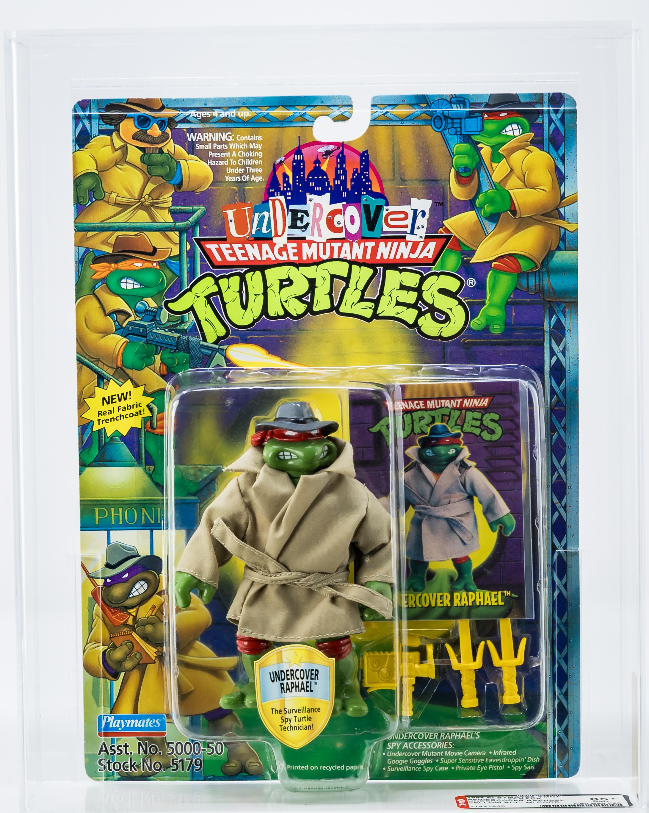 One of the most desirable (and valuable!) releases in Playmates iconic TMNT toyline are the 1994 Undercover TMNTs. We are pleased to present the single highest graded Undercover Raphael in existence. A showstopper of an example, with subgrades of 90-85-85. Pristine card, as good as it gets, complete with perfect color front and back. No creases or veins front and back. No price tag sticker or residue/outline. Bubble is clear and retains perfect form. Please note there is a bit of surface spotting. Mint condition Undercover Raphael action figure looks great within. Please note, that although all four turtles were released as Undercover, Raph is considered the icon. He was the one that initially went undercover in the blockbuster 1990 TMNT movie. This is the first time this piece has hit the auction block. It rare for the highest graded example to hit the open market and, as such, we expect great action before the hammer goes down on November 9th. Encapsulated by AFA 85+, (90-85-85) #11421640