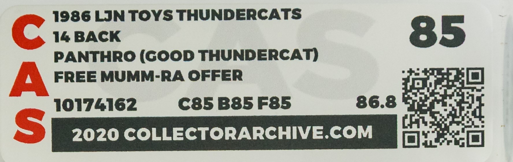 Ultra high-grade Panthro on 14-Back card from 1986. Keep in mind this is the desirable US release by LJN and is not the international version released in partnership with Rainbow Toys. Assigned a “triple 85”, our example is exceptional across all three categories – card, bubble, and figure. Card showcases great color front and back with few imperfections. Bubble and tray are both clear and free of yellowing. There is an imperfection in the upper corner of the tray within the bubble. Outside of that, the bubble and tray retain perfect form. The Panthro action figure within is in mint condition. Excellent example that’s rarely seen. Encapsulated by CAS (85, 85-85-85), #10174162