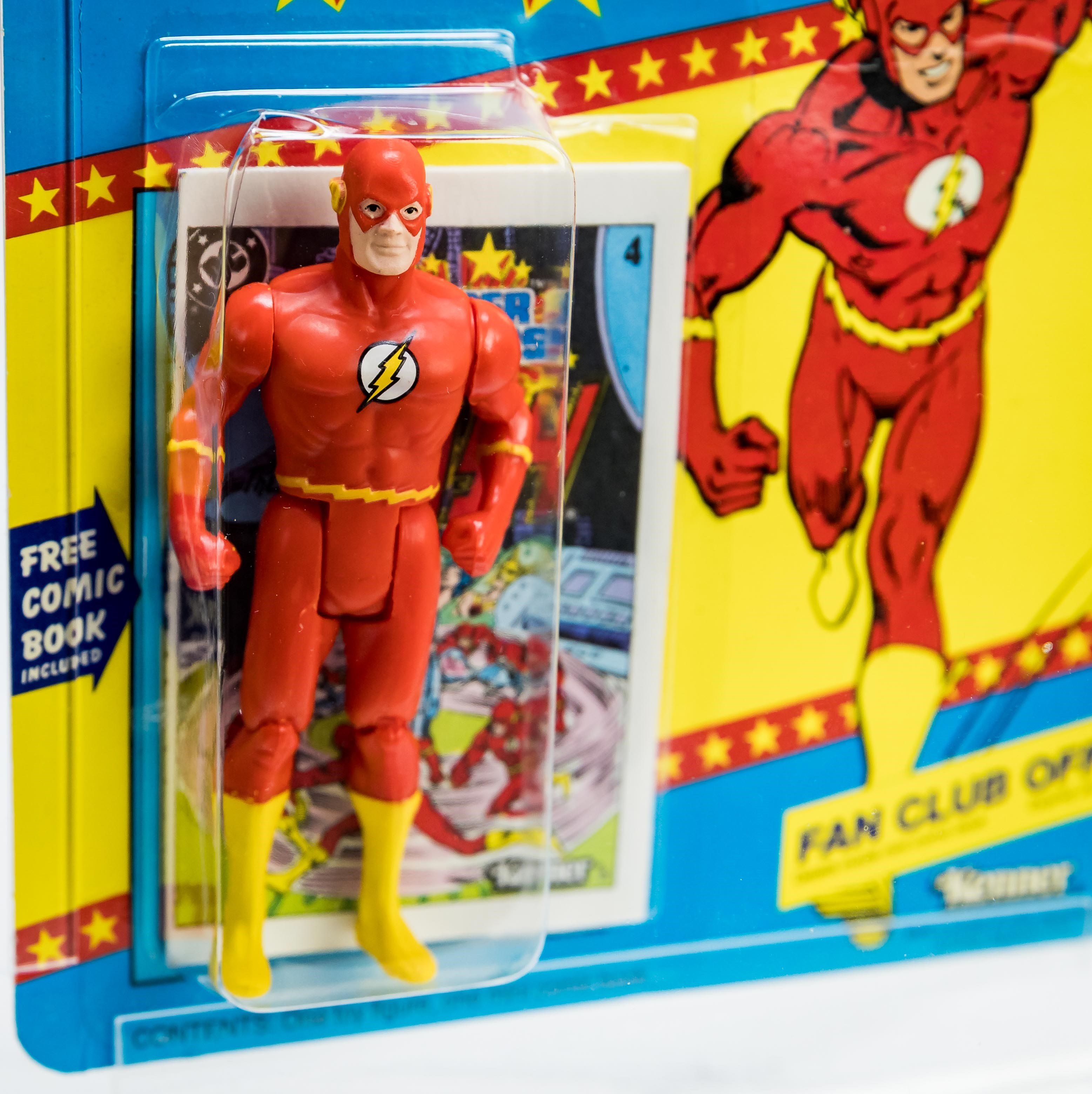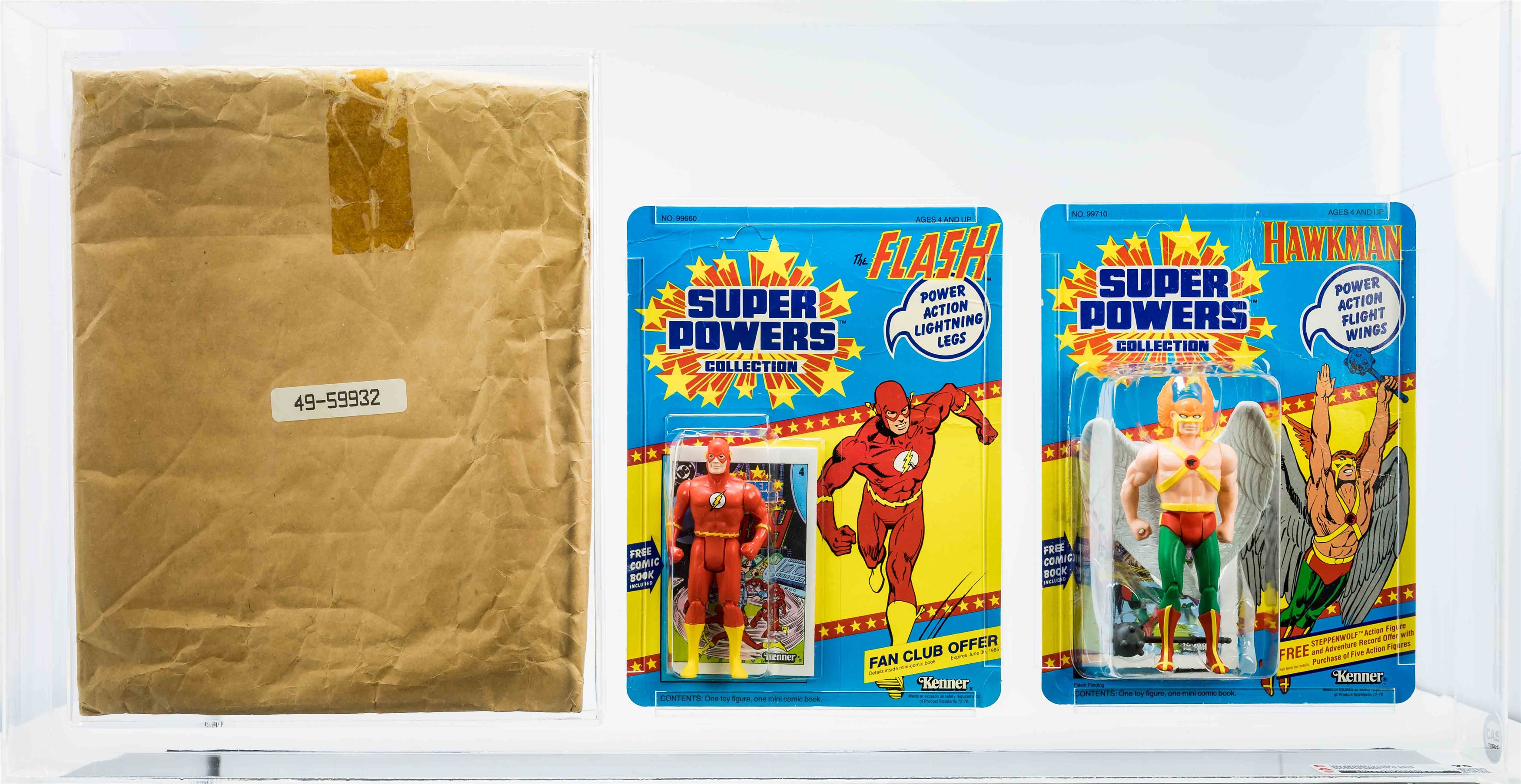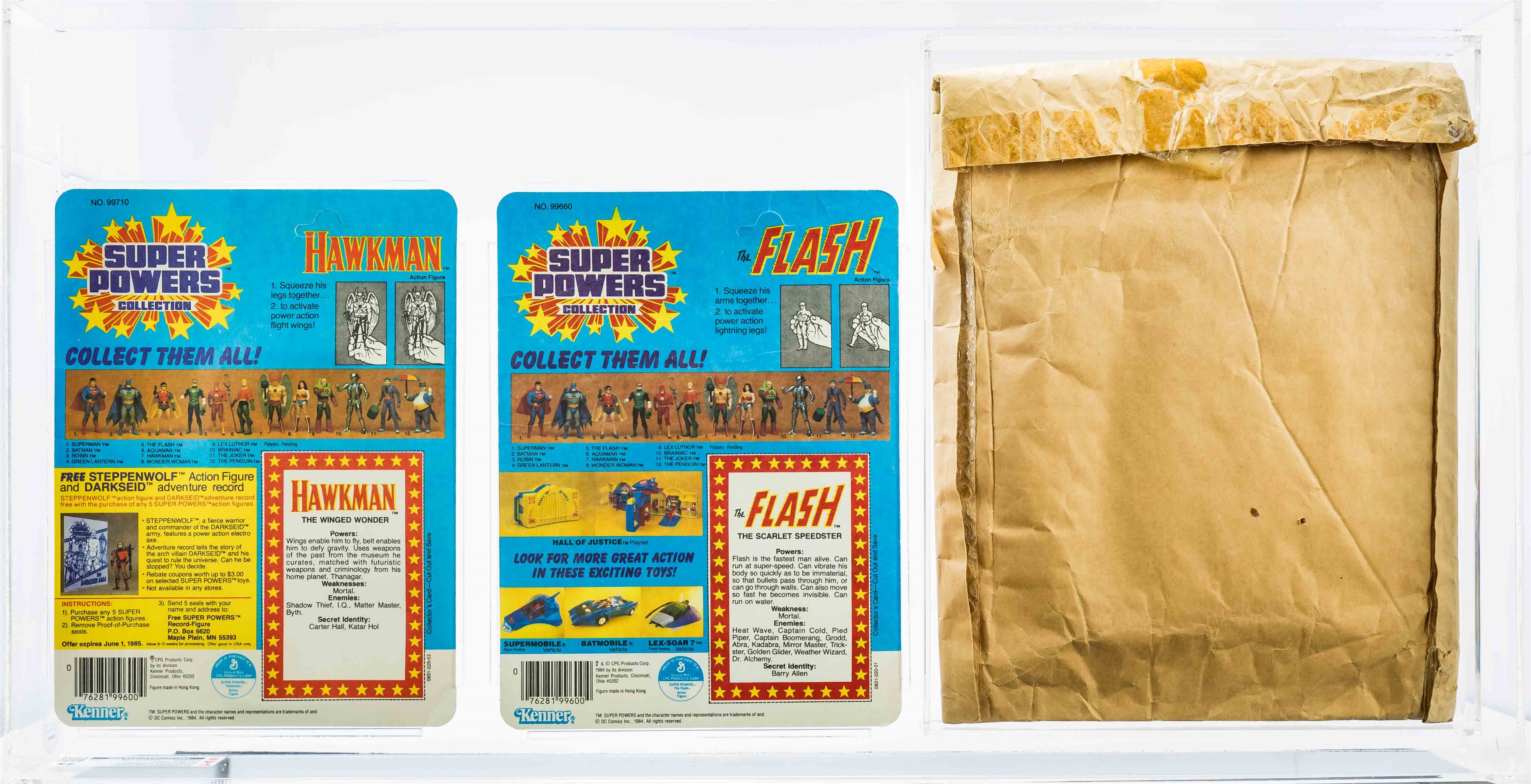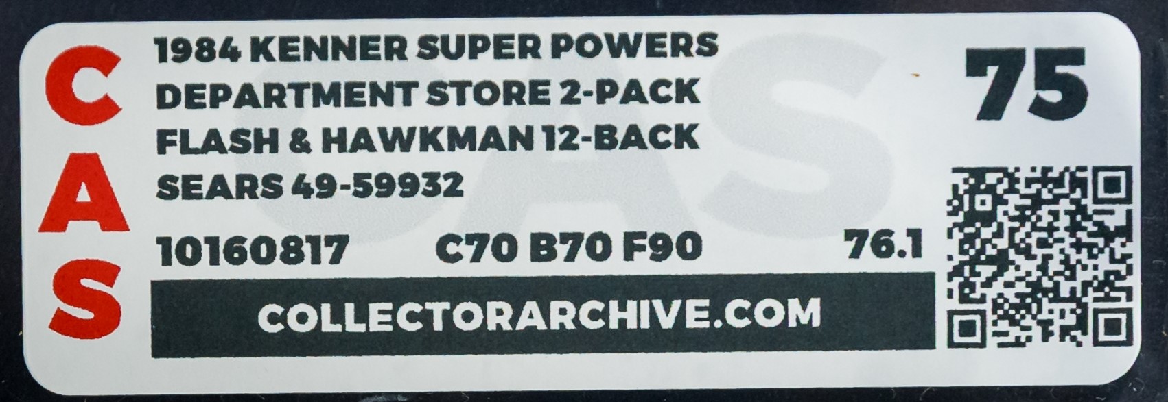 Very rare Sears 2-Pack featuring Series 1 Flash and Hawkman. Both are unpunched with clear bubbles and trays. Various condition issues – see photos. Wonderful display showcasing both carded figures along with ultra rare original Sears mailer. Approximately 26.5 x 2.5 x 14 inches. Encapsulated by CAS (75, 70-70-90), #10160817