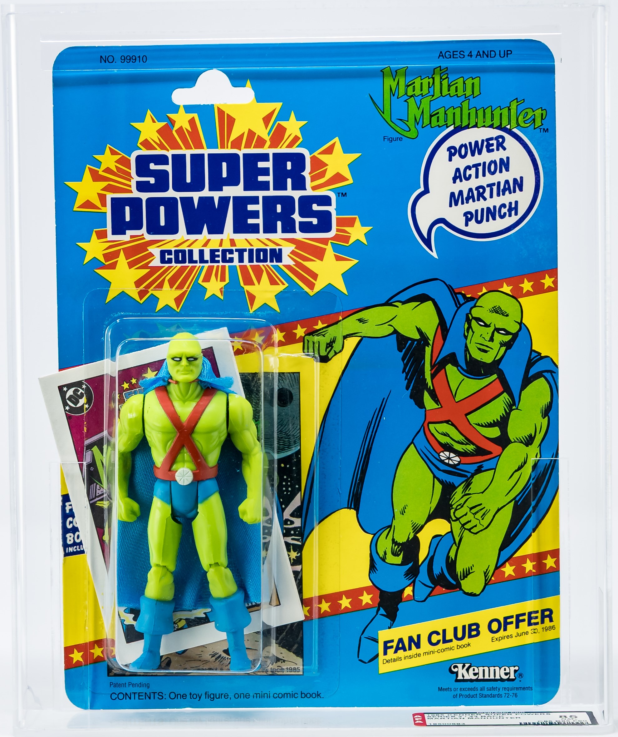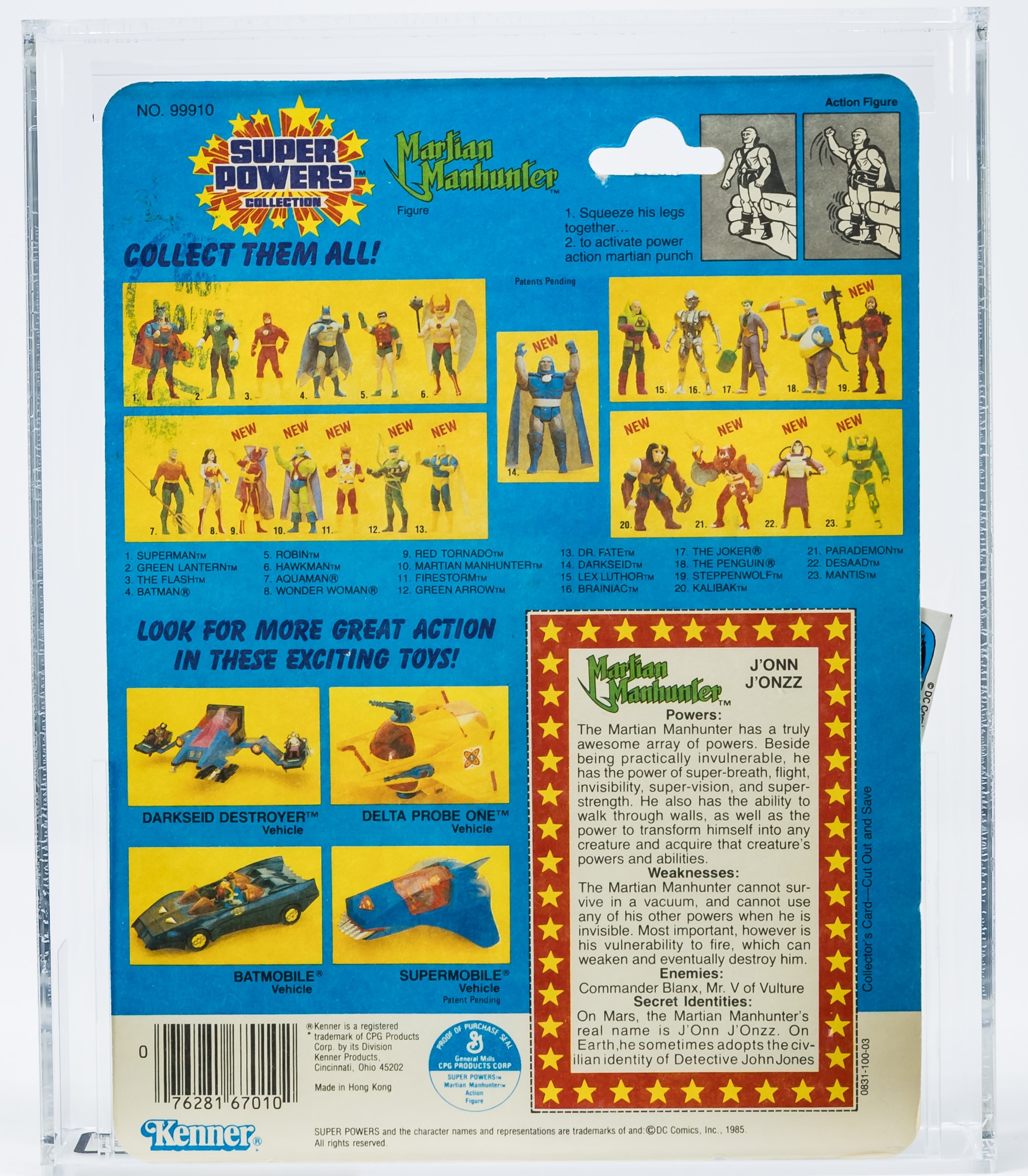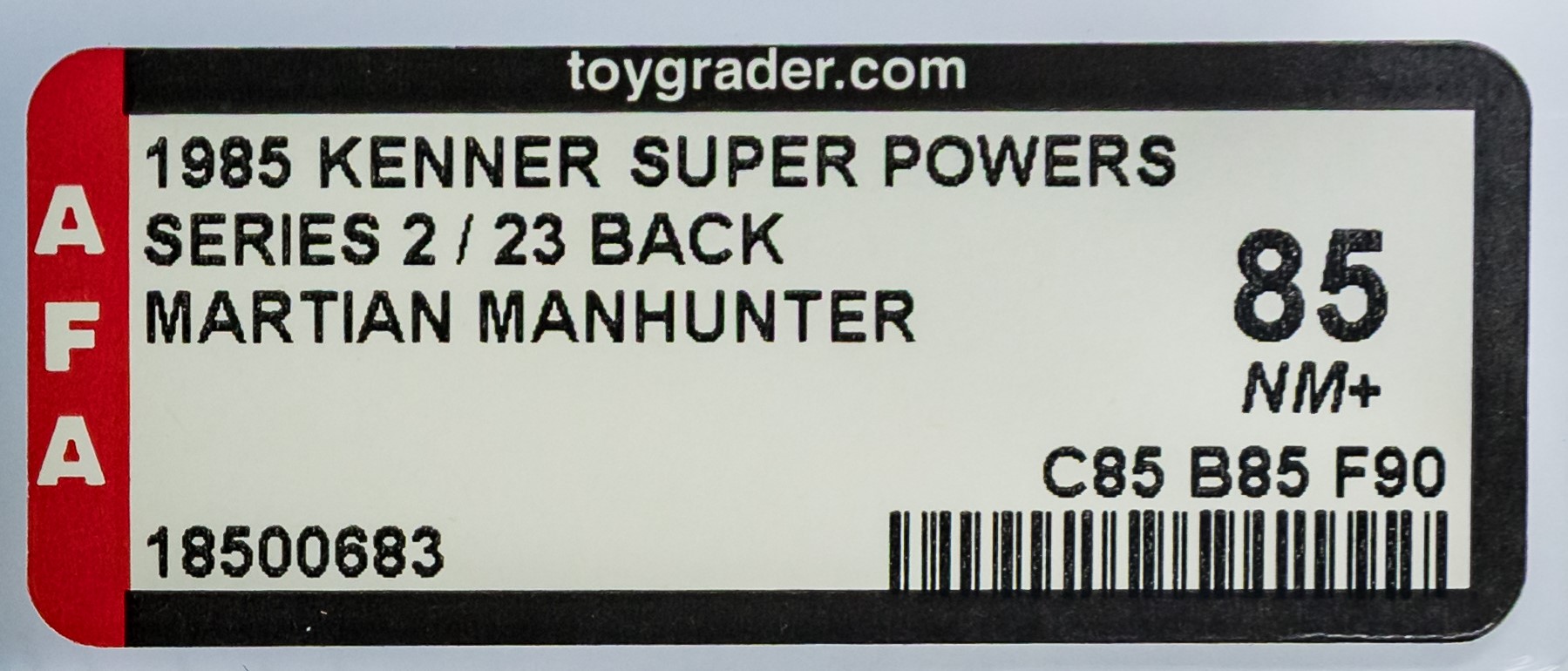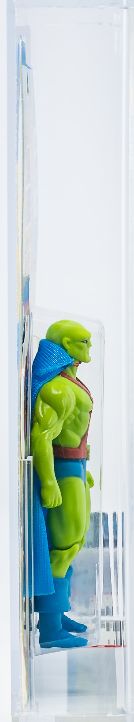 Ultra high-grade Martian Manhunter on 23-Back card with Fan Club Offer released by Kenner in 1985. Exceedingly rare to find a clear bubble example with such high subgrades. Great color to card, also card lies perfectly flat. No sticker. The back of the card is clean but does exhibit what appears to be a printing defect in the upper corner near the Superman action figure. Bubble is crystal clear and retains perfect form. Please note there is a bit of bubble lift from the card on the side nearest the edge and the mini comic has crept outside of the bubble. We don’t expect this to worsen. Item can always be recased by AFA if desired with side rails that run to the top of the card. Martian Manhunter action figure is in pristine condition. Overall, an outstanding Super Powers display piece with a card, clear bubble, and action figure that really “pop”. Encapsulated by AFA (85, 85-85-90), #18500683