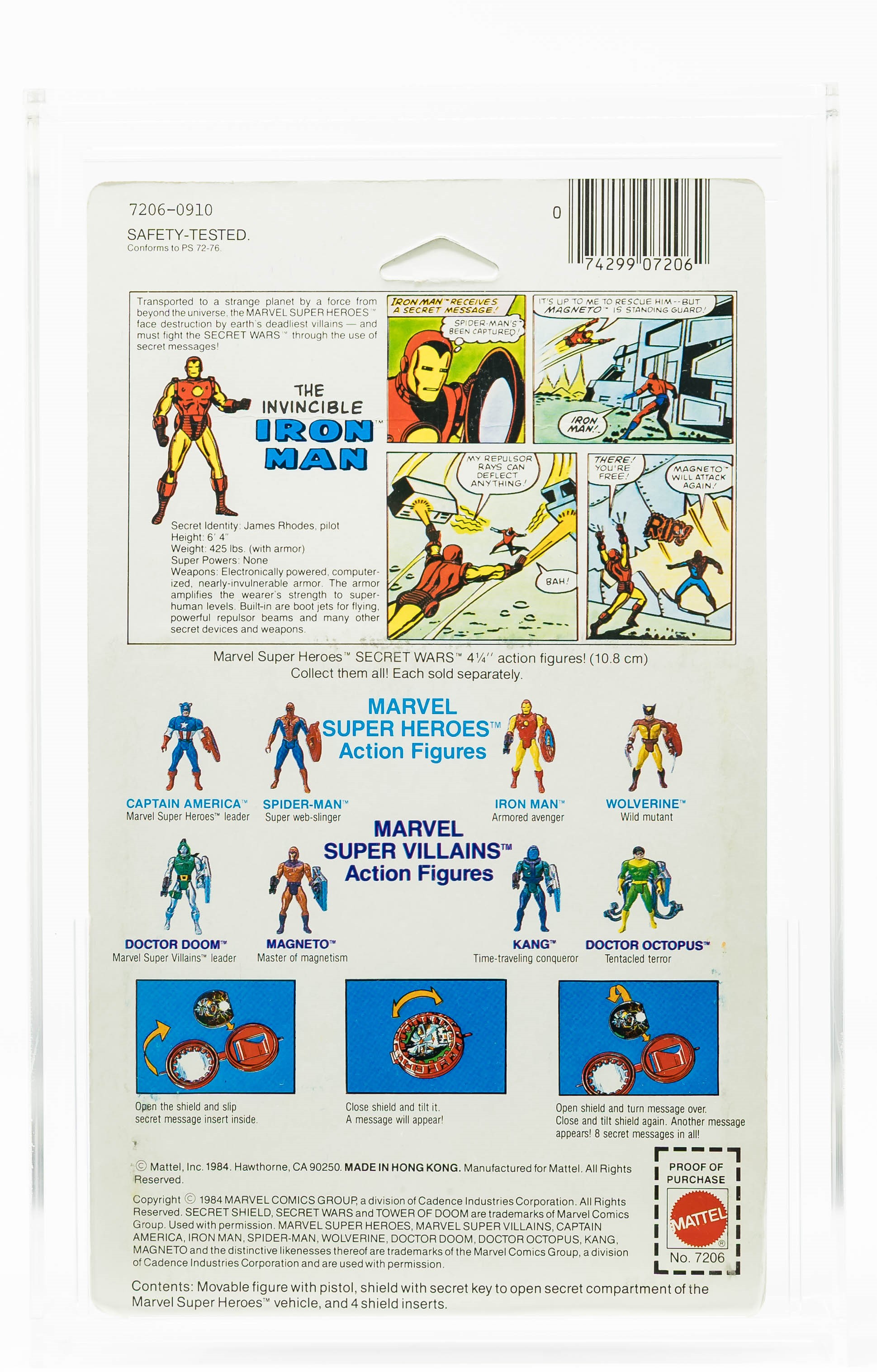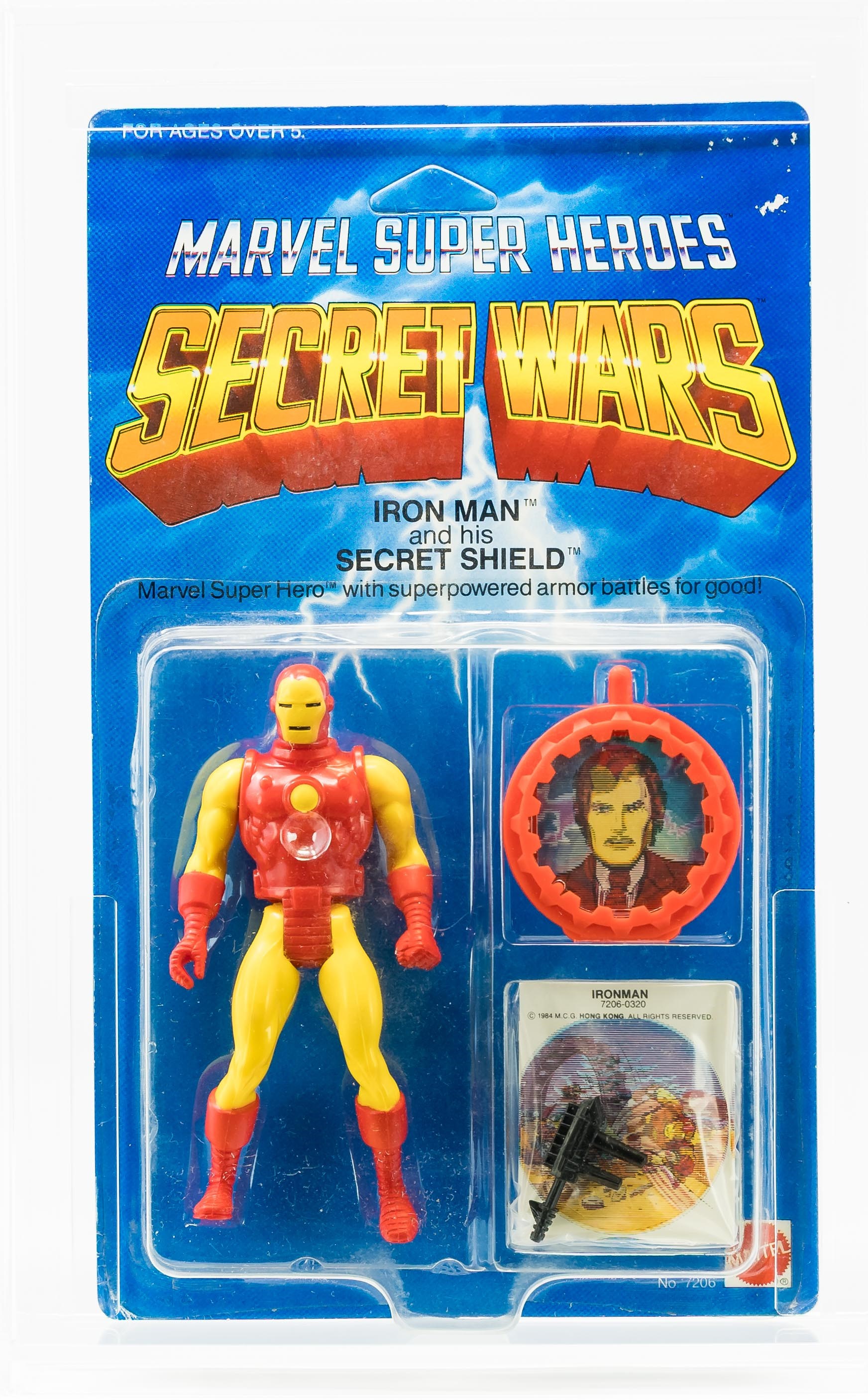 Attractive, well-presenting Series 1 Iron Man carded action figure released in 1984 by Mattel as part of their popular Secret Wars toyline. Factory sealed/unopened example in great condition. Unpunched card. No creases or veins on the front of the card. There is a bit of color loss in the upper corner from the removal of a price tag sticker. Back of card is clean but does exhibit a horizontal vein in the upper portion of the comic strip near the cop of the card. Clear bubble and tray retain perfect form. Iron Man action figure is in mint condition. Includes custom acrylic display case.