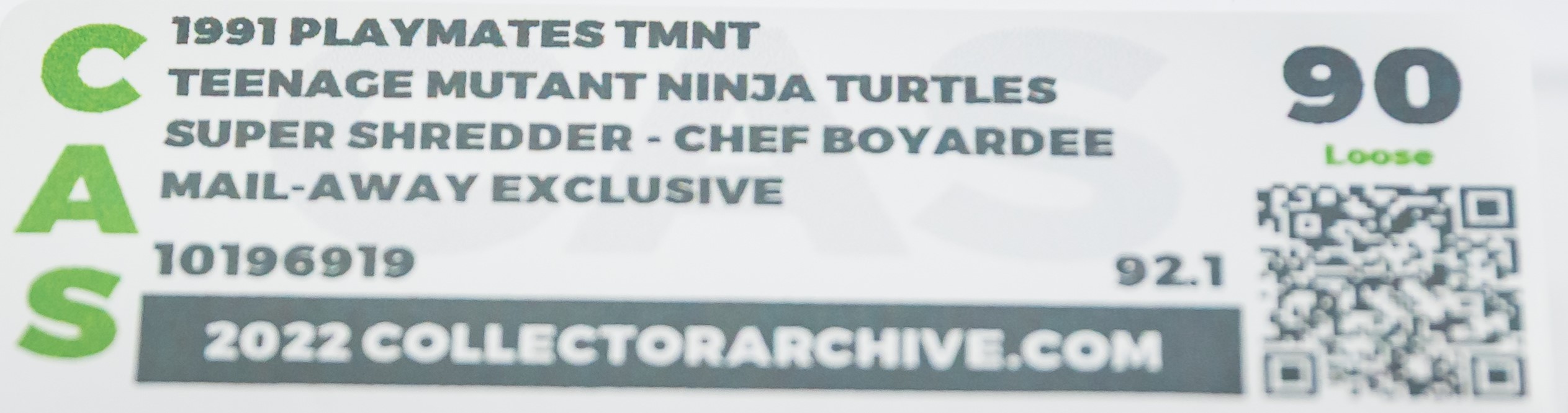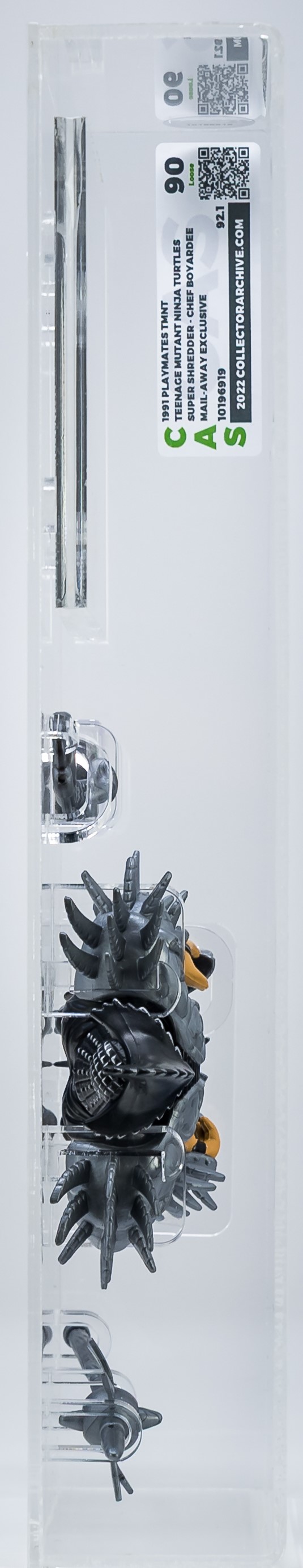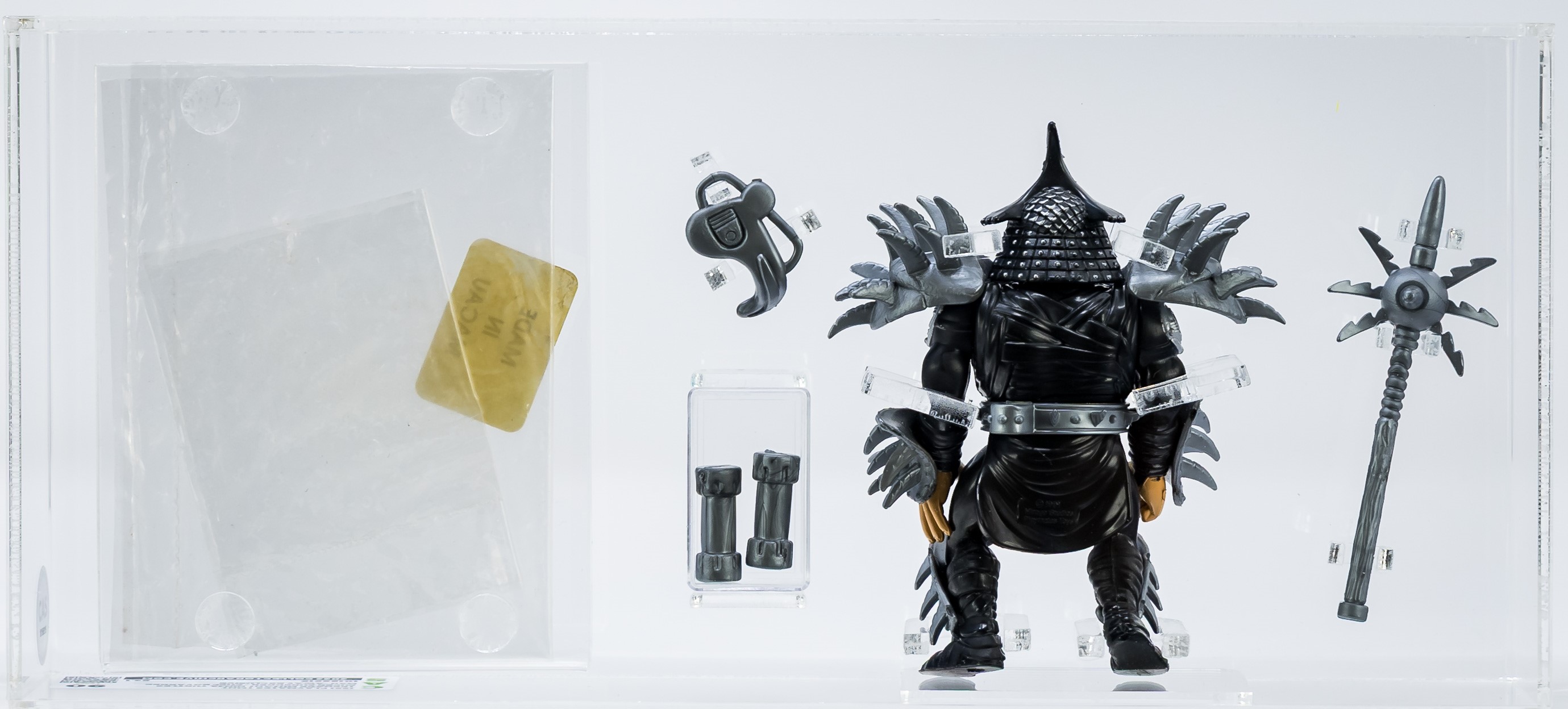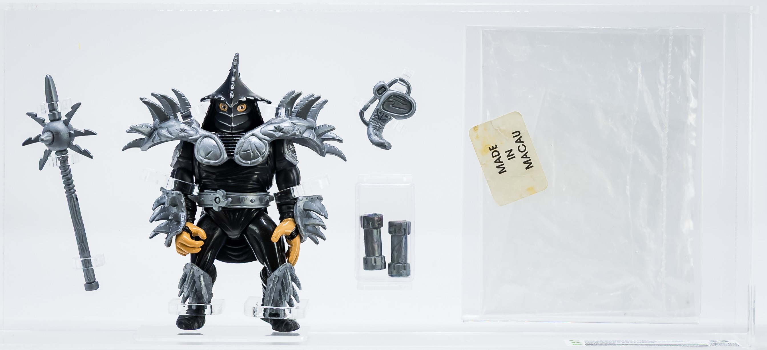 Popular Chef Boyardee mail-away exclusive Super Shredder in unsurpassed grade! This is the highly desirable US release in black outfit. Complete with original accessories along with “Made in Macau” baggie. Pristine! Encapsulated by CAS (90), #10196919