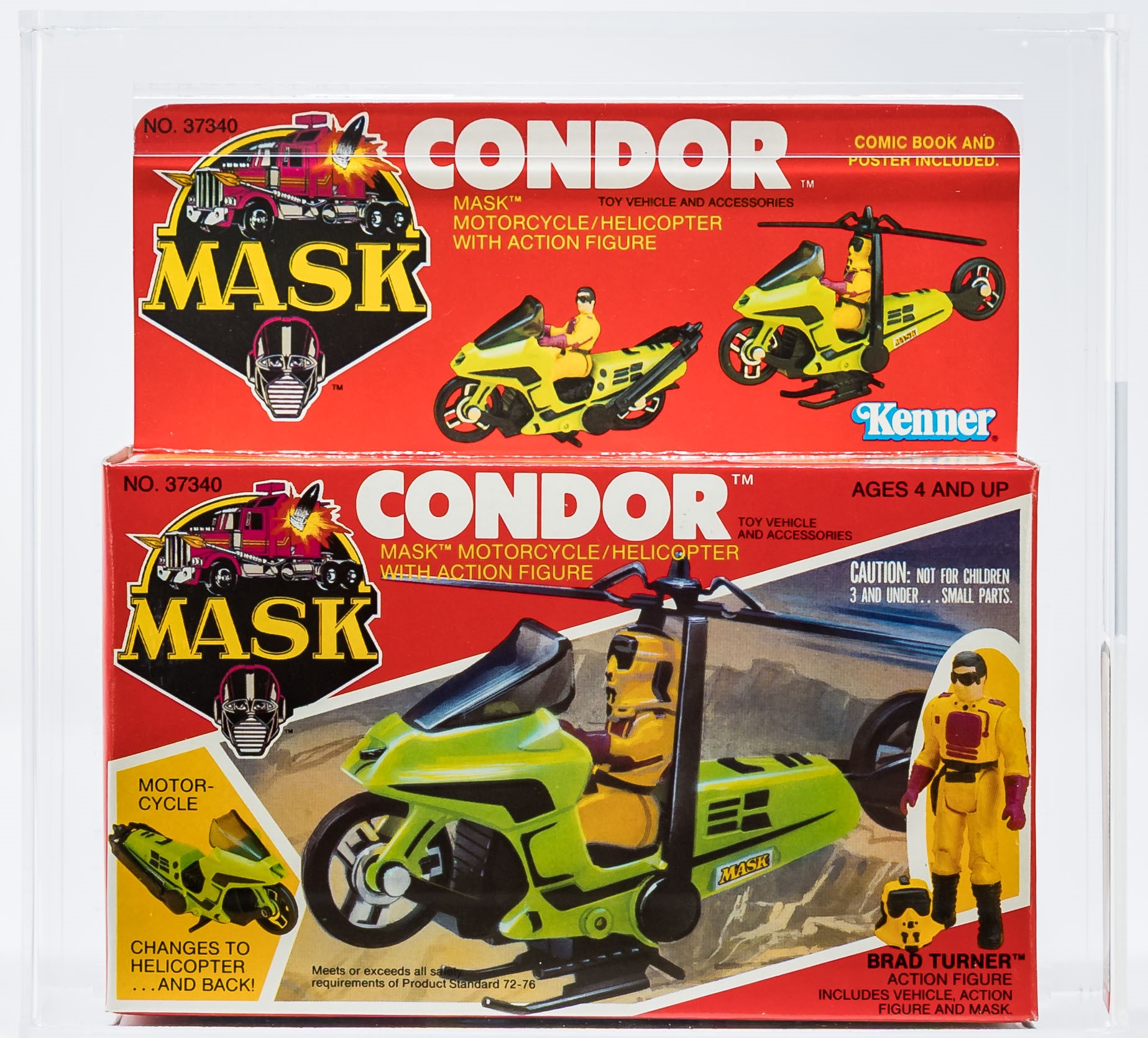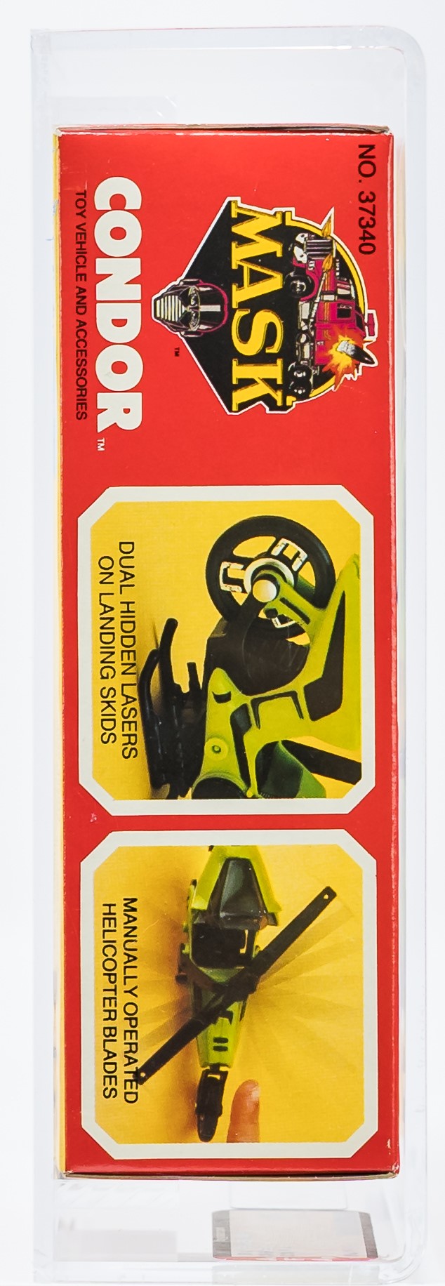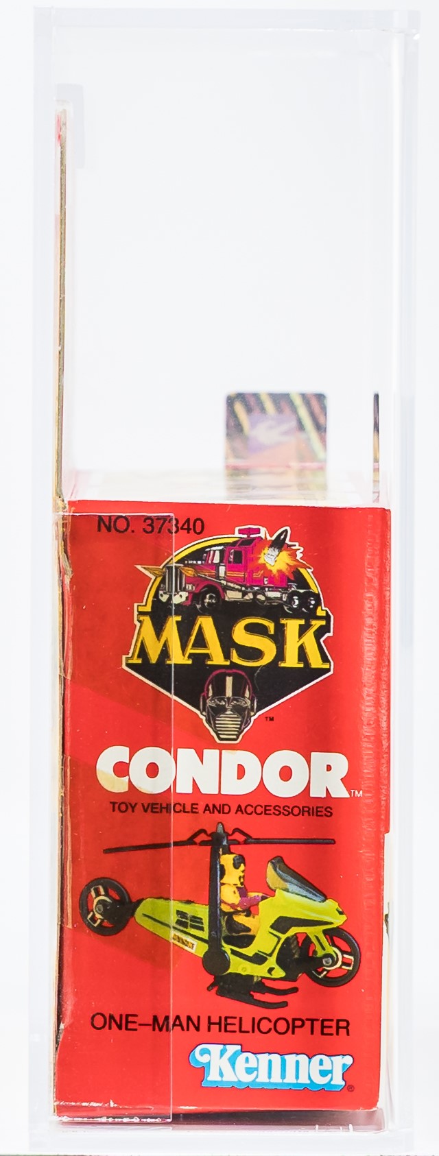 Immaculate Series 1 first-release MISB Condor from Kenner’s MASK toyline in 1985. Every panel is exceptional with few imperfections. Amazing color throughout. Each end is firmly factory tape sealed. No colorbreak along the front edges. Rare opportunity to add an AFA 85 first-release Condor to the trophy case! Encapsulated by AFA (85), #15003494