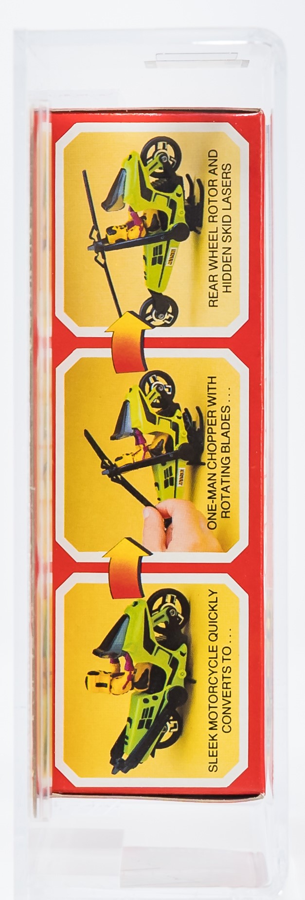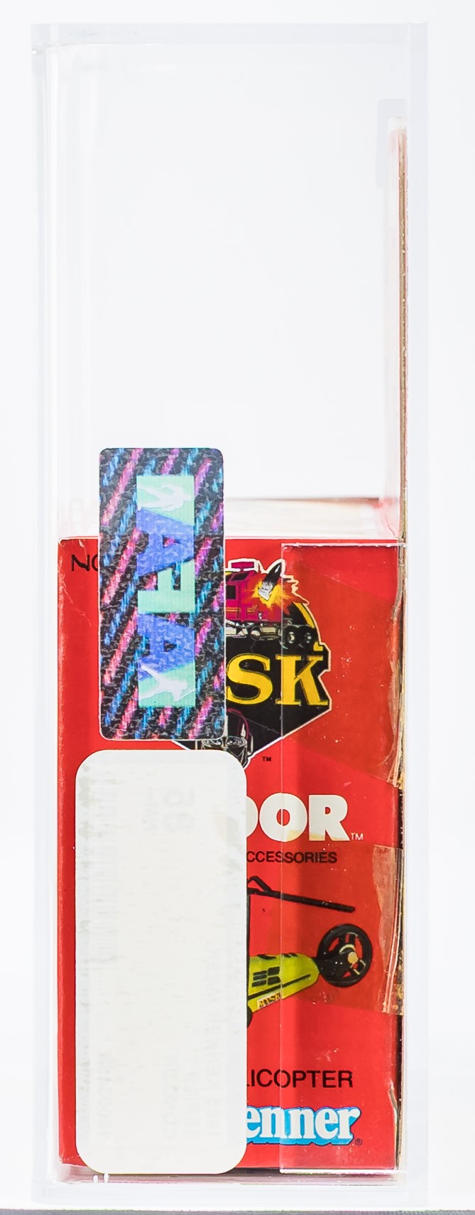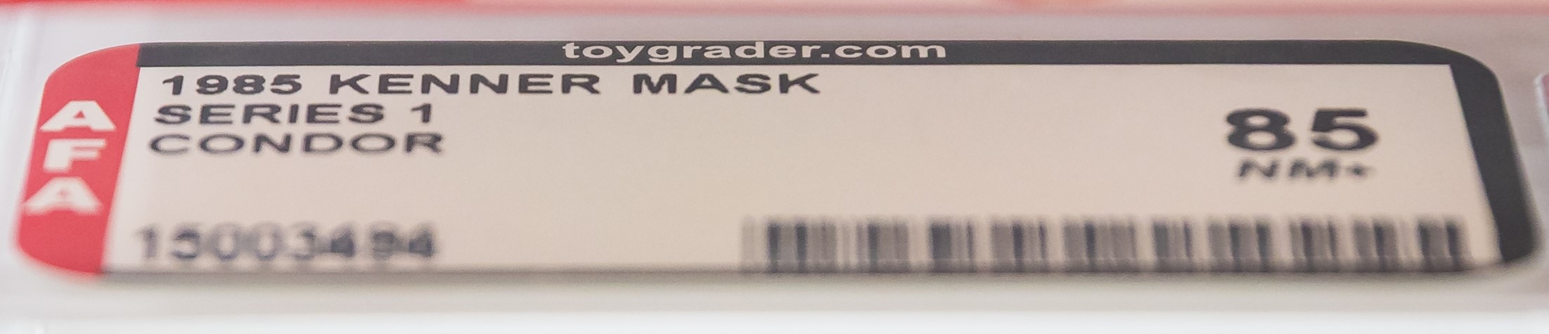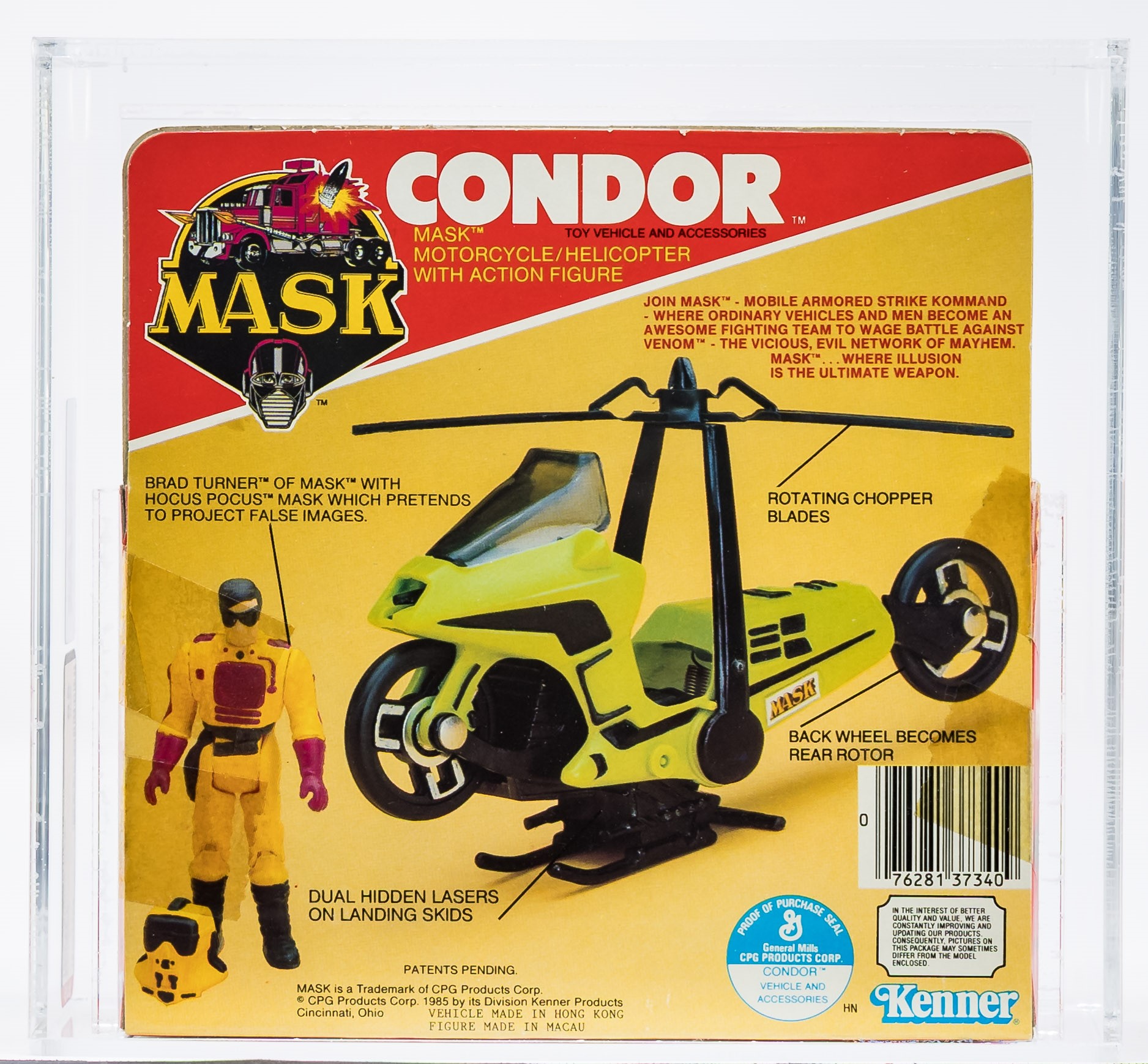 Immaculate Series 1 first-release MISB Condor from Kenner’s MASK toyline in 1985. Every panel is exceptional with few imperfections. Amazing color throughout. Each end is firmly factory tape sealed. No colorbreak along the front edges. Rare opportunity to add an AFA 85 first-release Condor to the trophy case! Encapsulated by AFA (85), #15003494