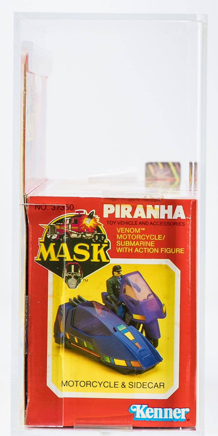 Ultra high-grade Series 1 MISB Piranha from Kenner’s MASK toyline in 1986. Each end is firmly factory tape sealed as is the bottom. Please note the tape has lifted on one end of the top panel. No colorbreak along the front edges. Very nice example! Encapsulated by AFA (85), #14197253