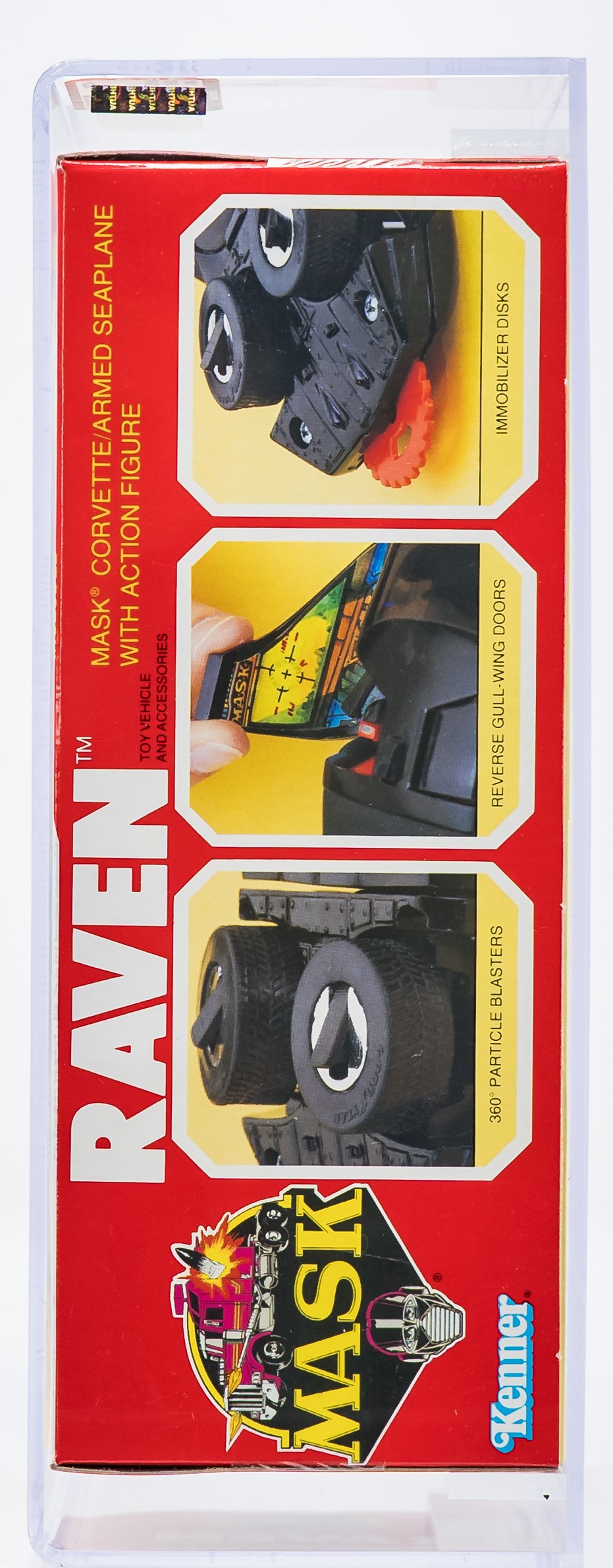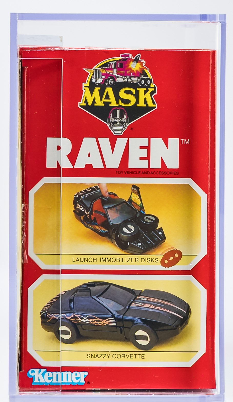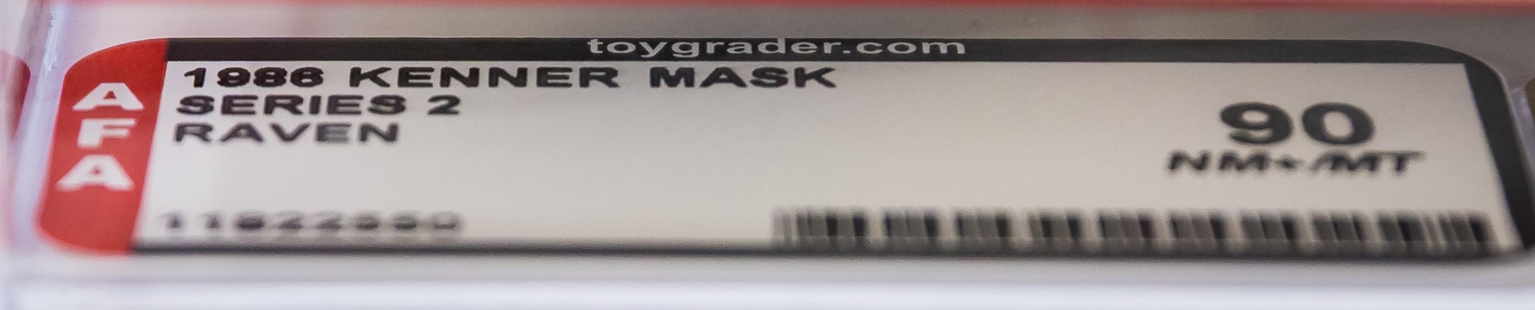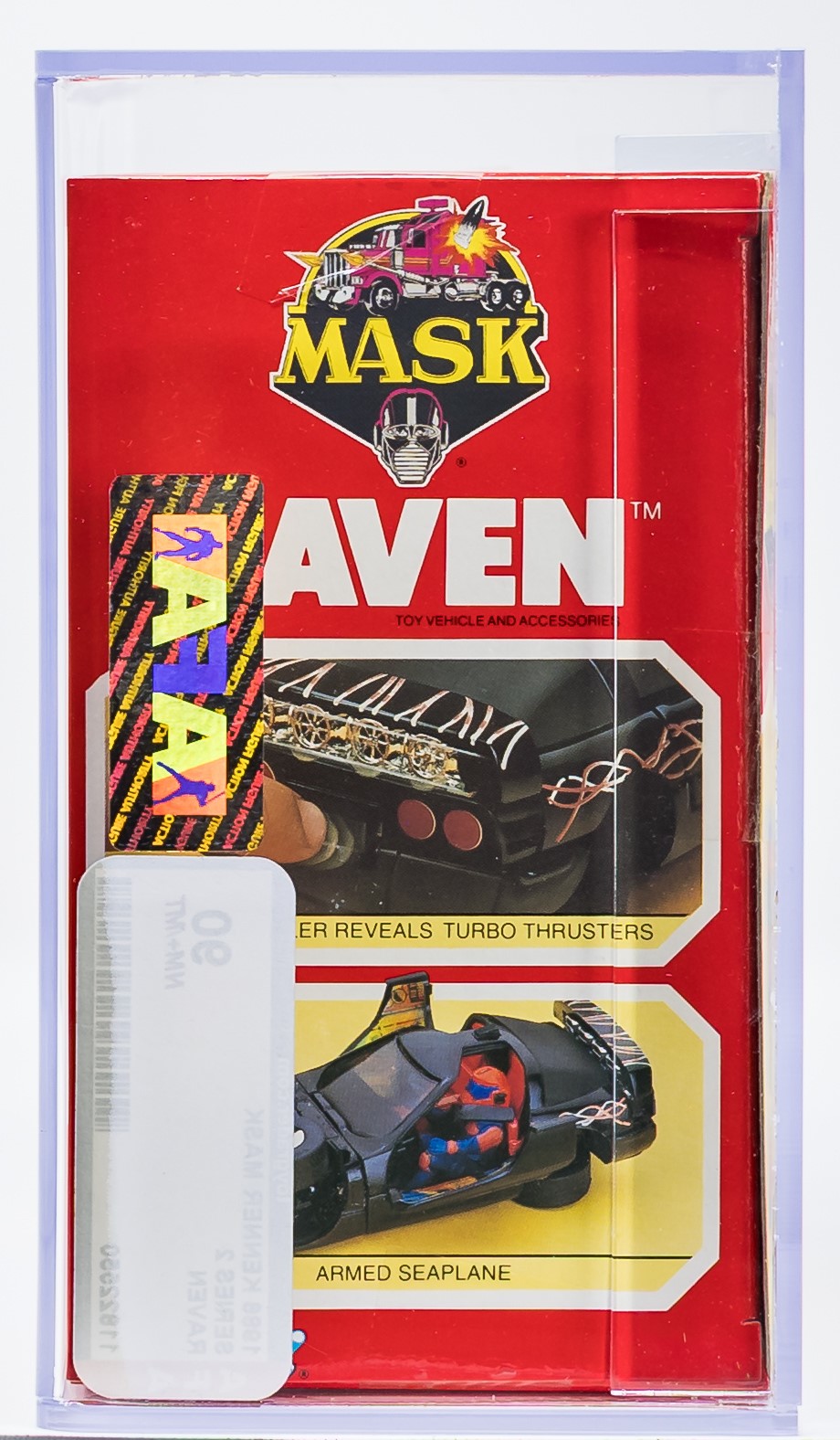Exceptional Series 2 MISB Raven from Kenner’s MASK toyline in 1986. Gorgeous example with few imperfections. Top, bottom, and sides are firmly factory tape sealed. No colorbreak along the front edges. This is the only AFA graded Raven currently available in any marketplace. Encapsulated by AFA (90), #11822550