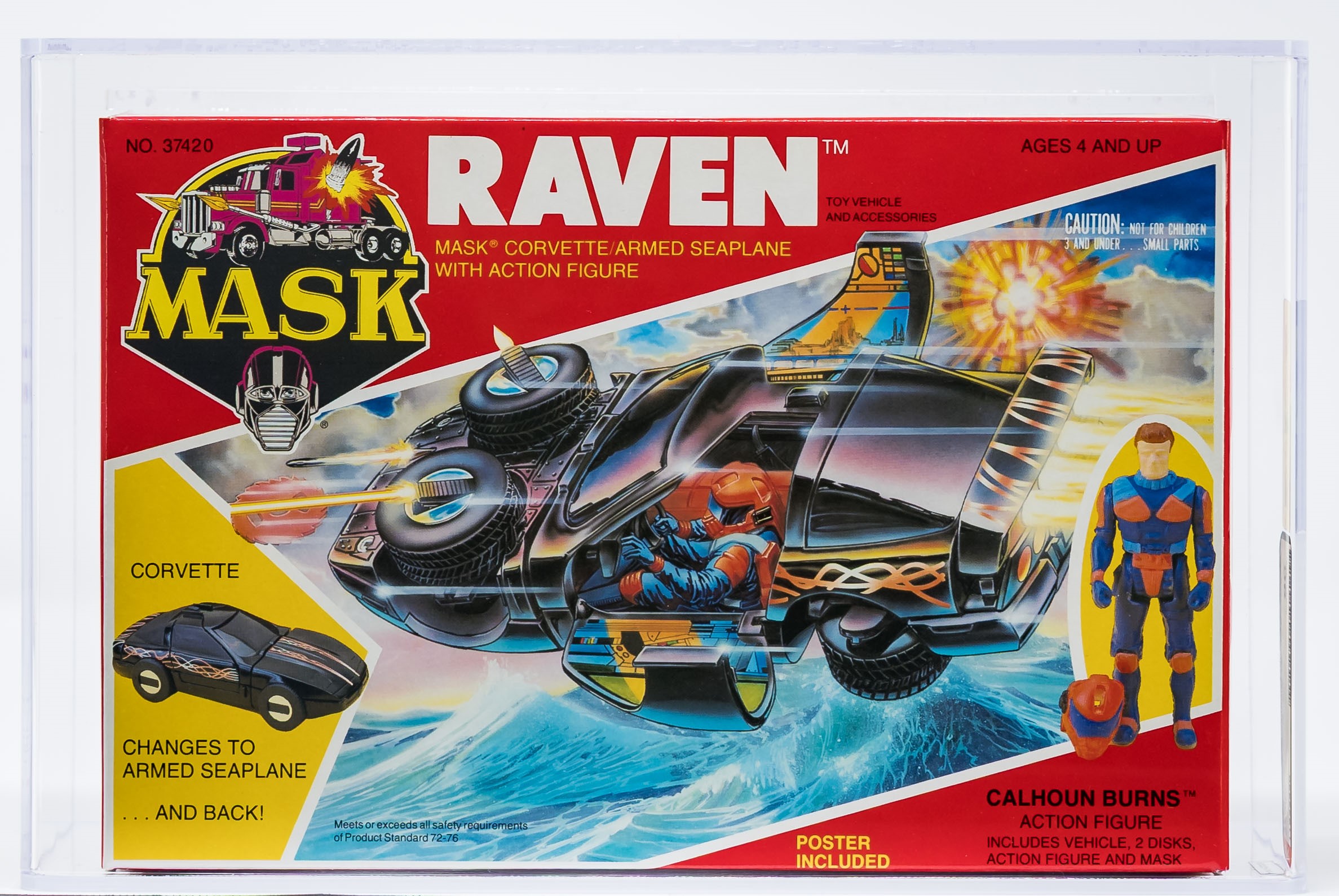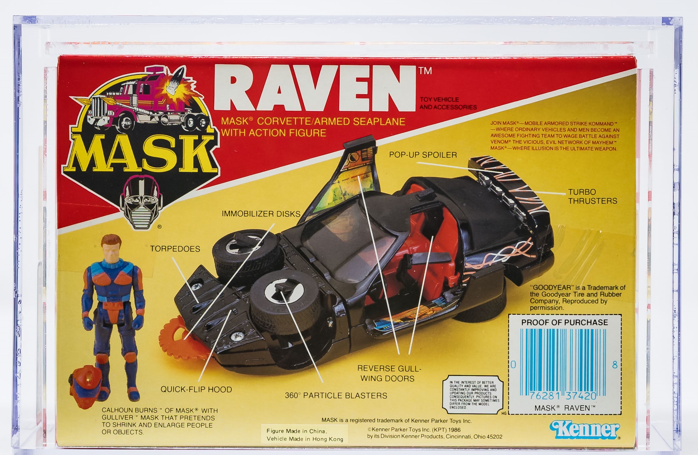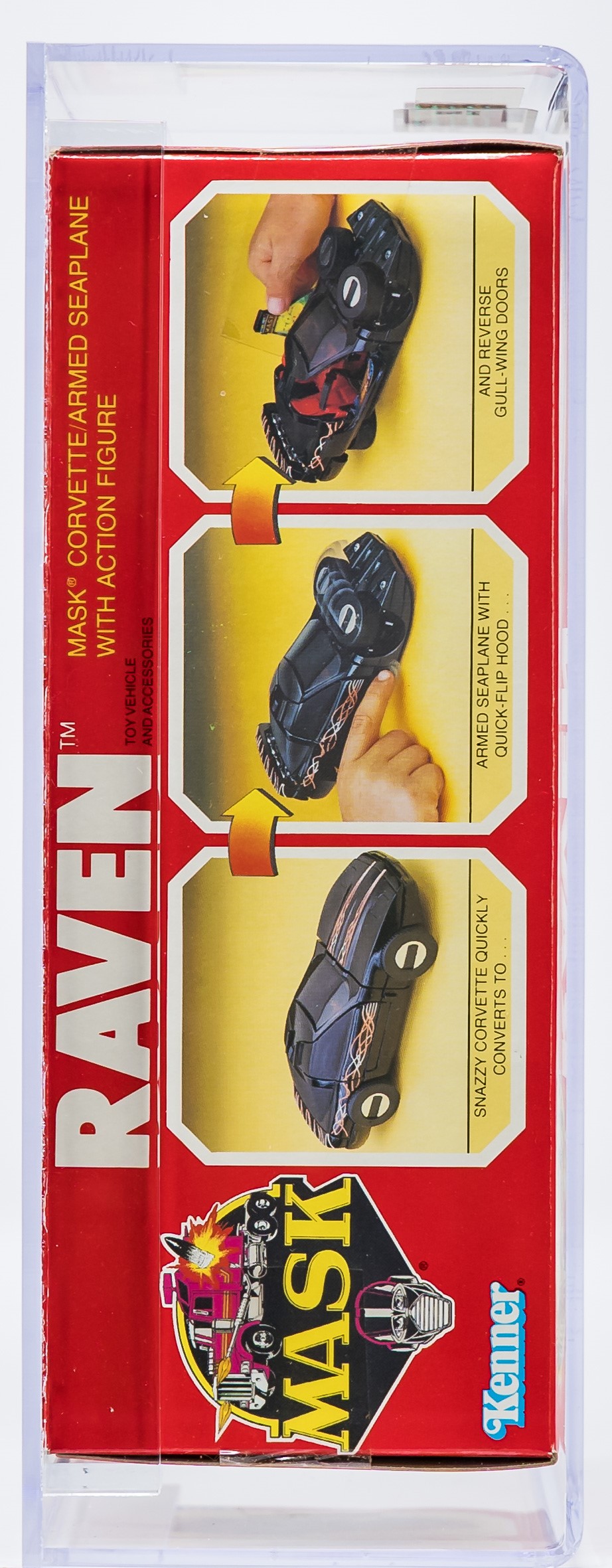 Exceptional Series 2 MISB Raven from Kenner’s MASK toyline in 1986. Gorgeous example with few imperfections. Top, bottom, and sides are firmly factory tape sealed. No colorbreak along the front edges. This is the only AFA graded Raven currently available in any marketplace. Encapsulated by AFA (90), #11822550