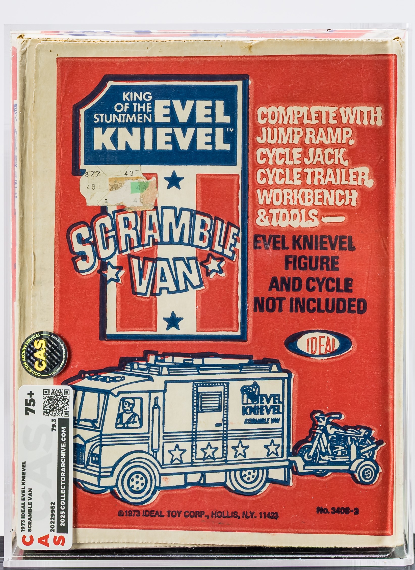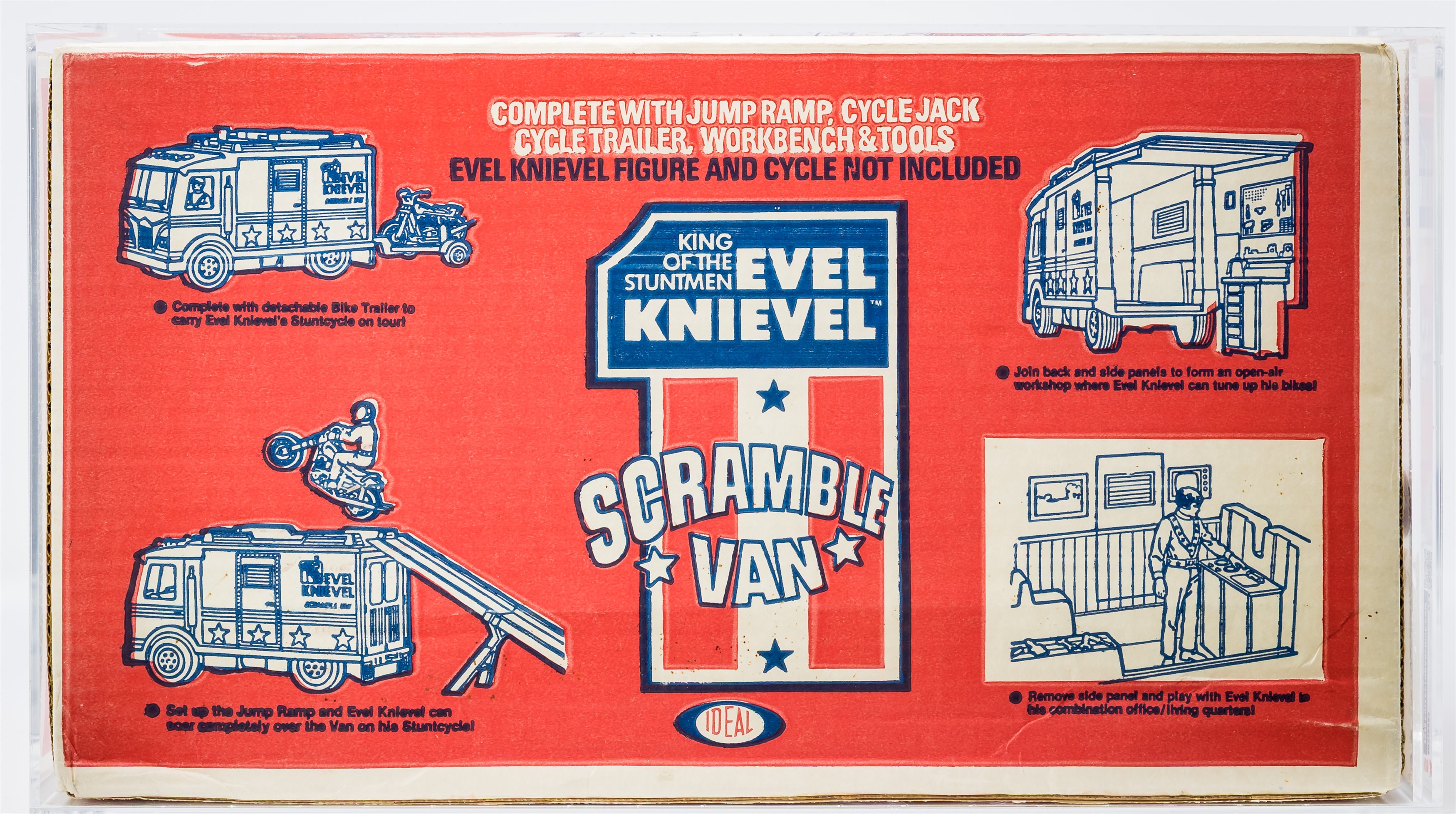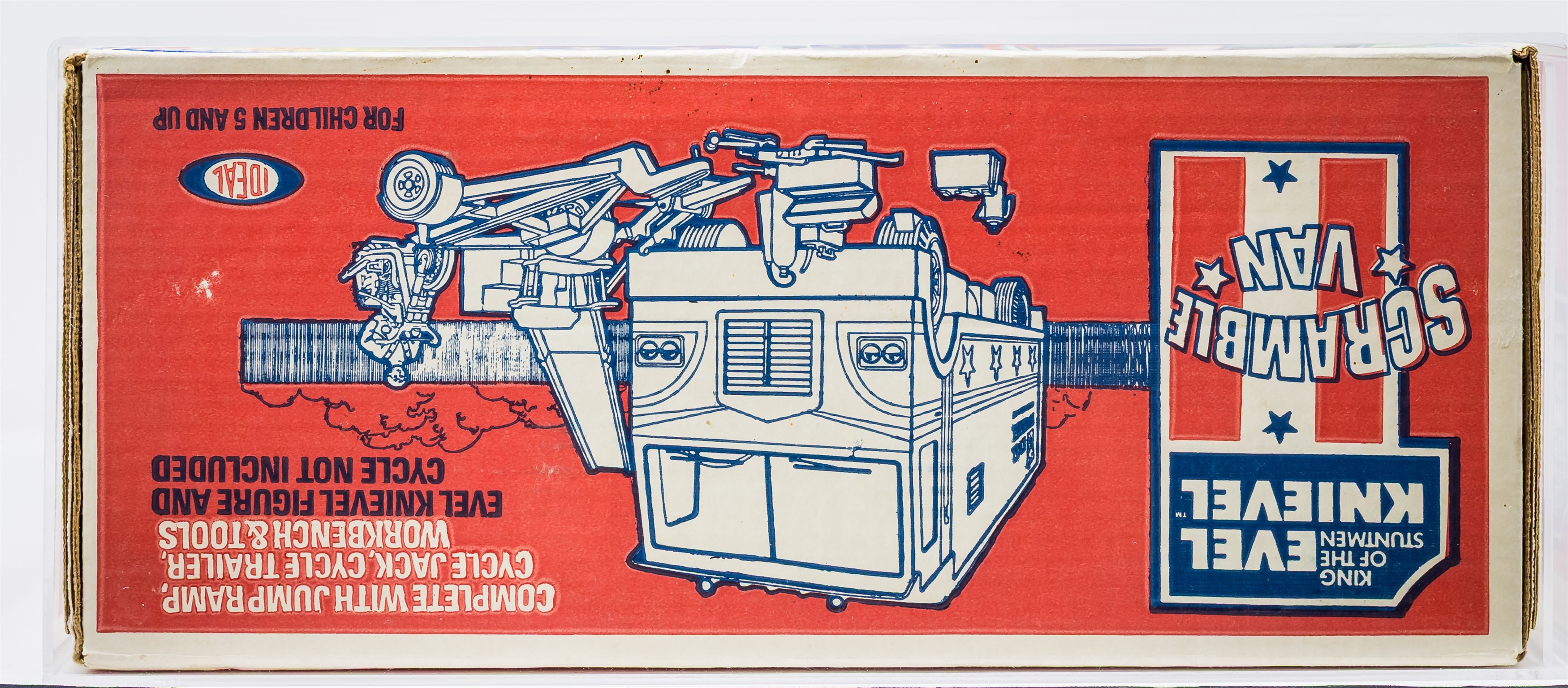 Gorgeous MISB Scramble Van from the Evel Knievel toyline released by Ideal in 1973. Over 50 years old! Our factory sealed example exhibits outstanding color throughout especially on the all-important front panel. Box condition is excellent overall with only a few blemishes that are out of sight when displayed on shelf. Approximately 18 x 7.5 x 10 inches. Encapsulated by CAS (75+), #20229952