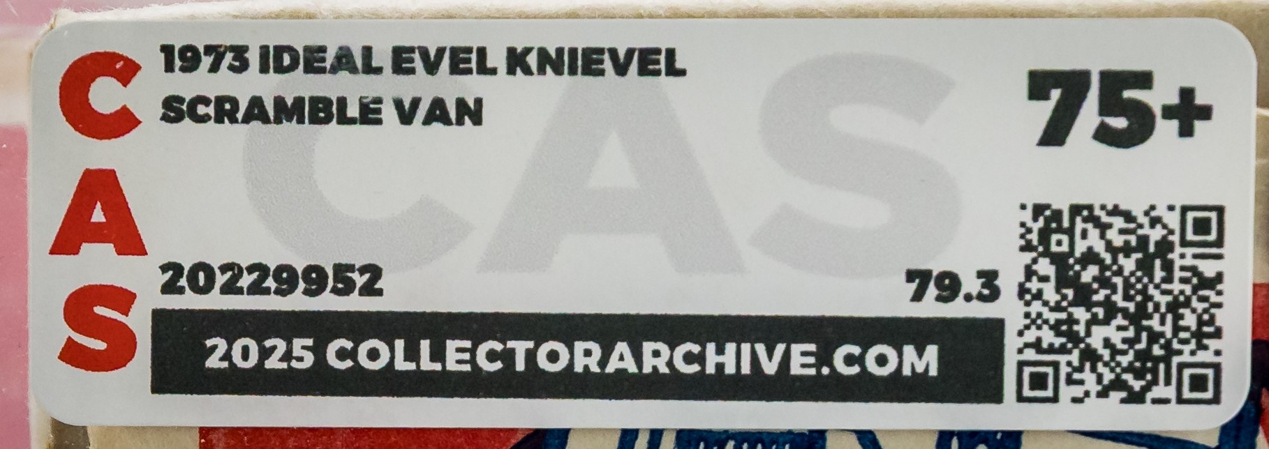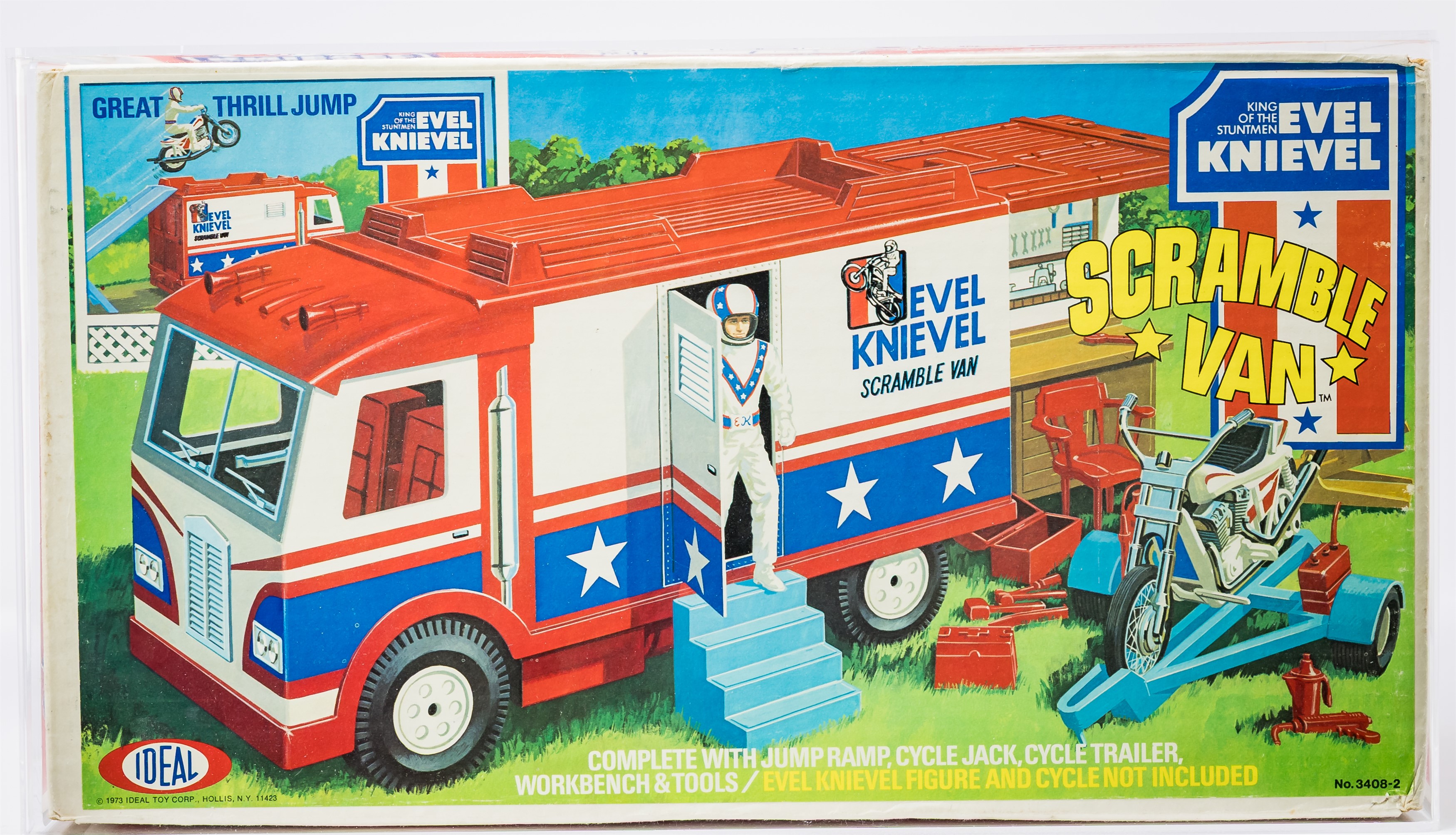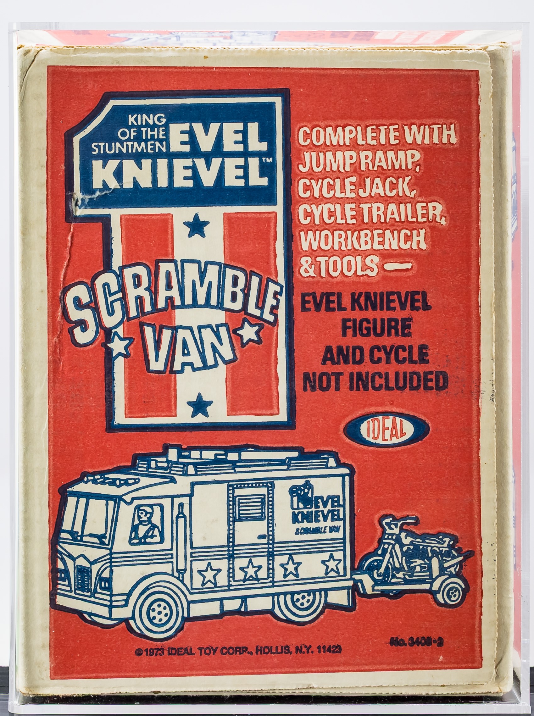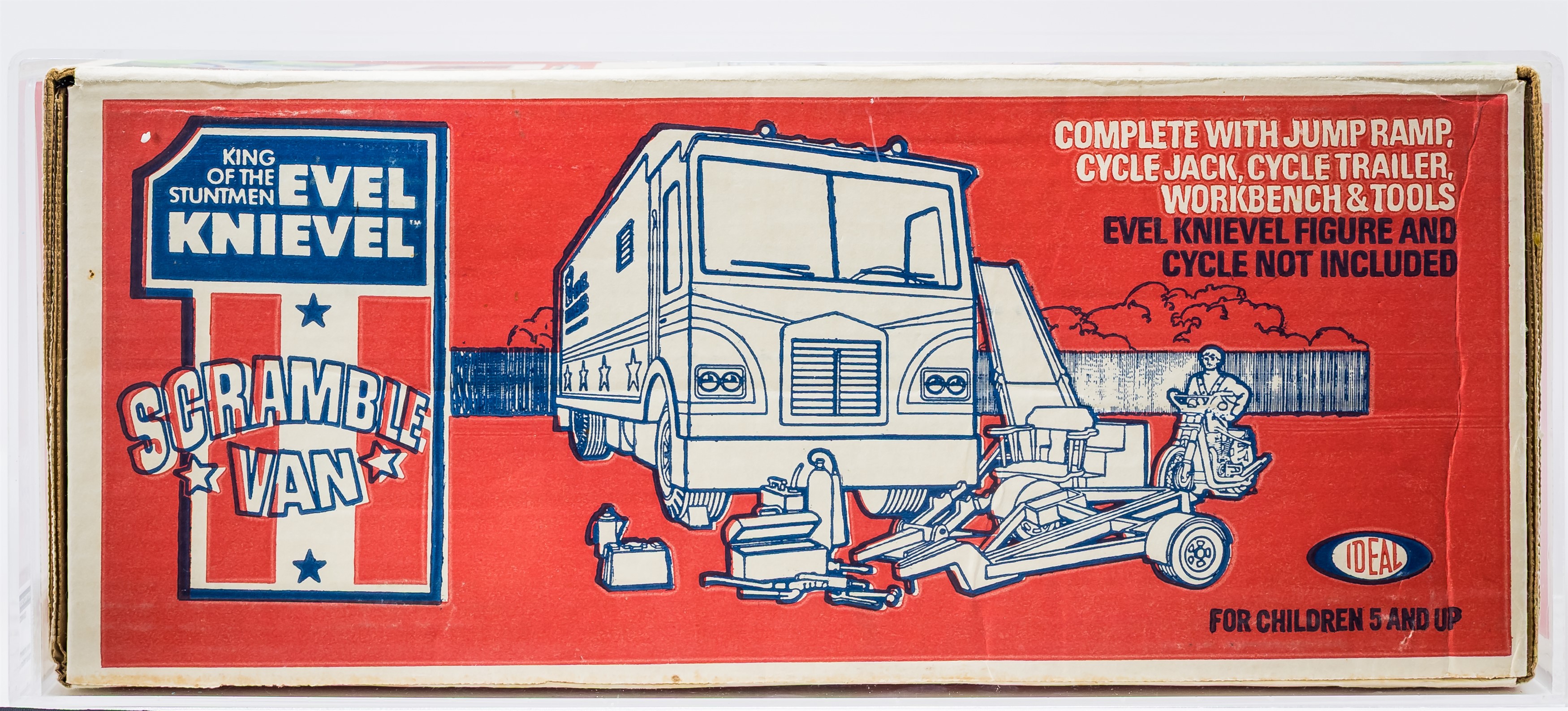 Gorgeous MISB Scramble Van from the Evel Knievel toyline released by Ideal in 1973. Over 50 years old! Our factory sealed example exhibits outstanding color throughout especially on the all-important front panel. Box condition is excellent overall with only a few blemishes that are out of sight when displayed on shelf. Approximately 18 x 7.5 x 10 inches. Encapsulated by CAS (75+), #20229952