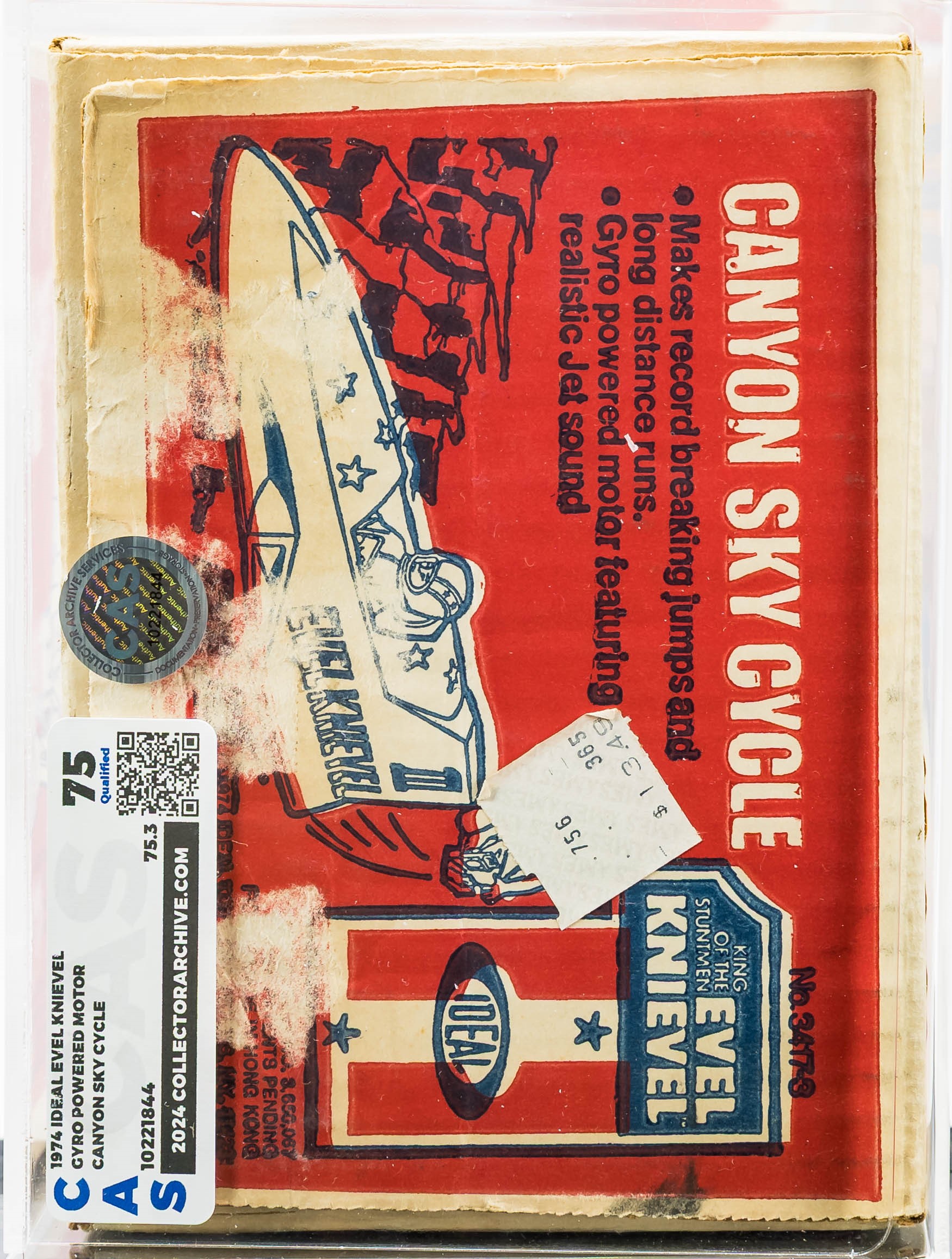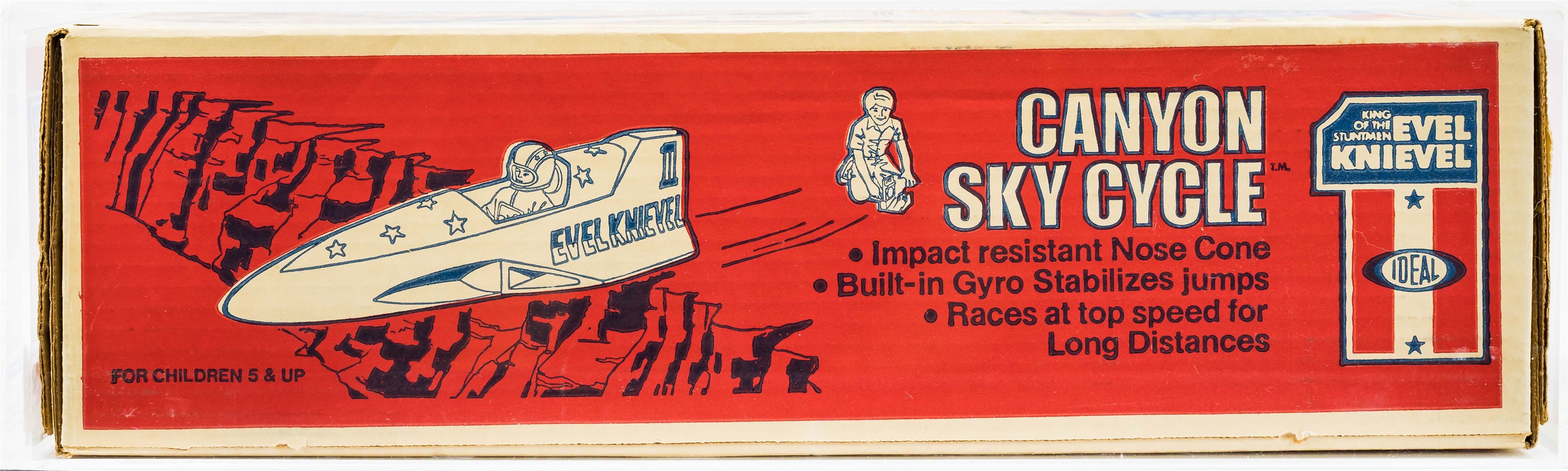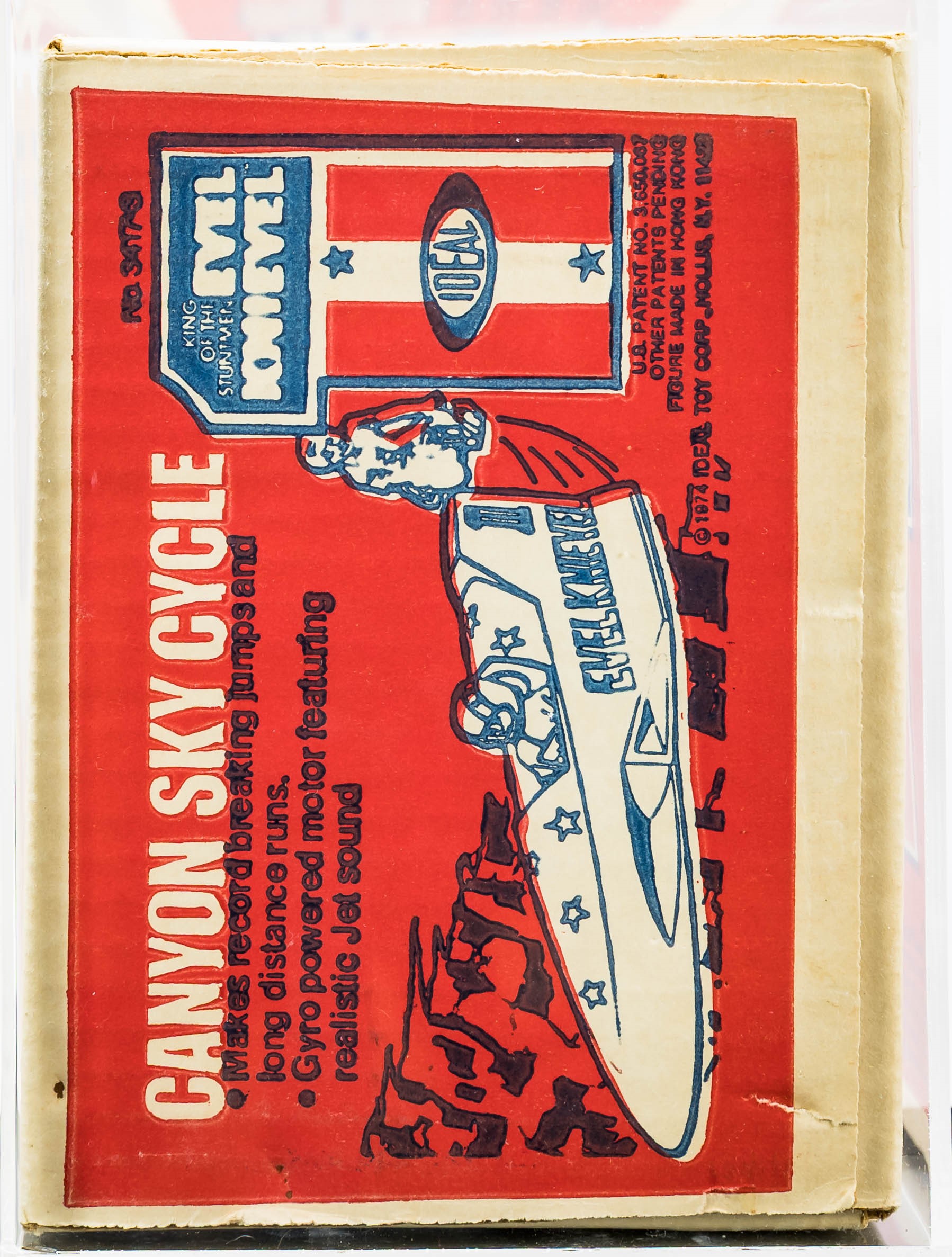 Ultra rare Canyon Sky Cycle from the Evel Knievel toyline released by Ideal in 1974. Factory sealed on one end and opened on the other. CAS has verified the contents within are complete and new/unused. Great display piece that is now over 50 years old! See photos for condition. Approximately 19 x 5.5 x 8 inches. Encapsulated by CAS (75q), #10221844