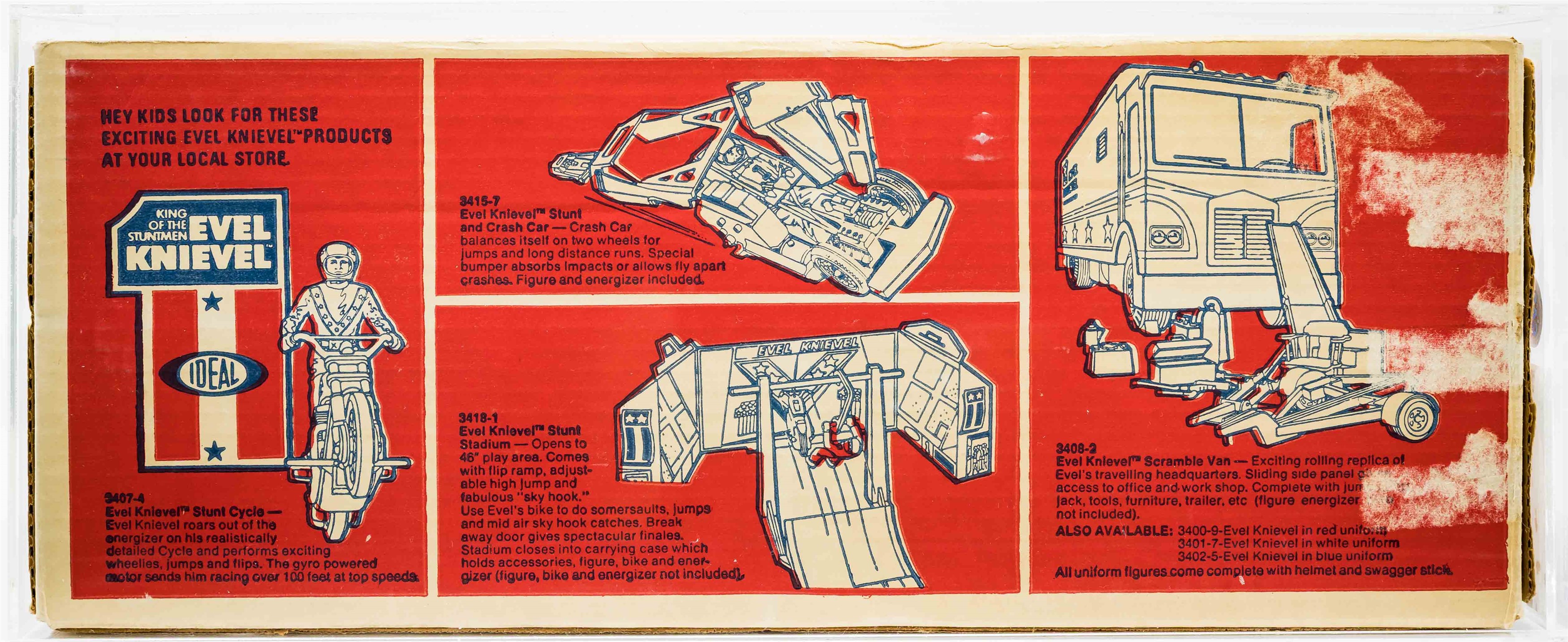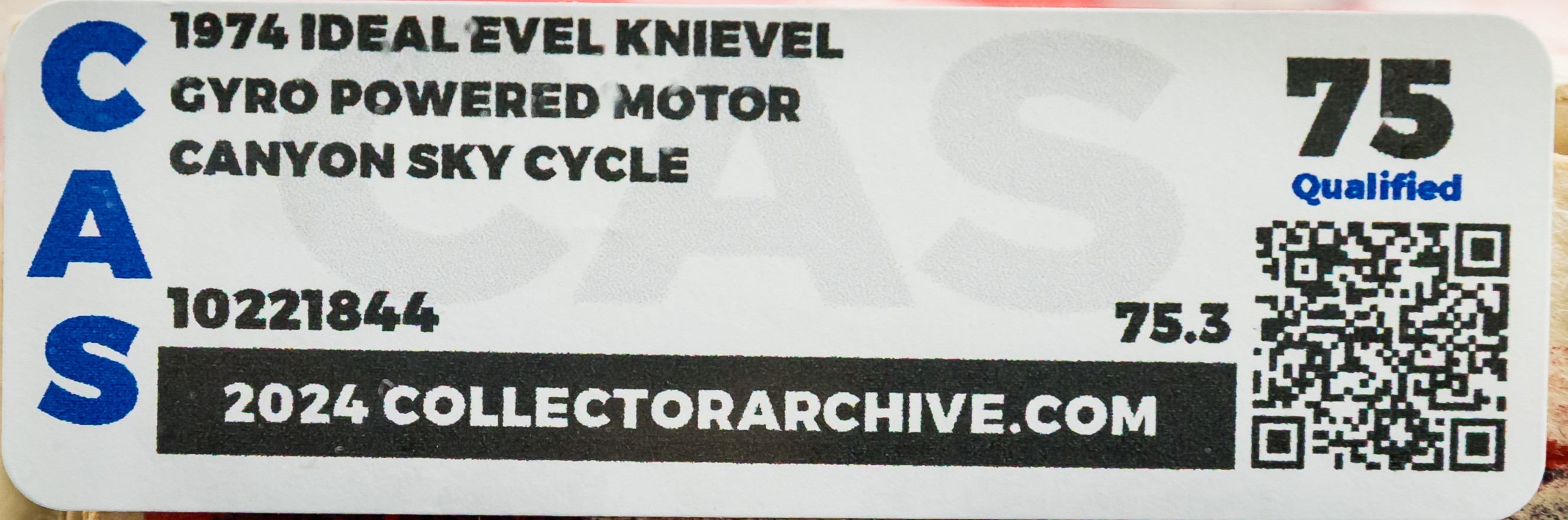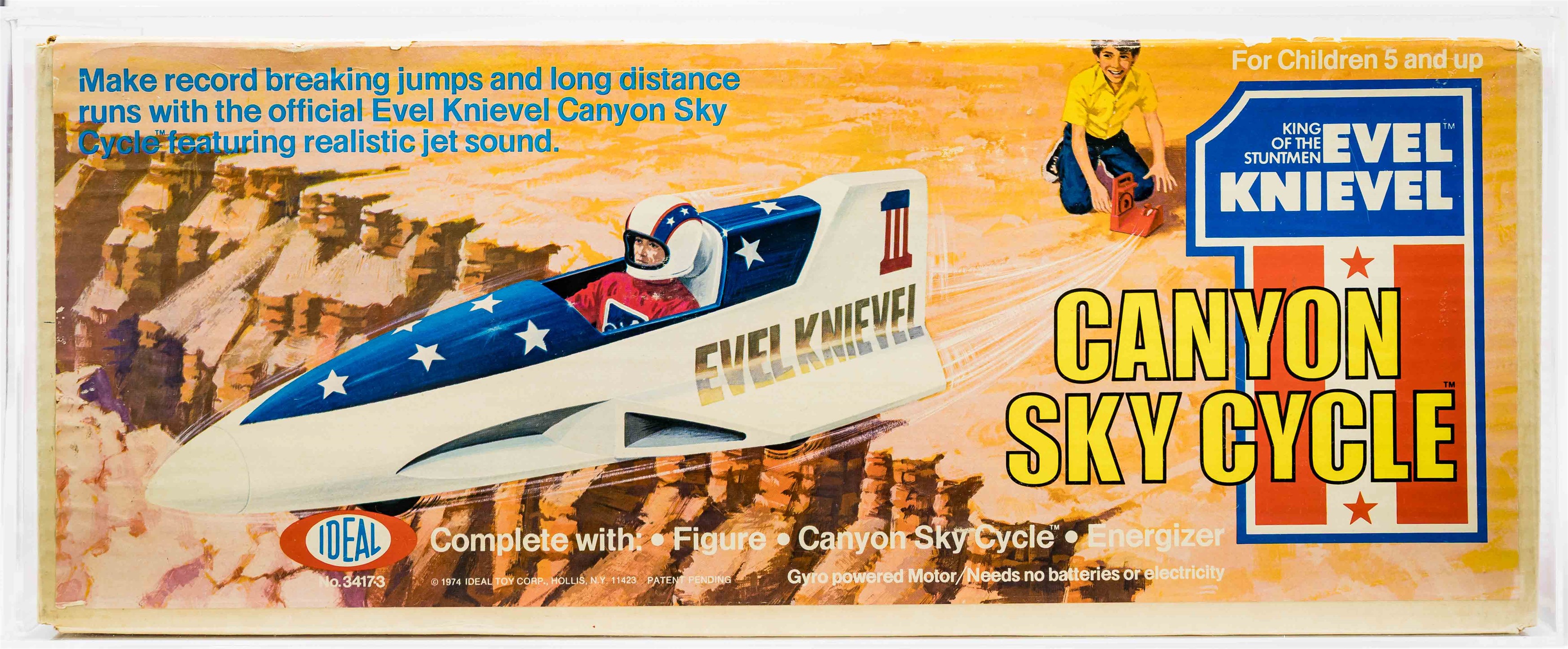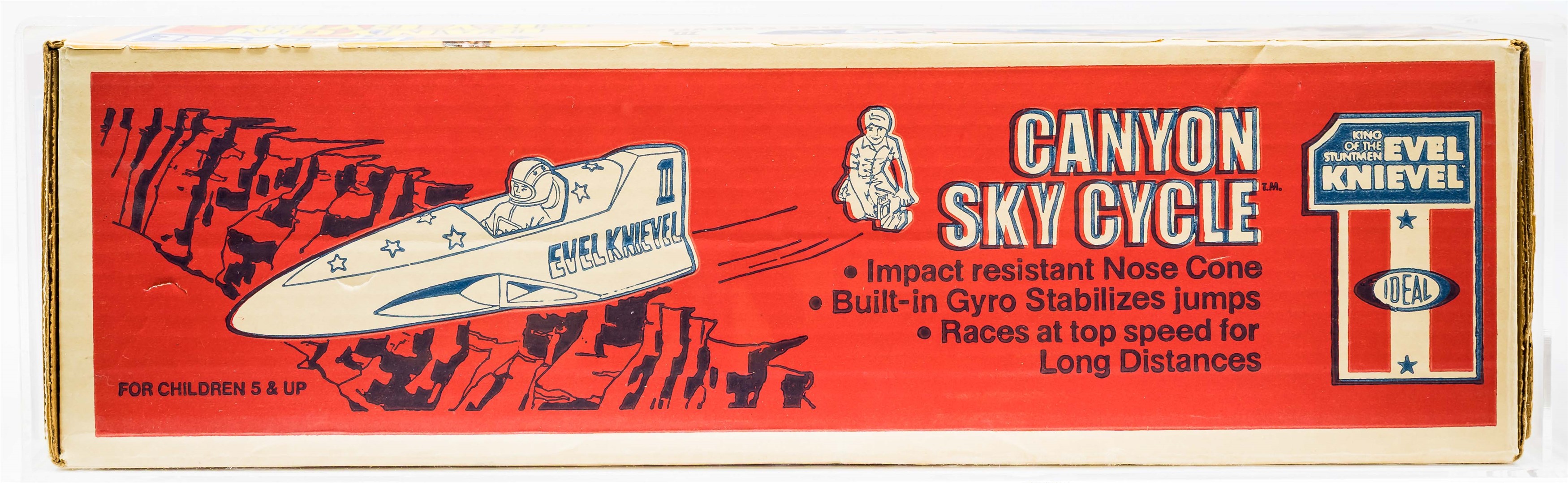 Ultra rare Canyon Sky Cycle from the Evel Knievel toyline released by Ideal in 1974. Factory sealed on one end and opened on the other. CAS has verified the contents within are complete and new/unused. Great display piece that is now over 50 years old! See photos for condition. Approximately 19 x 5.5 x 8 inches. Encapsulated by CAS (75q), #10221844