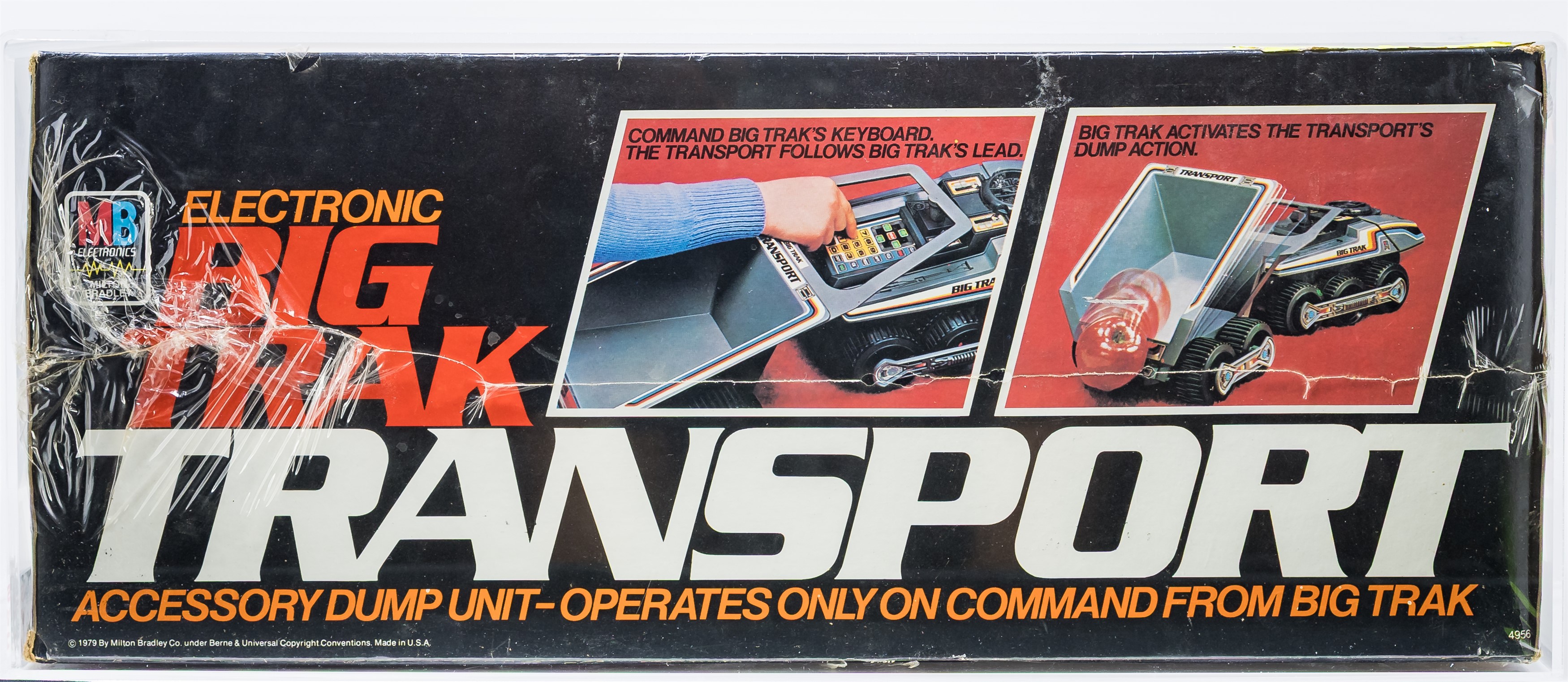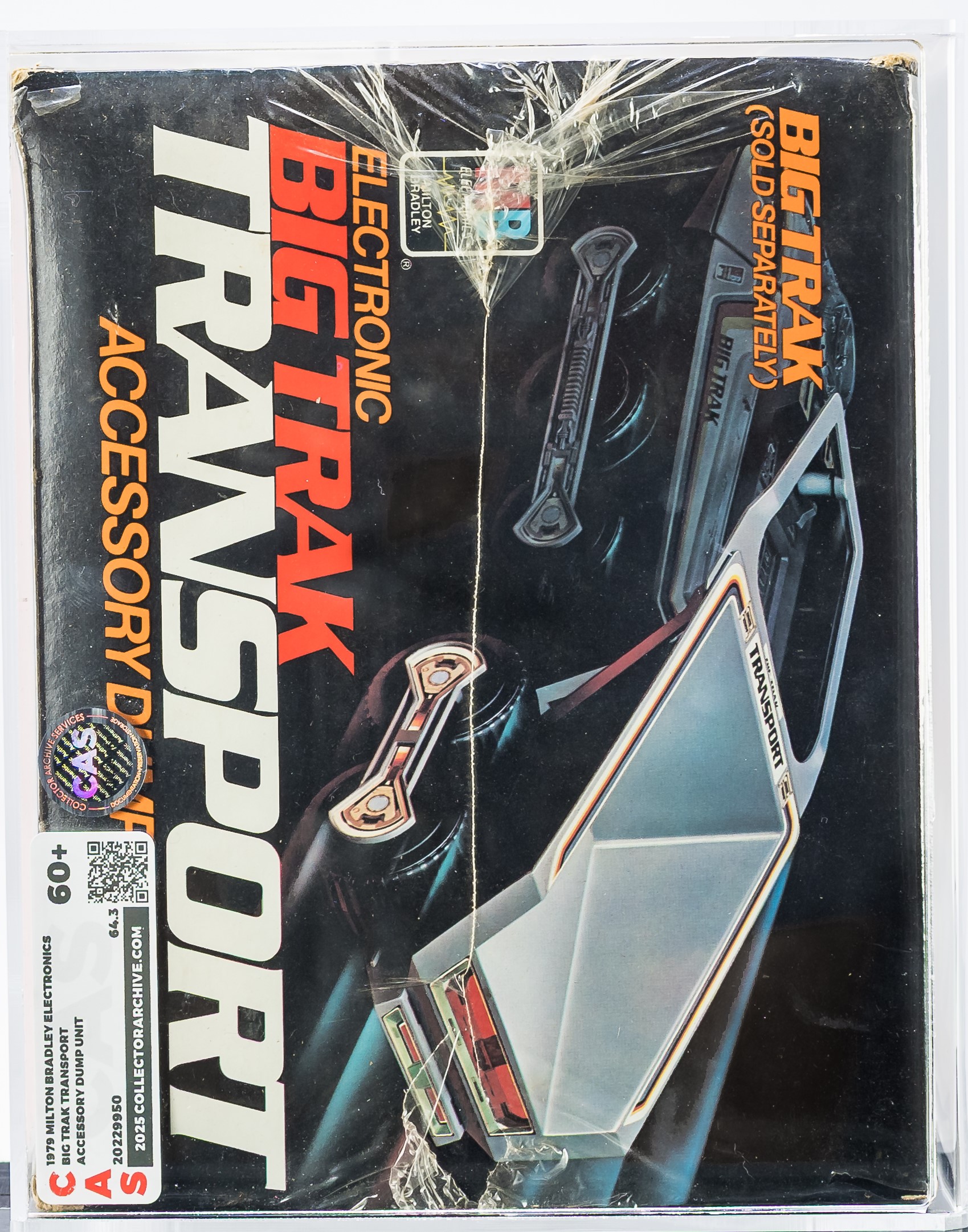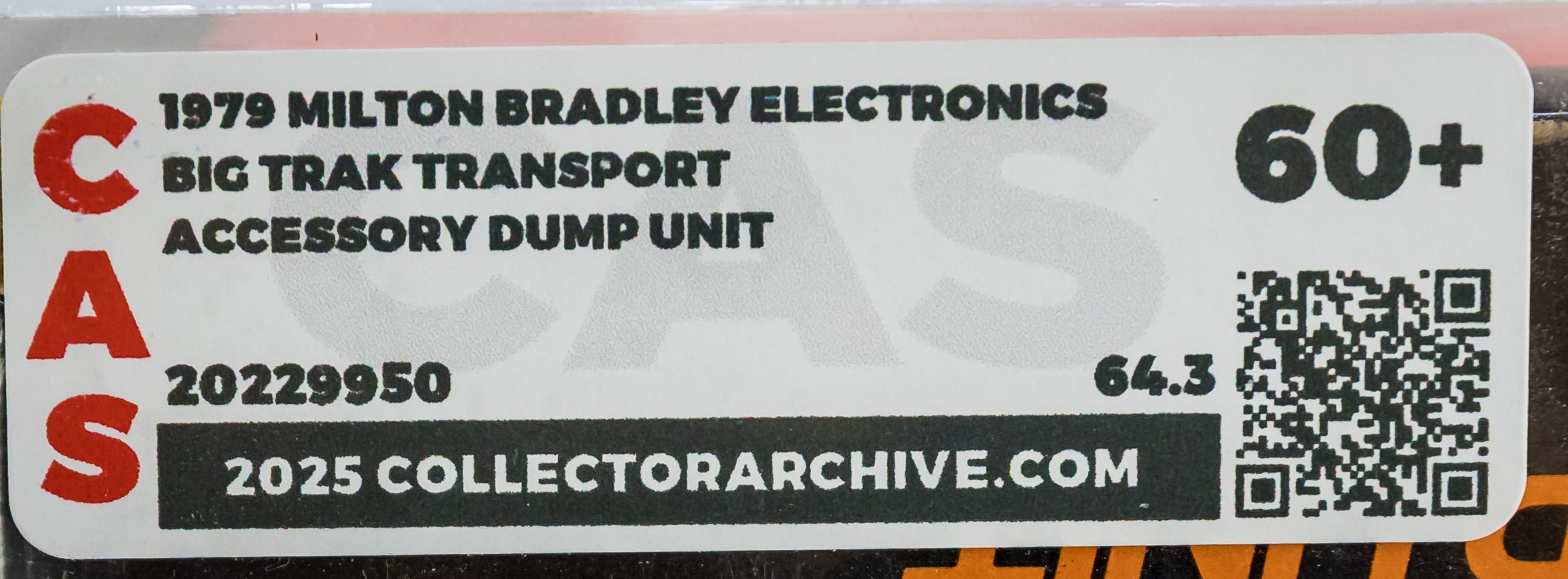 Ultra rare MISB Transport w/ Dumping Action from the Big Trak toyline released by Milton Bradley in 1979. Original plastic cellophane seal is still wrapped around the unit. Various condition issues throughout - see photos. Exceeding rare to find an electronic battery-operated toy from this era that is still factory sealed. Approximately 18.5 x 8 x 9.5 inches. Encapsulated by CAS (60+), #20229950