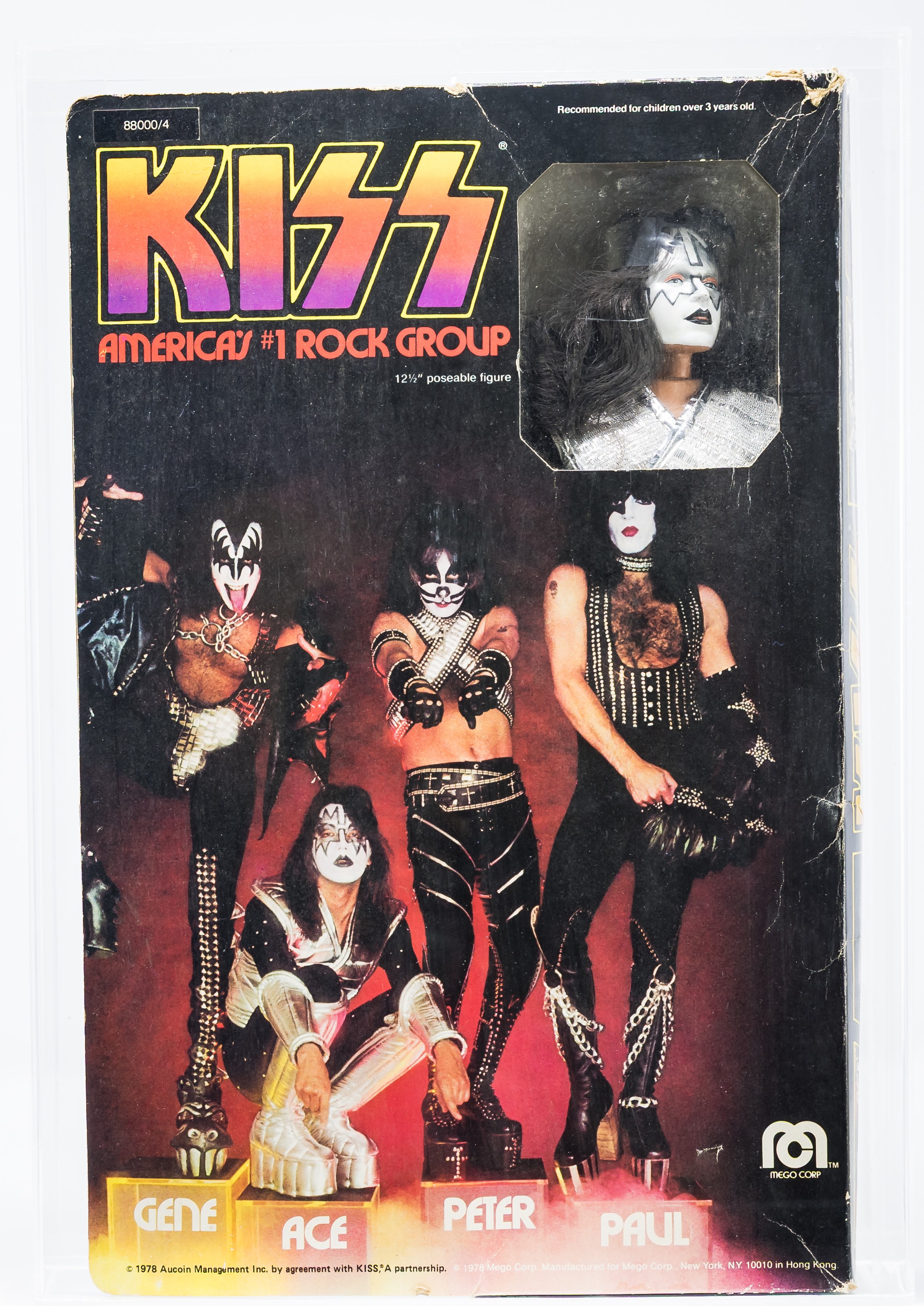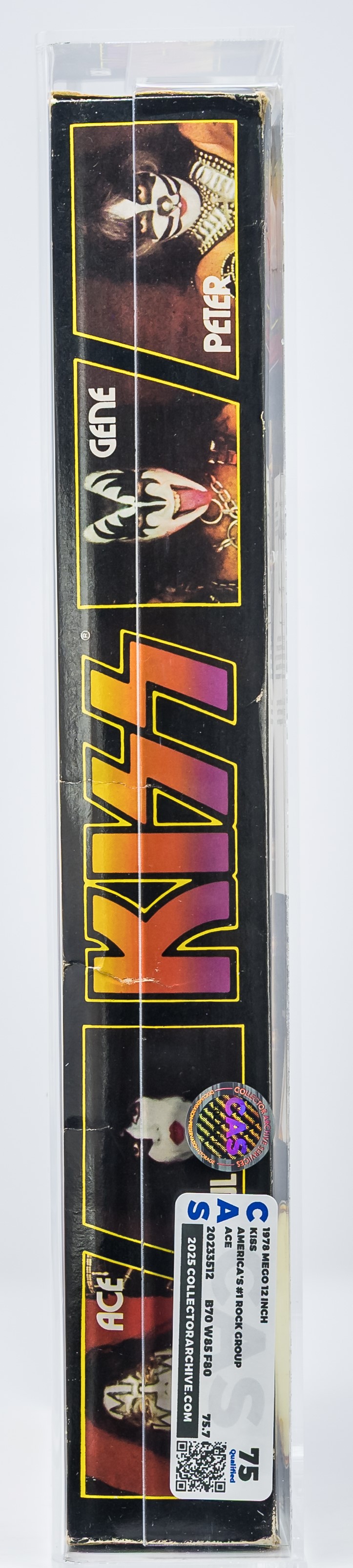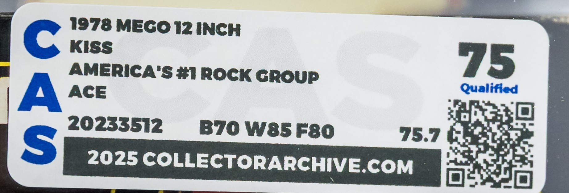 Highly desirable Ace (R.I.P.) figure released by MEGO as part of their KISS: America’s #1 Rock Group 12-Inch Series in 1978. The professionals at CAS have thoroughly inspected the piece and have verified the contents within the box are complete and new/unused. See photos for condition. This auction presents an excellent opportunity to acquire the complete of four encased, graded, and ready to display on shelf. Encapsulated by CAS 75q, (70-85-80) #20233512