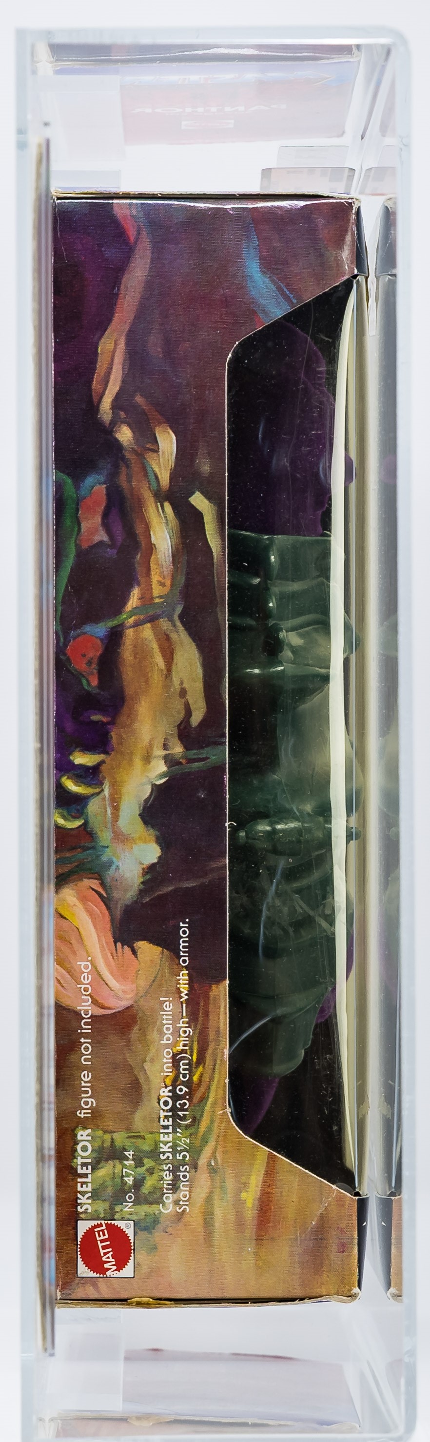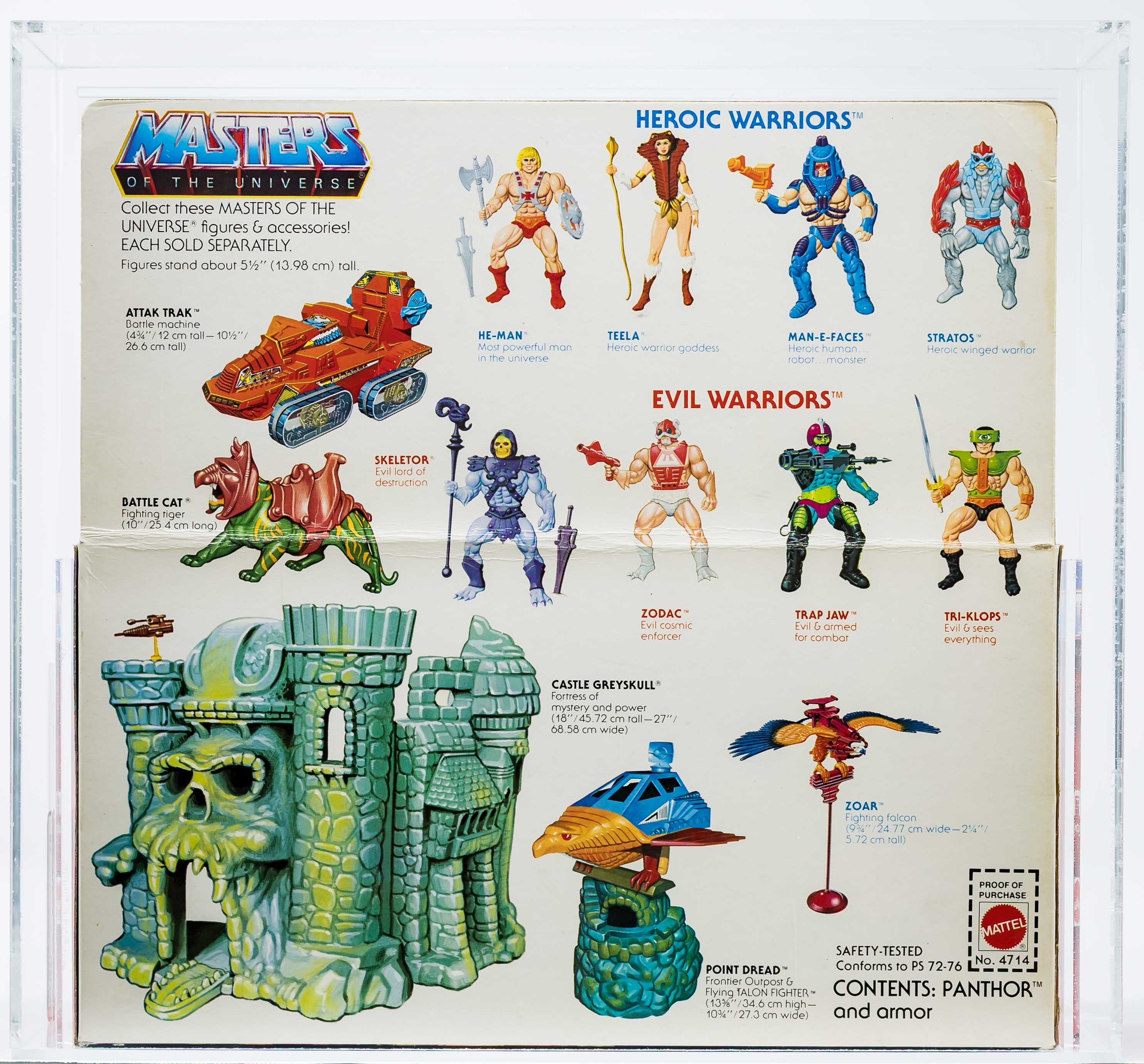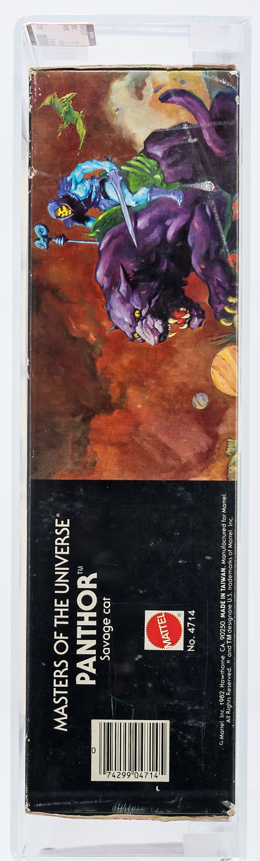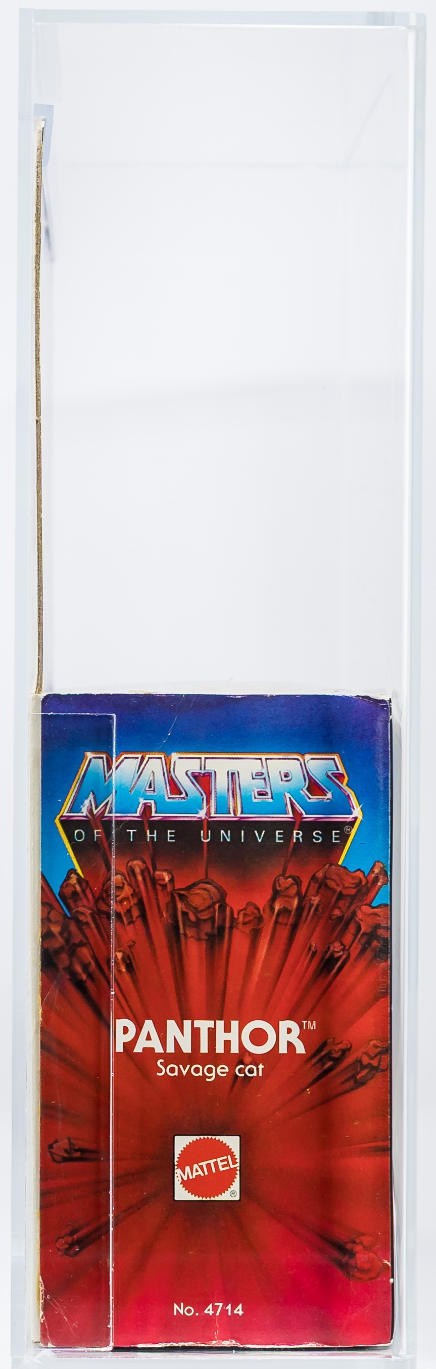 Exceedingly rare MISB first-release Panthor. We searched the auction archives, and this is the first factory sealed example to hit the auction block. It’s widely speculated that Mattel quickly replaced the black backdrop with red because Panthor was too difficult to see. Very few first release examples have survived. Various box imperfections throughout – see photos. Each end is factory tape sealed and there is no colorbreak whatsoever along the front edges. Window is lightly tinted and appropriately assigned a Y (yellowing) designation. Panthor toy within is in mint condition. Overall, a well-presenting example especially from the front. Very rare, the first factory sealed example to hit the auction block. Encapsulated by AFA 75y, (75-80-85) #19267605