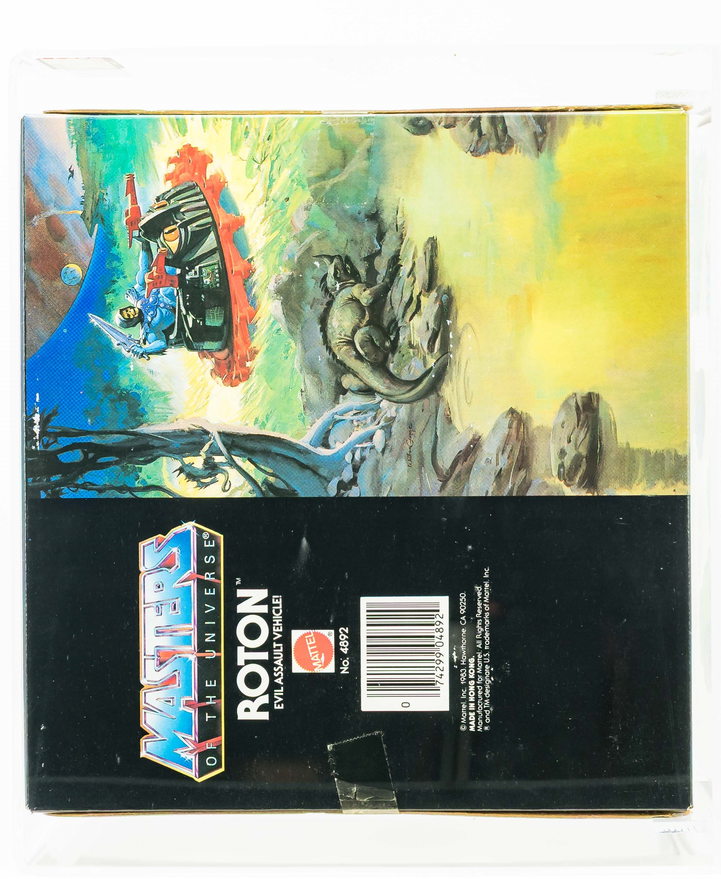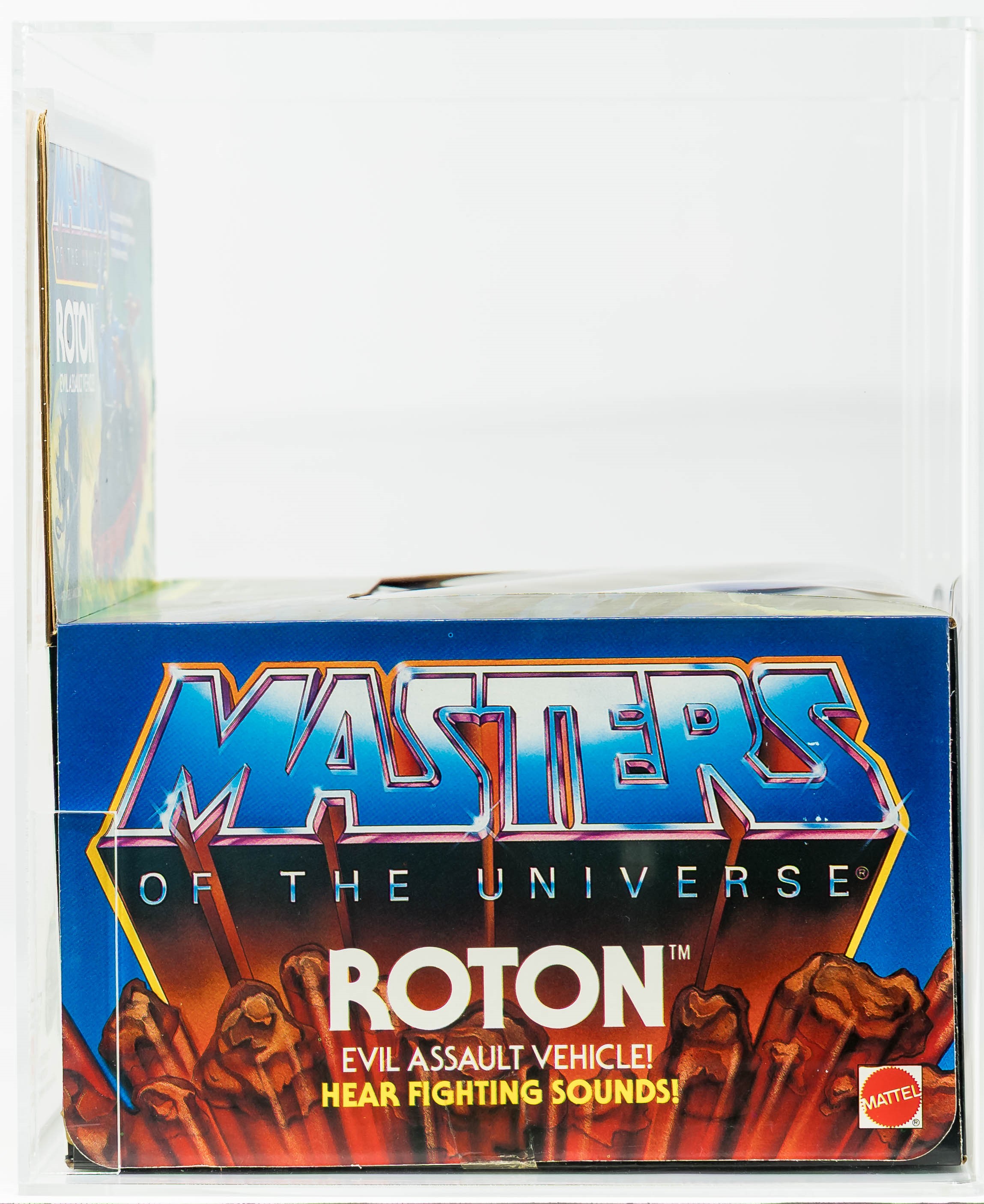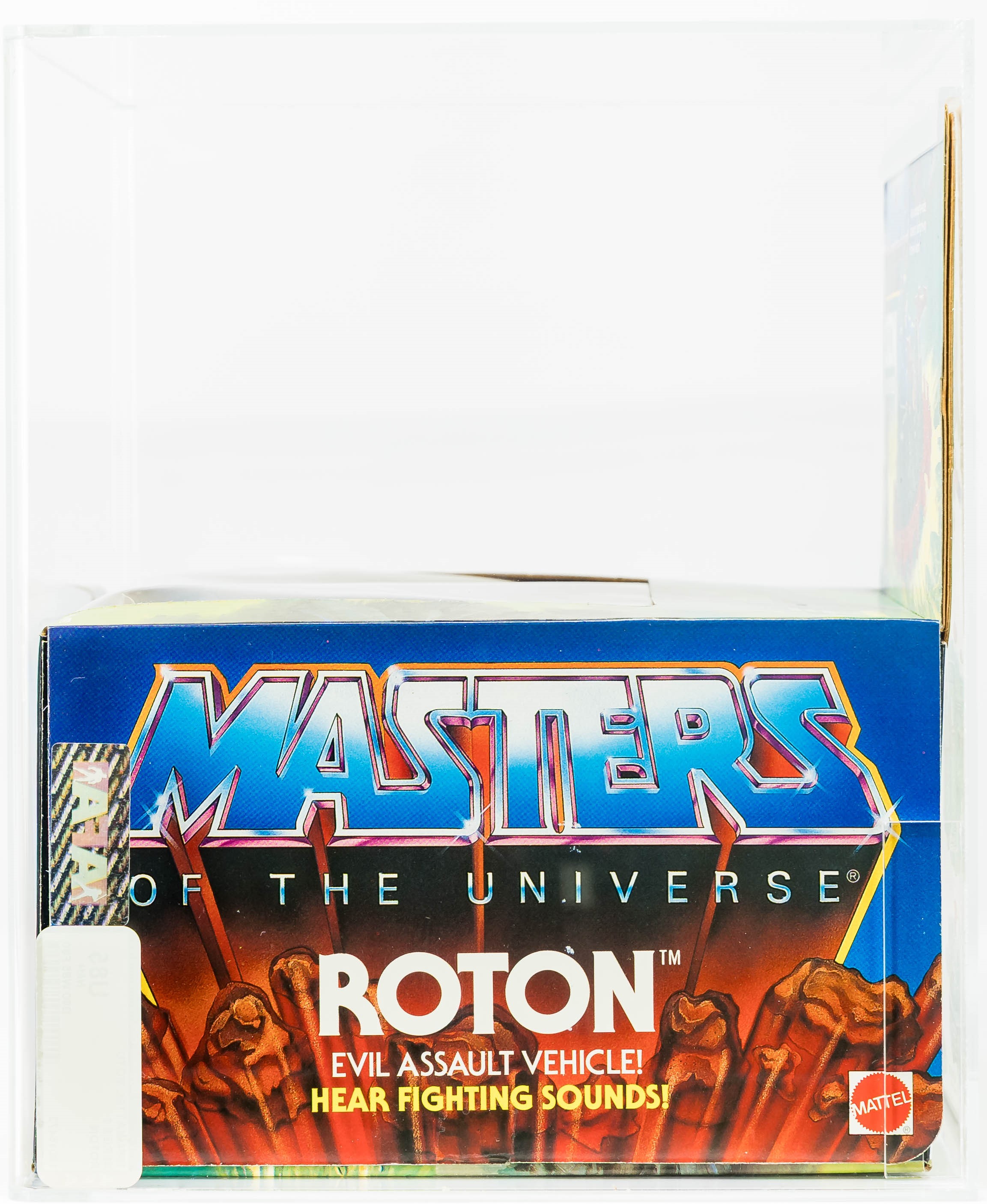 Ultra high-grade MISB Roton released as part of Series 3 in 1984. Immaculate box assigned an impressive “90” subgrade. Uncirculated, this one was pulled straight from a factory sealed case by AFA and immediately graded. In regard to condition, it doesn’t get much better than this. Display window is crystal clear and showcases a pristine Roton vehicle within. It is our opinion that this vehicle is one of the most underrated releases in the MOTU toyline. Gorgeous box art with vehicle within, the winning bidder will not be disappointed. Please note that this vehicle was graded before AFA added the “+” as a grading option. Rest assured; this one is most definitely deserving of that distinction. Approximately 11 x 9.5 x 11 inches. Encapsulated by AFA (U85, 90-85-90), #18016473