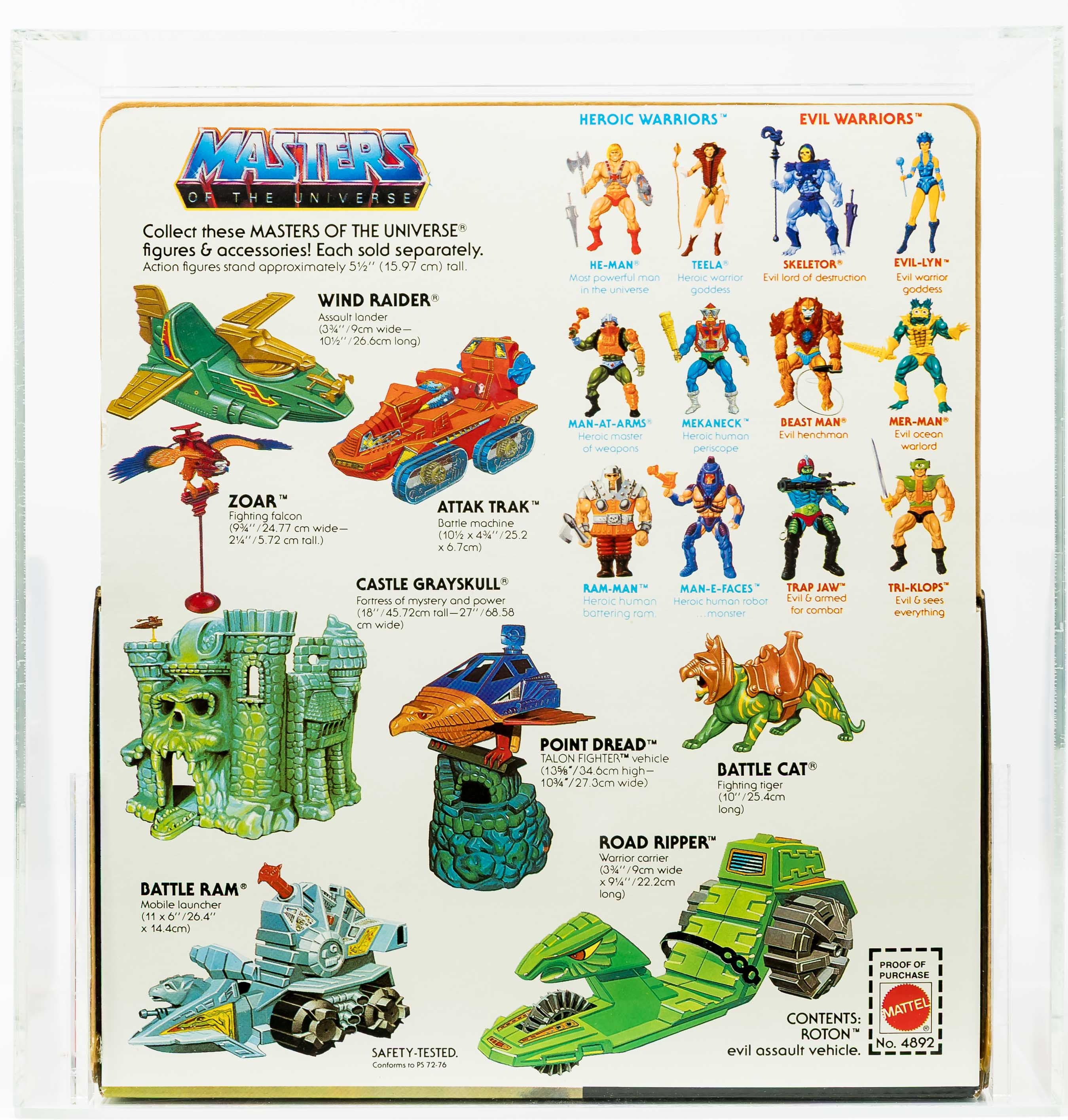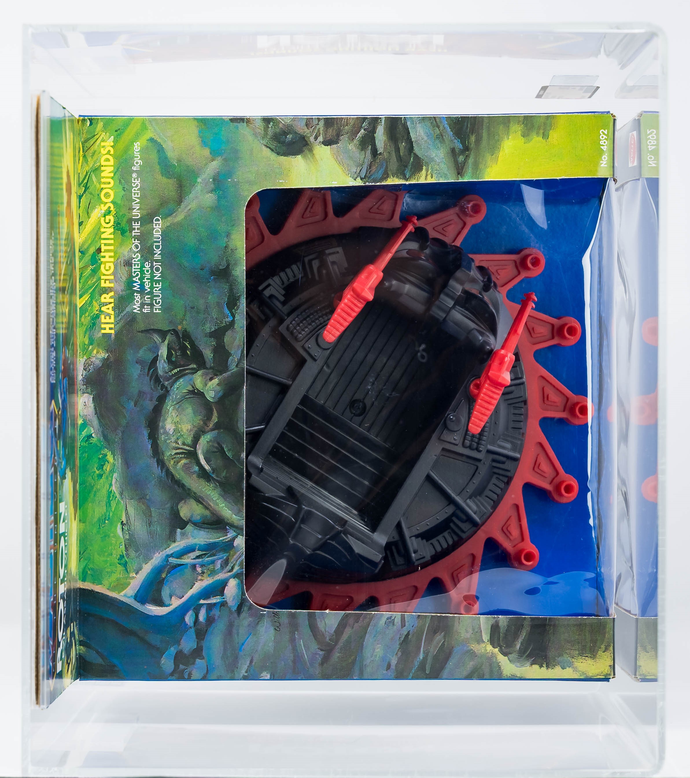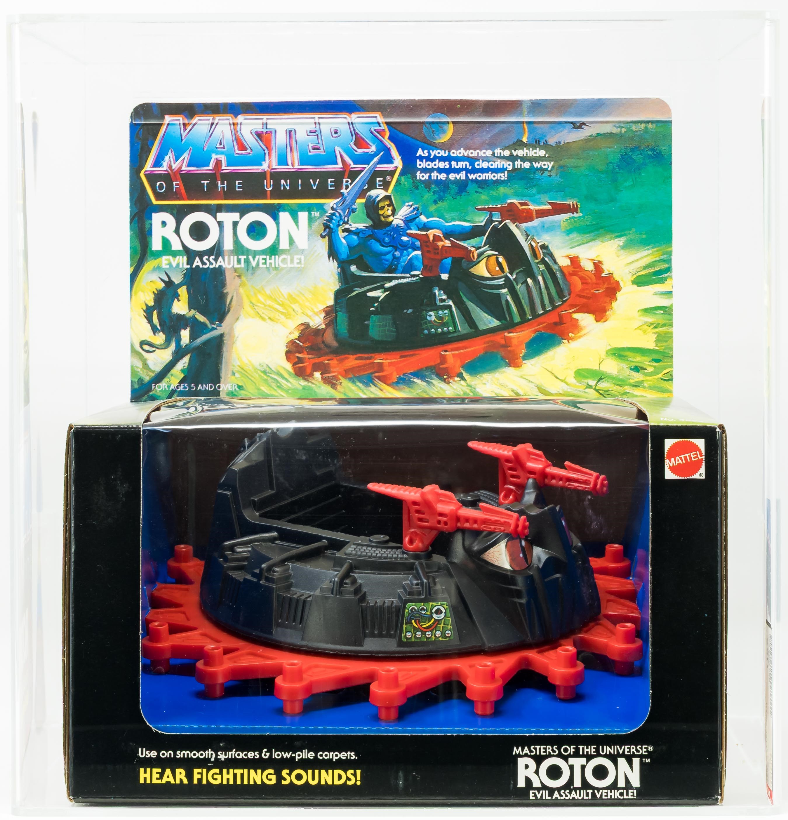 Ultra high-grade MISB Roton released as part of Series 3 in 1984. Immaculate box assigned an impressive “90” subgrade. Uncirculated, this one was pulled straight from a factory sealed case by AFA and immediately graded. In regard to condition, it doesn’t get much better than this. Display window is crystal clear and showcases a pristine Roton vehicle within. It is our opinion that this vehicle is one of the most underrated releases in the MOTU toyline. Gorgeous box art with vehicle within, the winning bidder will not be disappointed. Please note that this vehicle was graded before AFA added the “+” as a grading option. Rest assured; this one is most definitely deserving of that distinction. Approximately 11 x 9.5 x 11 inches. Encapsulated by AFA (U85, 90-85-90), #18016473
