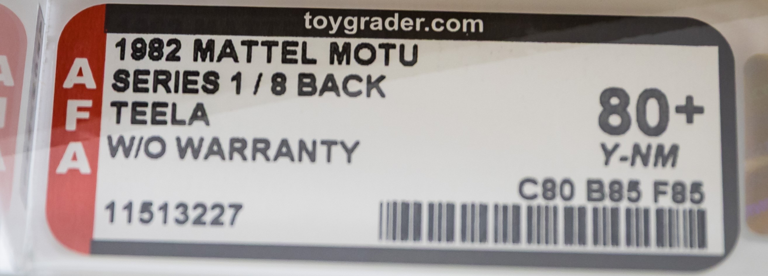 First release Teela in impressive AFA 80+ grade with very rare He-Man and the Power Sword mini comic. Teela was never released on TEST MARKET card. This is her first release. She was later released on the 3rd version 8-Back card (the card’s reverse includes a large Warranty message at the bottom). Our example sports an impressive card front and back with few blemishes. Vintage $4.97 Kmart price tag sticker on front. The bubble is clear and retains perfect form. The tray within the bubble has yellowed resulting in a Y designation. The Teela action figure is outside of the tray and according to our consignor, she was in this position when graded. The plastic bag at her ankles is clear and Teela herself appears to be in mint condition. Behind her is the He-Man and the Power Sword mini comic with FREE text burst. This is the first mini comic featuring Alfredo Alcala’s artwork. Overall, a very impressive, high-grade, first-release example, the best we have offered in our auctions. G1, Made in Taiwan. Encapsulated by AFA 80+y, (80-85-85) #11513227