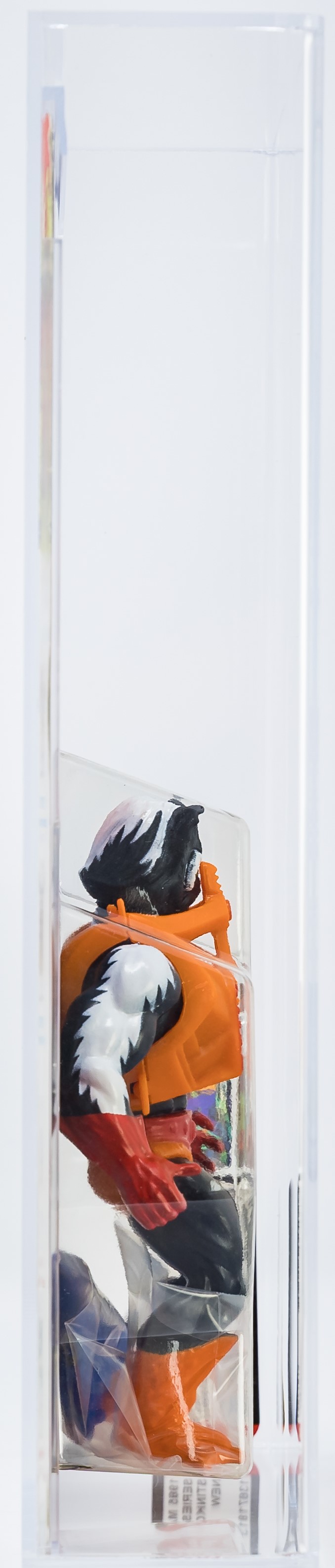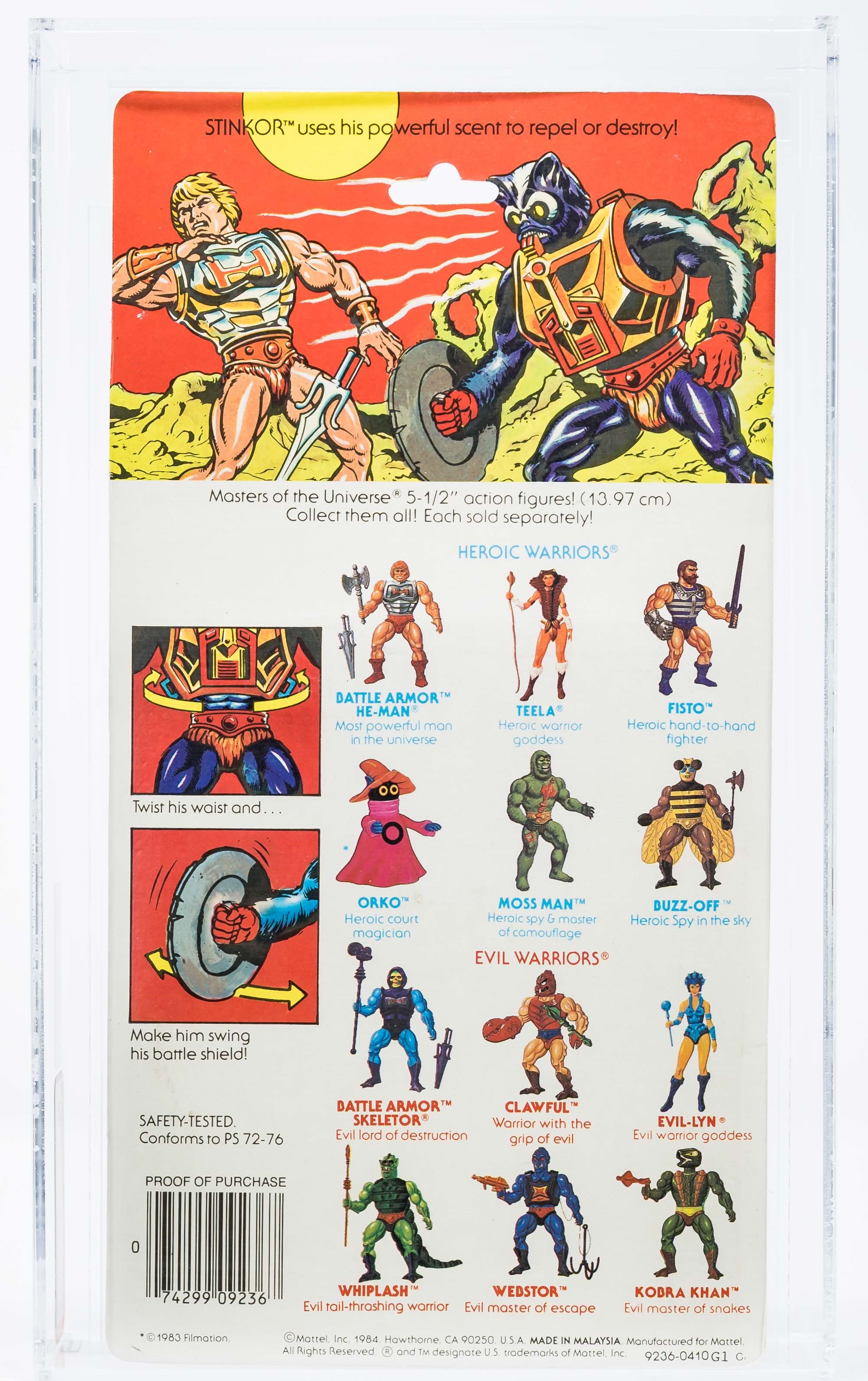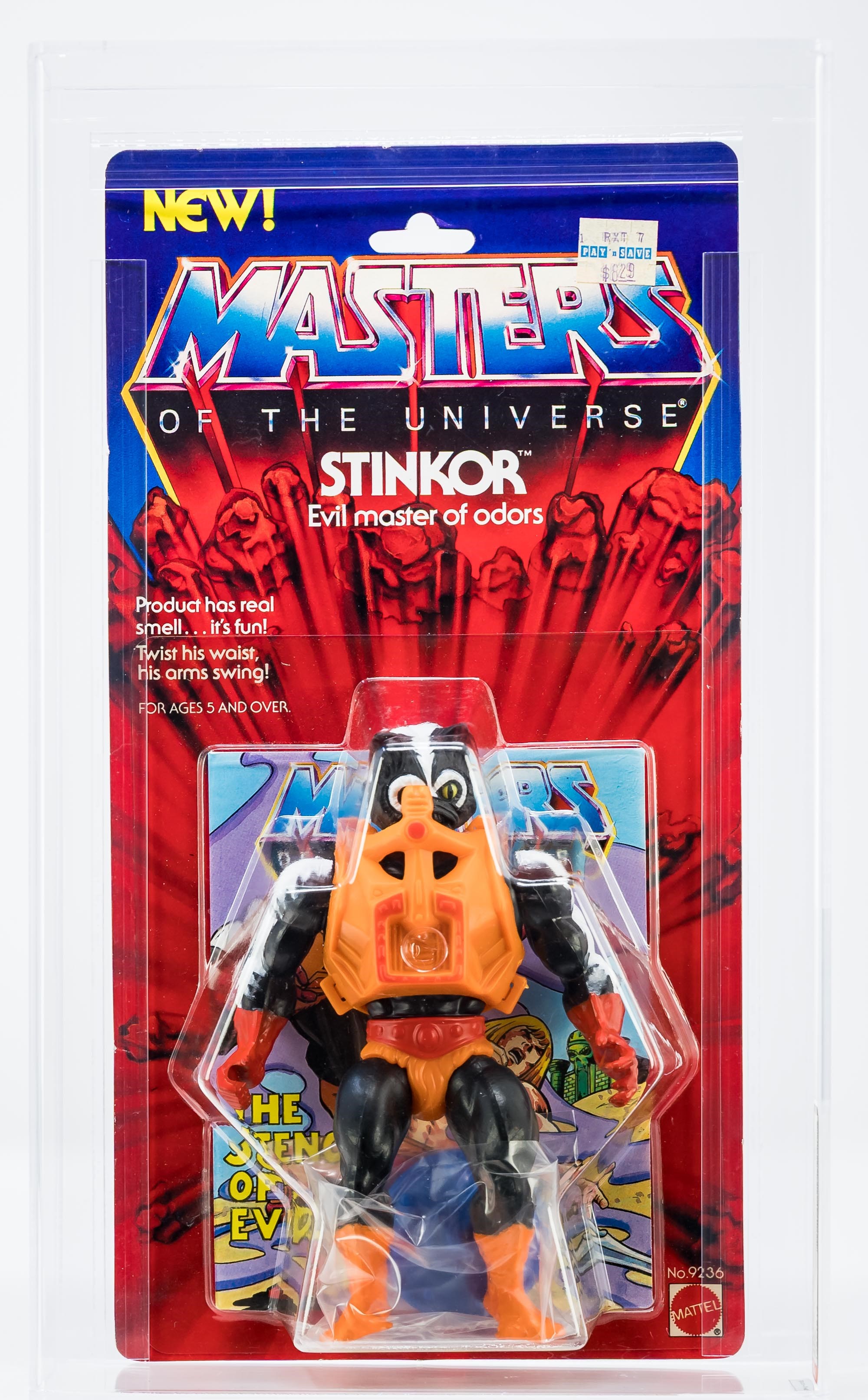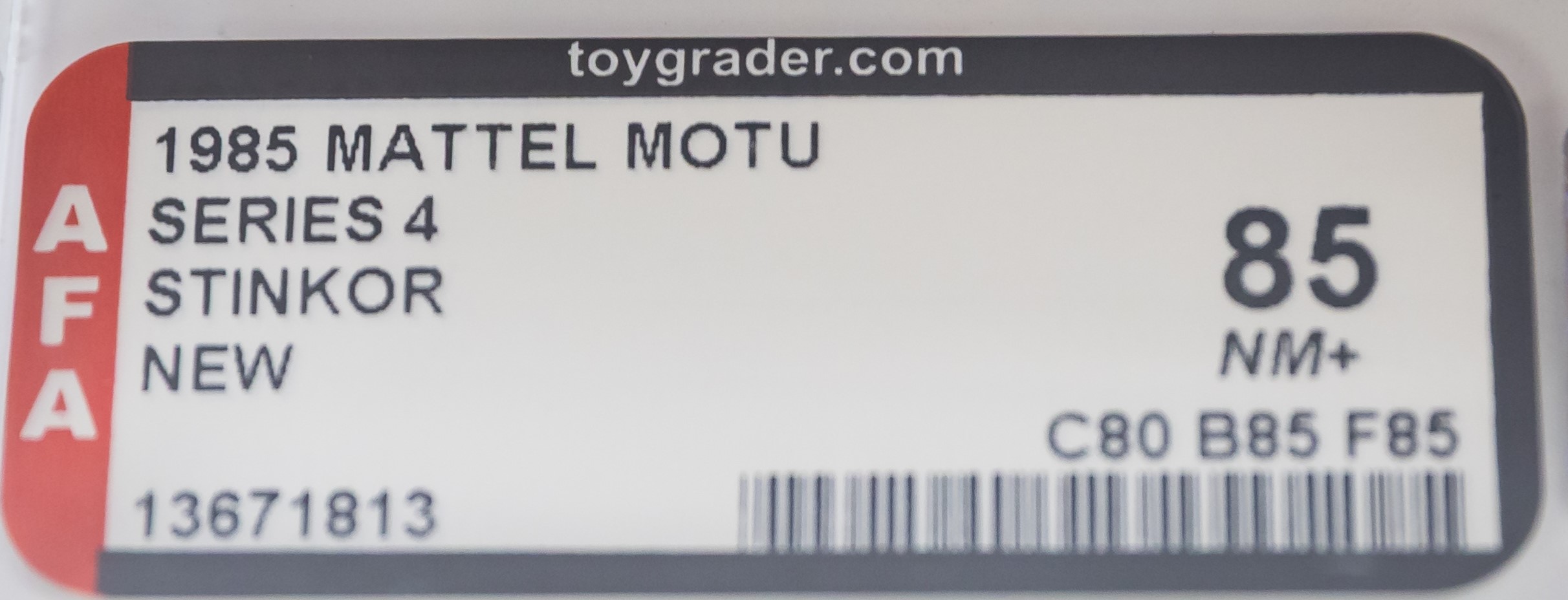 Ultra high-grade first release Stinkor from Series 4 released in 1985. Gorgeous example that checks a lot of boxes. Beautiful card with few imperfections. All-important yellow “NEW!” logo found in the upper corner, denoting first release. Bubble is firmly attached to card with just a touch of tint when carefully examined in a light box. Bubble retains perfect form with no dents or cracks. Skintor figure within looks fantastic. One of the best examples in existence. G1, Made in Malaysia. Encapsulated by AFA 85, (80-85-85) #13671813