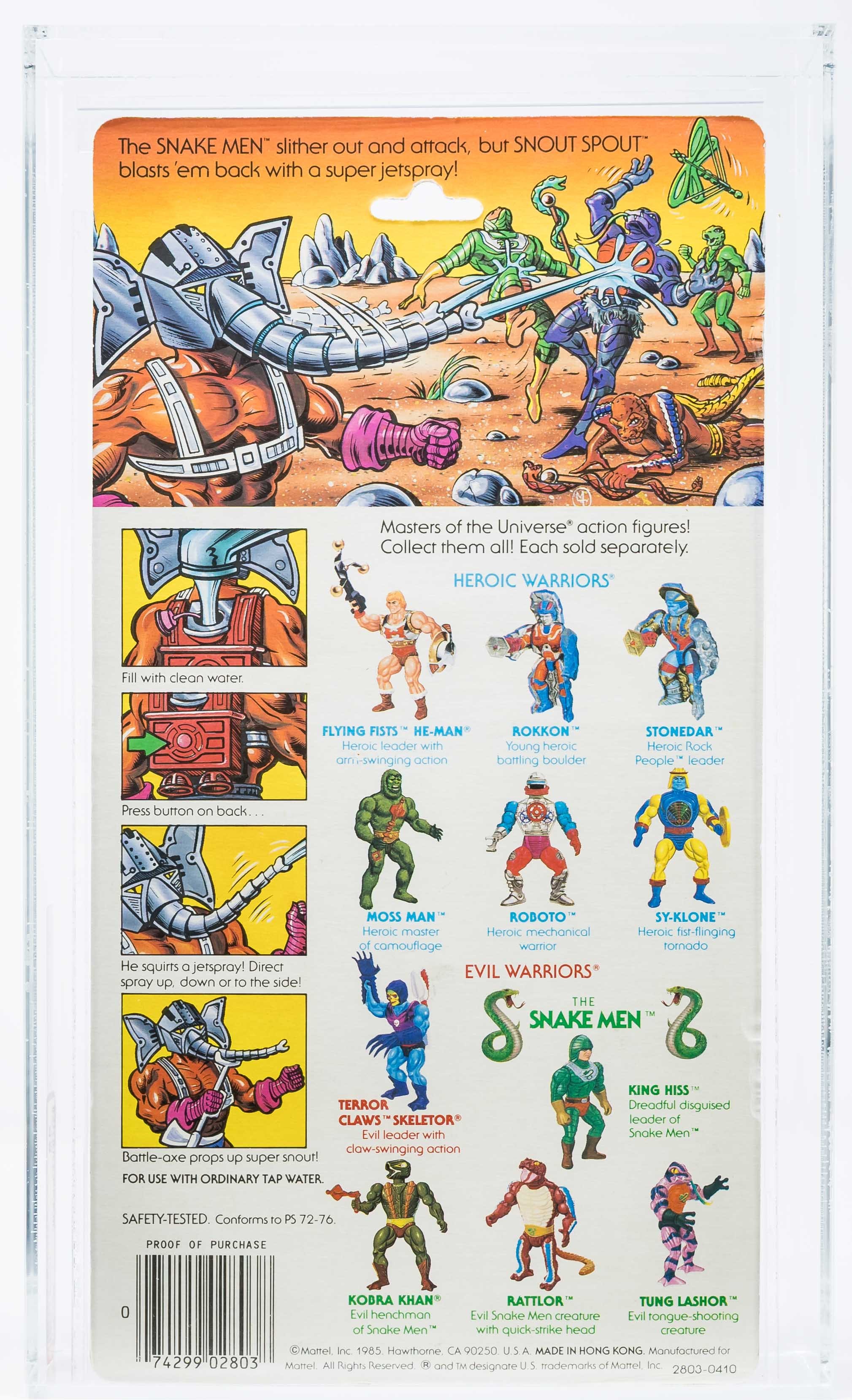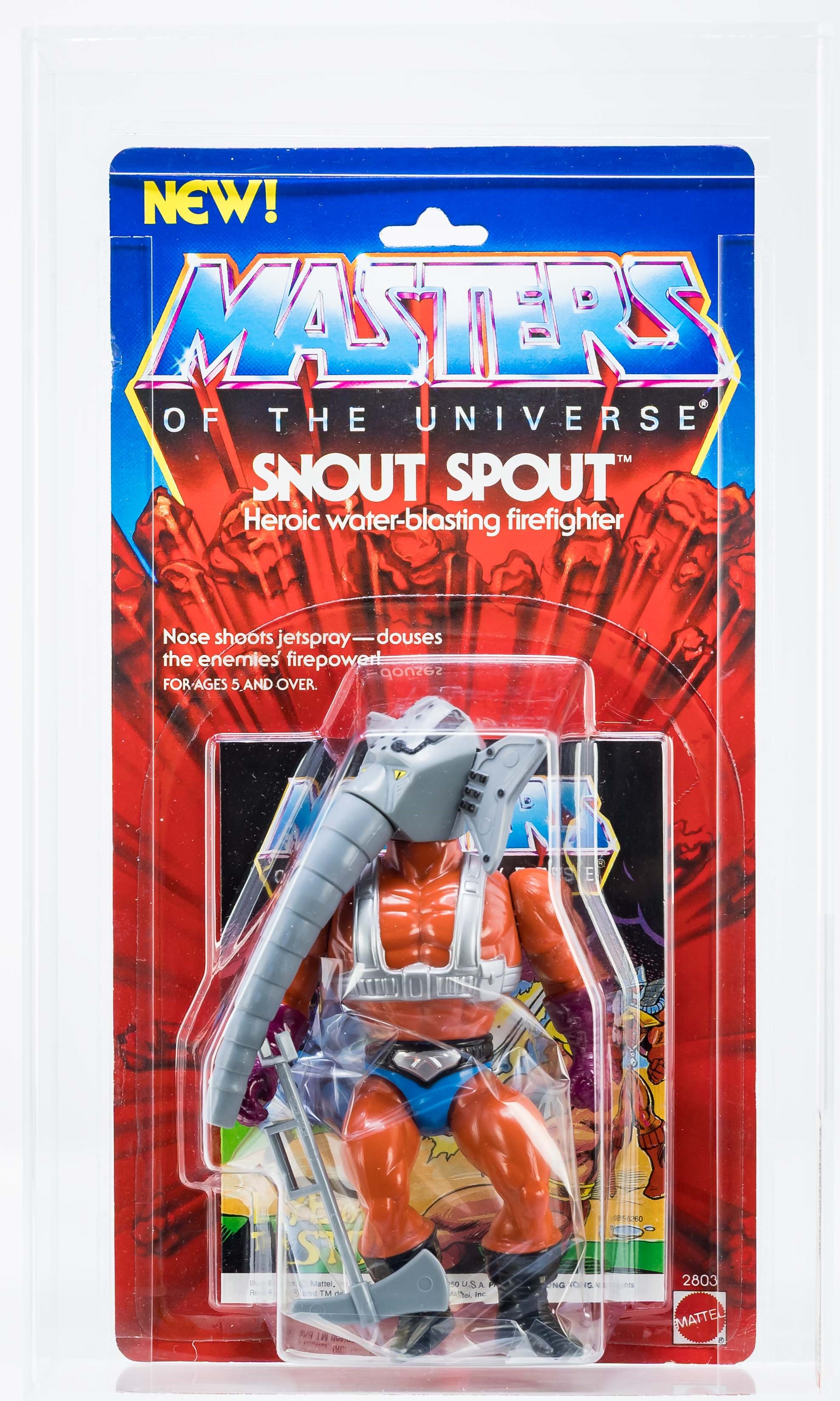 Ultra high-grade first release Snout Spout from Series 5 released in 1986. Gorgeous example that checks a lot of boxes. Beautiful card with few imperfections. All-important yellow “NEW!” logo found in the upper corner, denoting first release. Bubble is firmly attached to card and is crystal clear. Bubble retains perfect form with no dents or cracks. Snout Spout action figure within looks fantastic. One of the best examples in existence. Made in Hong Kong. Encapsulated by AFA 85, (80-85-85) #11531289