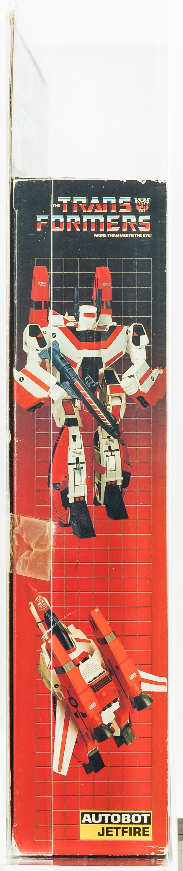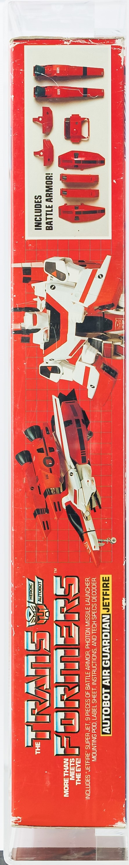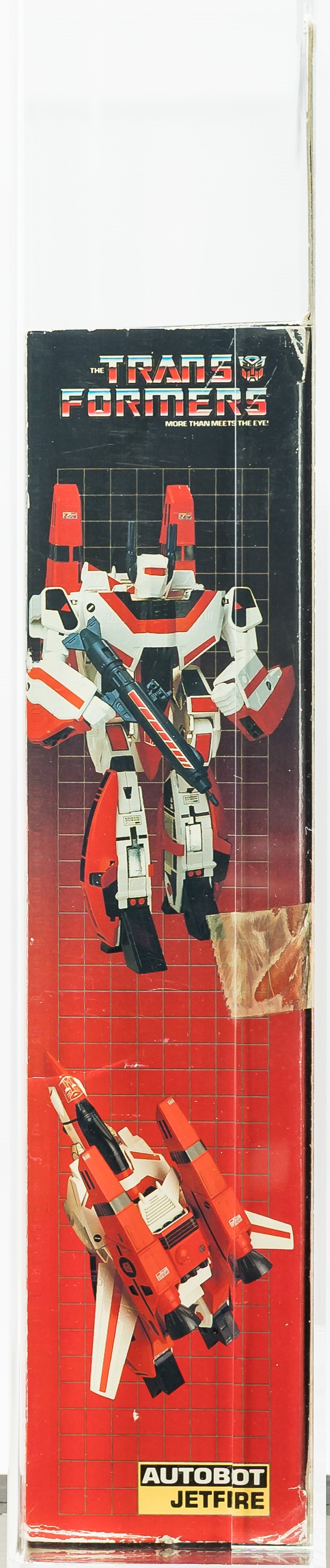 Early release Jetfire from Series 2 in 1985. We know it’s an early release as evidenced by the TM (instead of “®”) attached to the TRANSFORMERS logo. Box has various blemishes throughout as seen in the photos provided. Please note there is a small piece of Styrofoam loose within the box located near the jet. The left side includes factory tape (drying) and there is a very light colorbreak along the left front edge. The right side also includes factory tape (drying) with a more pronounced colorbreak along the right front edge – it appears the box was opened from the right. AFA has verified the jet, accessories, instructions and promotional material are complete and unused within. Window is crystal clear. One of the more popular G1 releases. Approximately 20 x 3 x 16.5 inches.