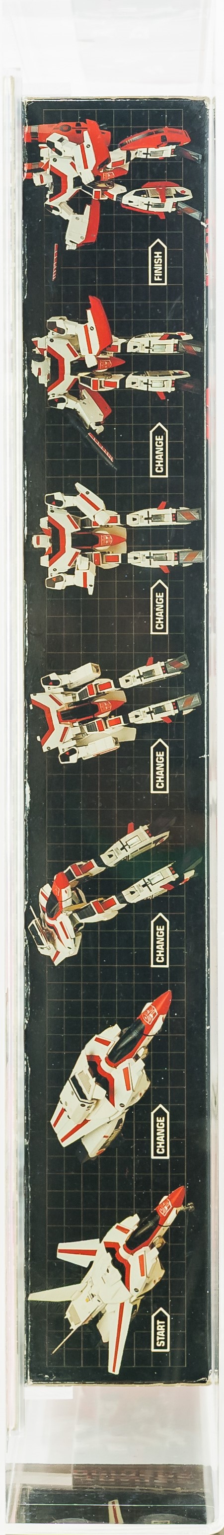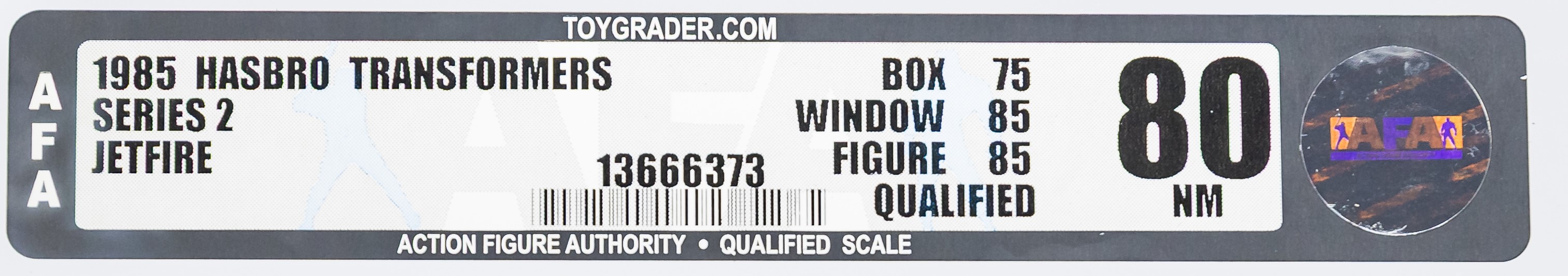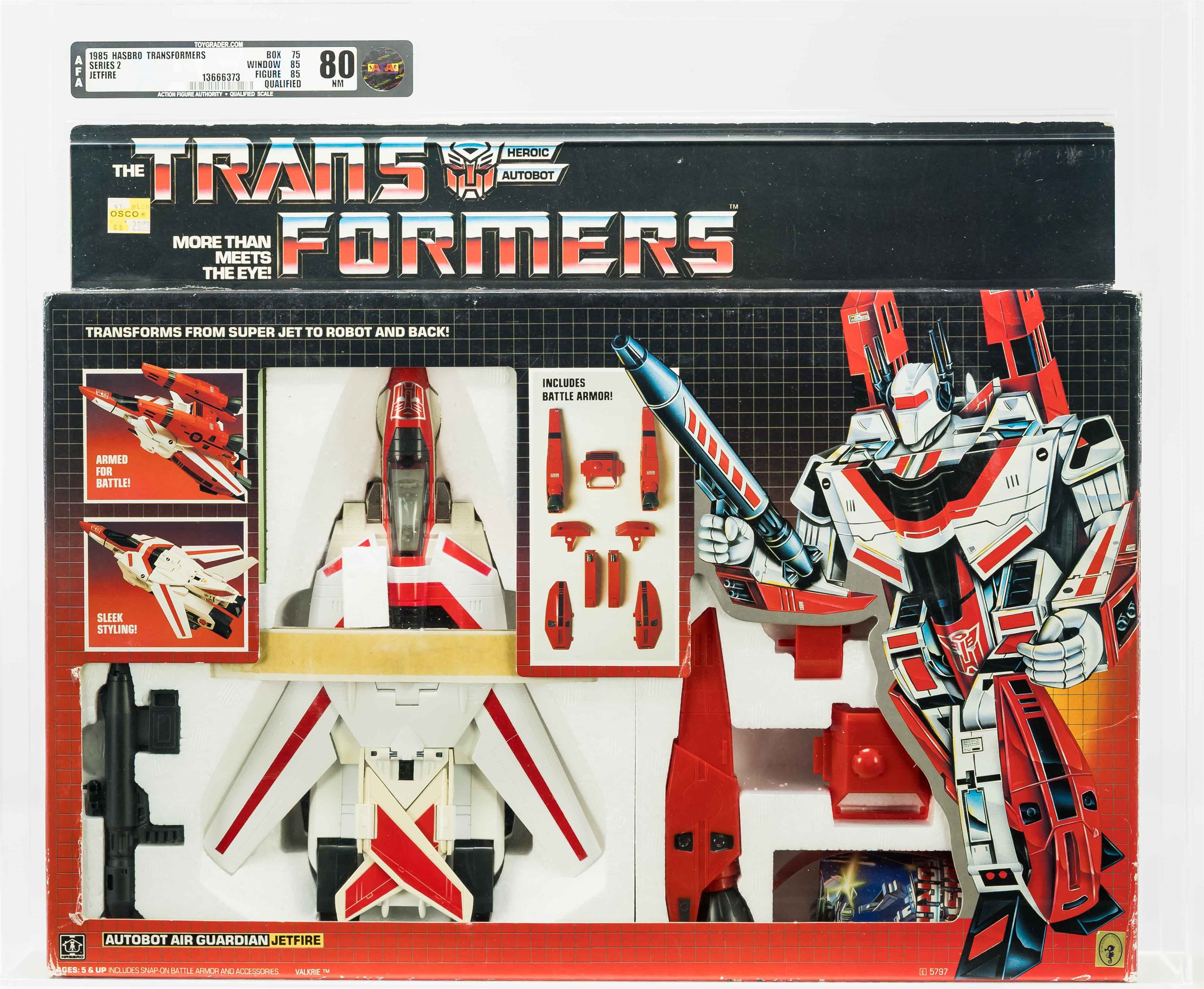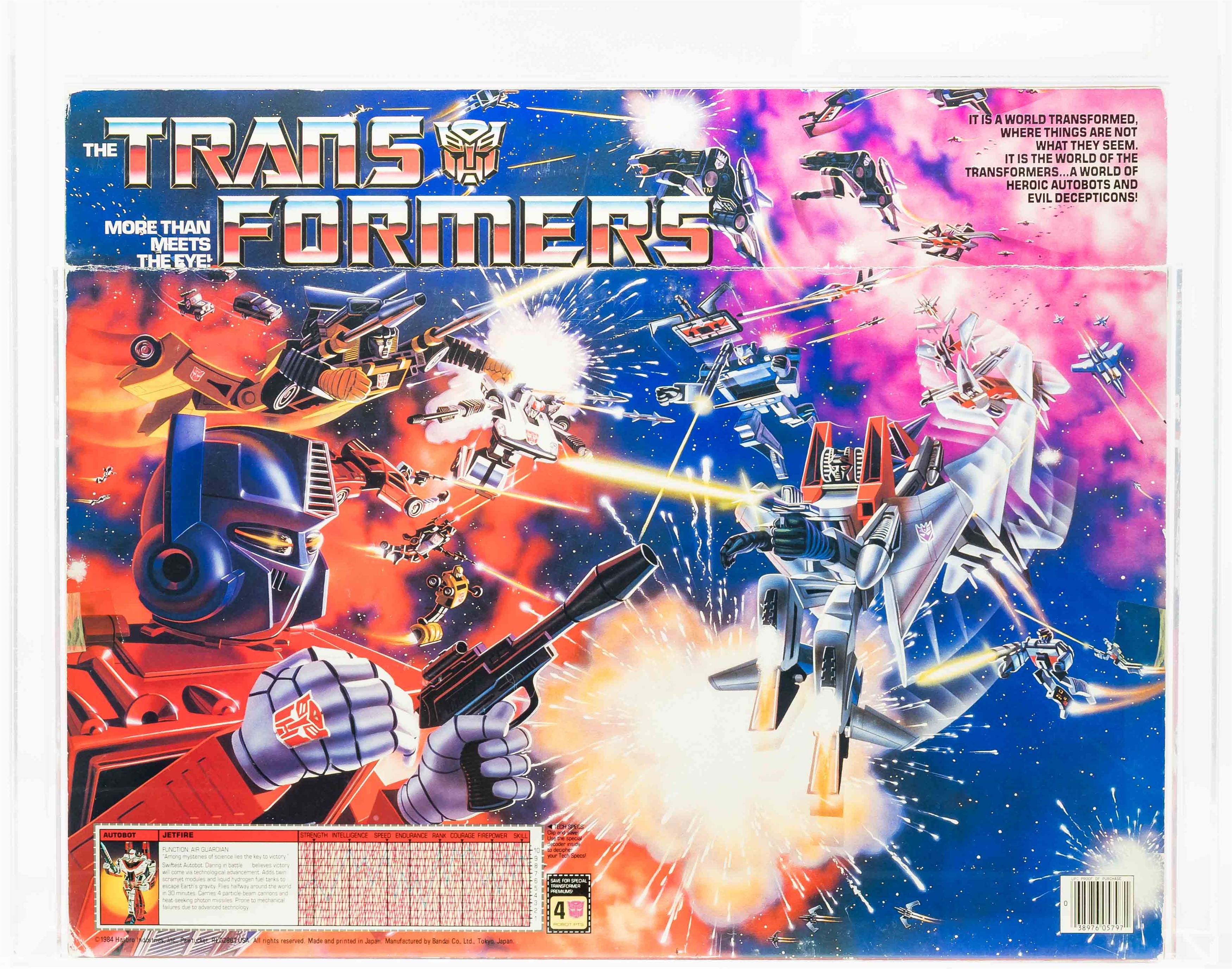 Early release Jetfire from Series 2 in 1985. We know it’s an early release as evidenced by the TM (instead of “®”) attached to the TRANSFORMERS logo. Box has various blemishes throughout as seen in the photos provided. Please note there is a small piece of Styrofoam loose within the box located near the jet. The left side includes factory tape (drying) and there is a very light colorbreak along the left front edge. The right side also includes factory tape (drying) with a more pronounced colorbreak along the right front edge – it appears the box was opened from the right. AFA has verified the jet, accessories, instructions and promotional material are complete and unused within. Window is crystal clear. One of the more popular G1 releases. Approximately 20 x 3 x 16.5 inches.