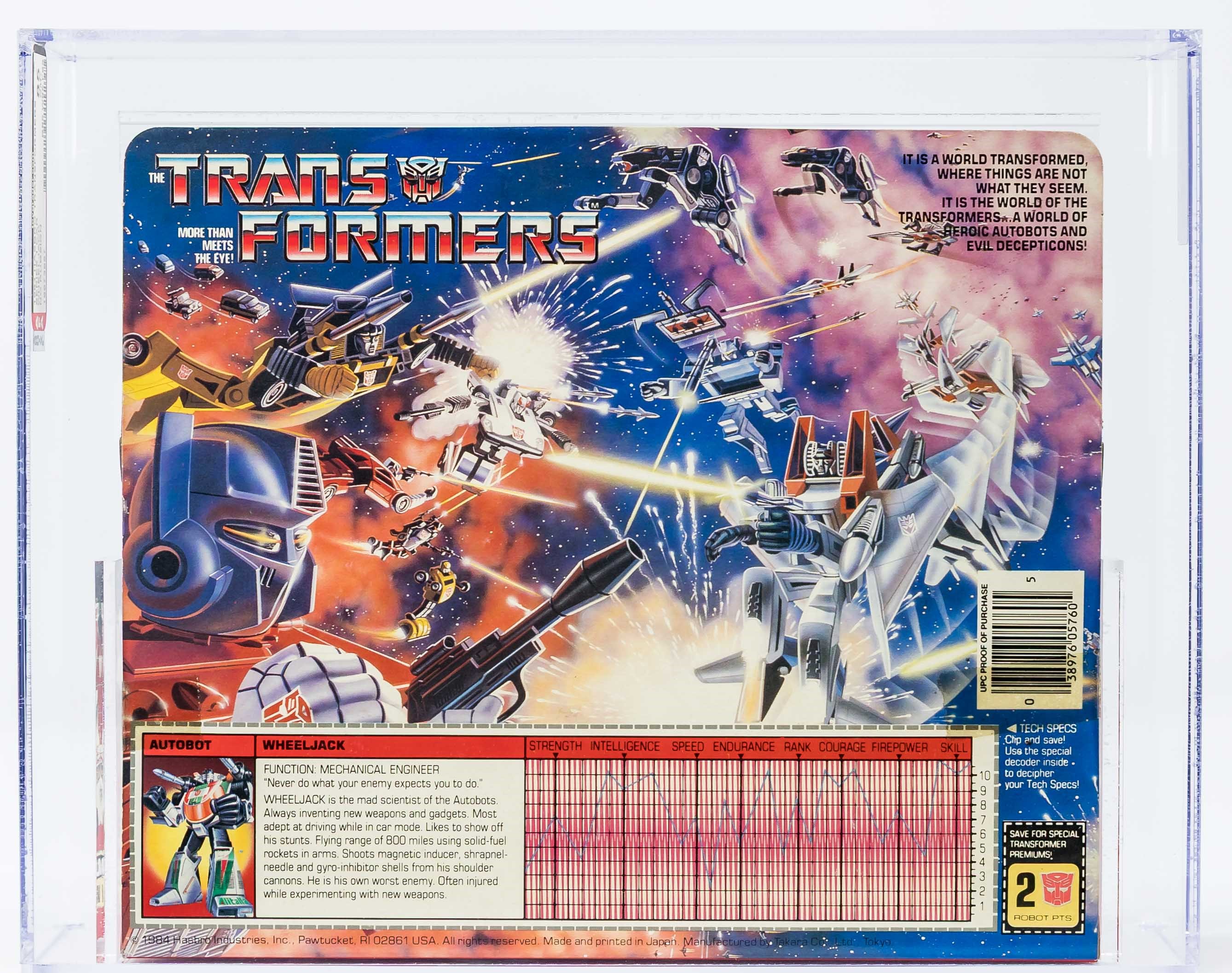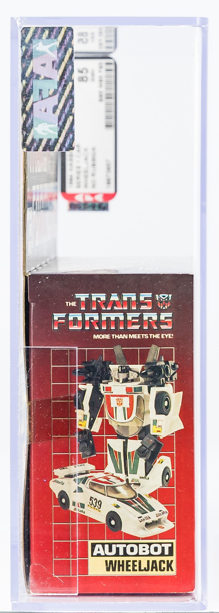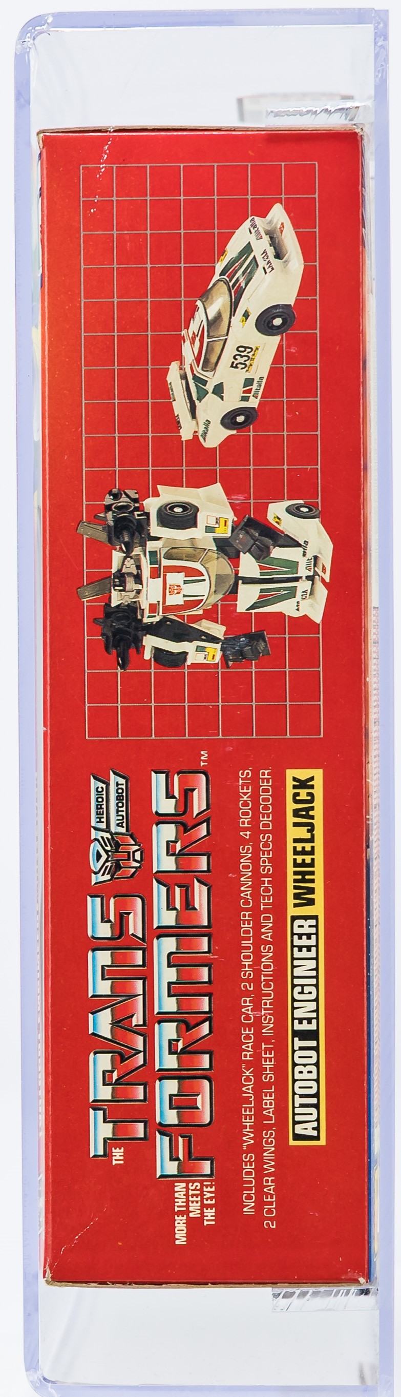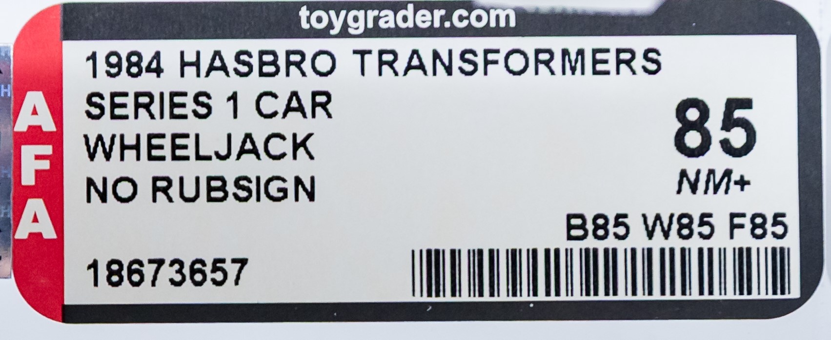 Crisp, high-grade early release MISB example of elusive Series One car: Wheeljack. This MISB prerub stunner is one of the premier cars in the entire G1 line. Extremely sharp, this piece presents exceptionally well with few blemishes. Factory tape adorns each end and no colorbreak whatsoever exists along the edges. The reverse is flawless and free of the typical G1 flap crease.  Display window is clear with no yellowing. We must note that there is some figure rub on the bubble and on the window near the rear wheel. Bubble that holds Wheeljack in place is clear and is firmly attached to the cardboard backing. Overall, an outstanding high-grade example. Wheeljack is one of the cars that is instantly recognizable to all G1 collectors, and as such, is one of the great Series 1 pieces in our hobby.  Encapsulated by AFA (85, 85-85-85), #18673657