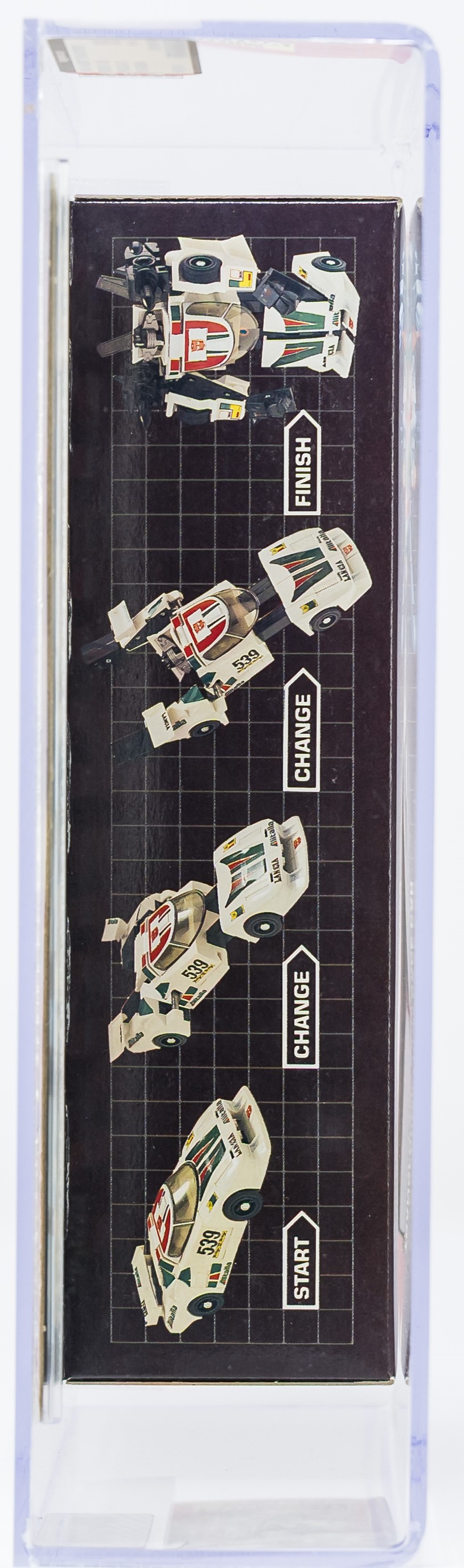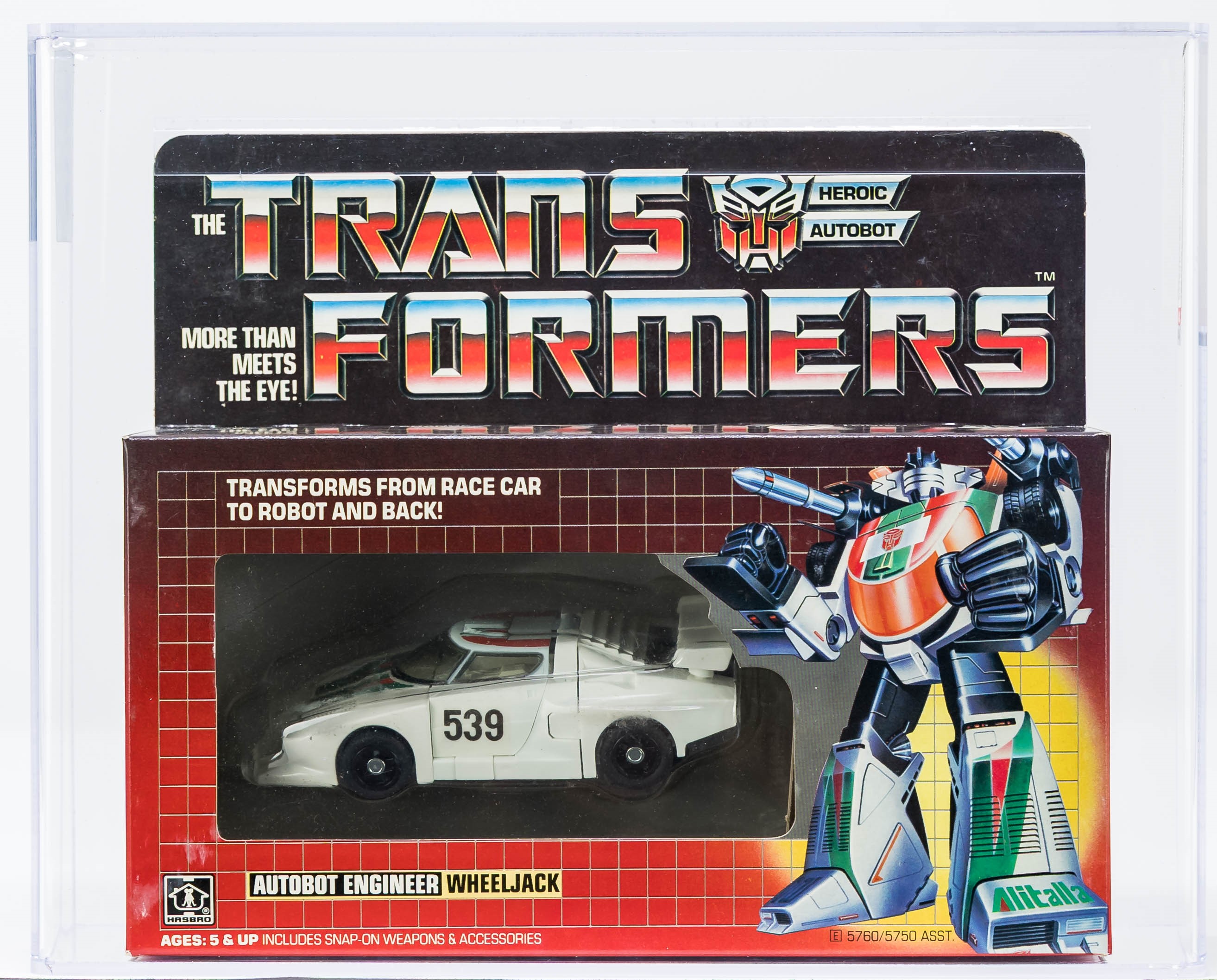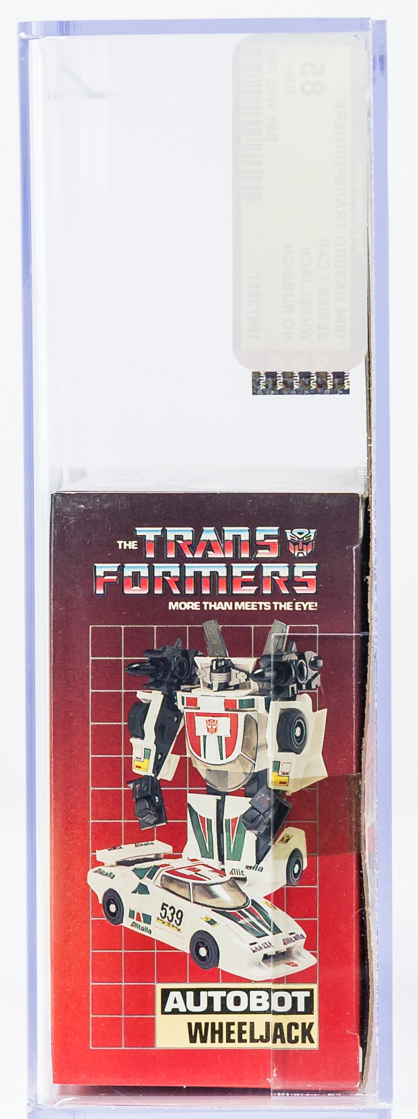 Crisp, high-grade early release MISB example of elusive Series One car: Wheeljack. This MISB prerub stunner is one of the premier cars in the entire G1 line. Extremely sharp, this piece presents exceptionally well with few blemishes. Factory tape adorns each end and no colorbreak whatsoever exists along the edges. The reverse is flawless and free of the typical G1 flap crease.  Display window is clear with no yellowing. We must note that there is some figure rub on the bubble and on the window near the rear wheel. Bubble that holds Wheeljack in place is clear and is firmly attached to the cardboard backing. Overall, an outstanding high-grade example. Wheeljack is one of the cars that is instantly recognizable to all G1 collectors, and as such, is one of the great Series 1 pieces in our hobby.  Encapsulated by AFA (85, 85-85-85), #18673657