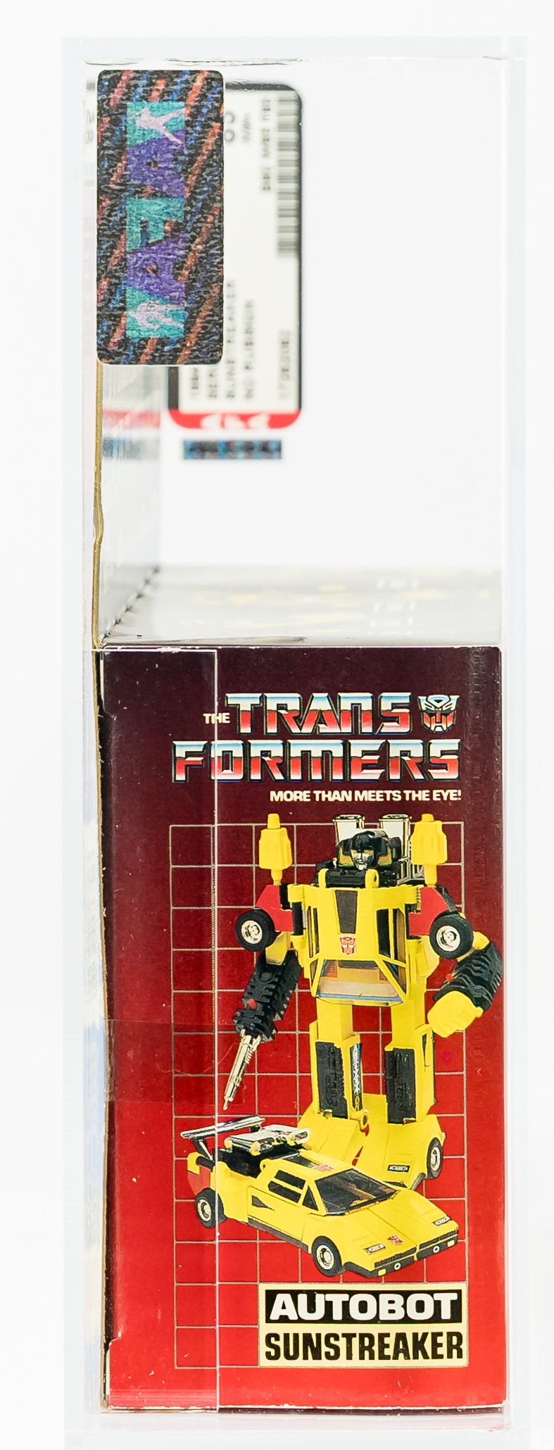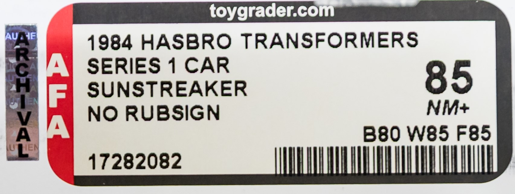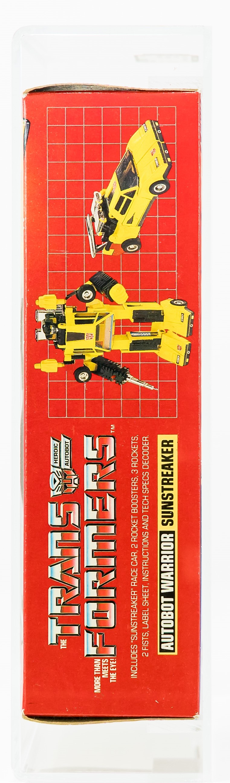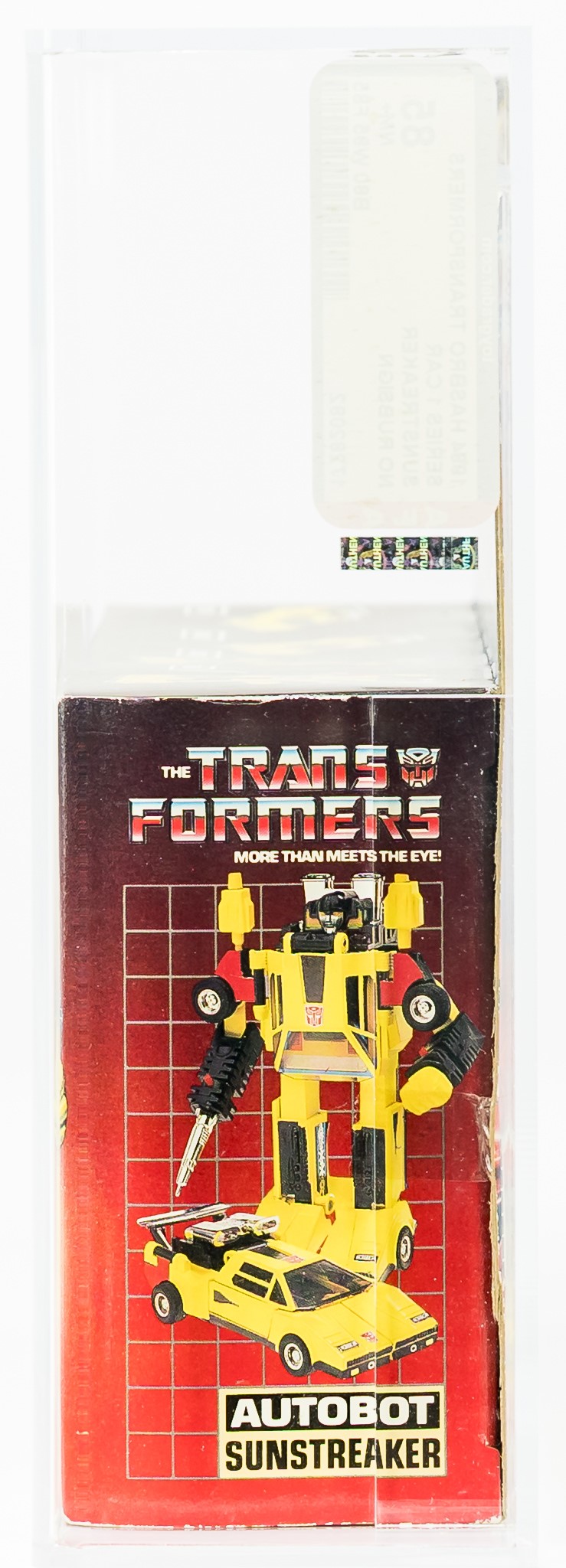 Desirable early release “Prerub” Sunstreaker from Series 1 released in 1984. Outstanding MISB example with few notable flaws. The flap crease on the reverse is the main culprit. Each end is firmly factory tape sealed and there is no colorbreak along either of the front edges. Display window is crystal clear as is the bubble that holds Sunstreaker in place. Sunstreaker car looks outstanding within. A golden opportunity to acquire an ultra-high grade Prerub Autobot car from Series 1. Encapsulated by AFA (85, 85-85-85), #17282082