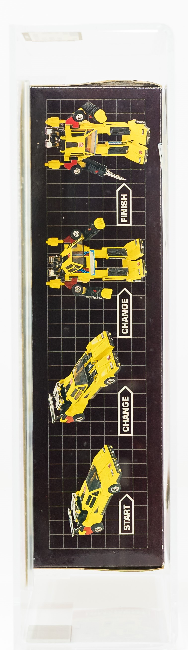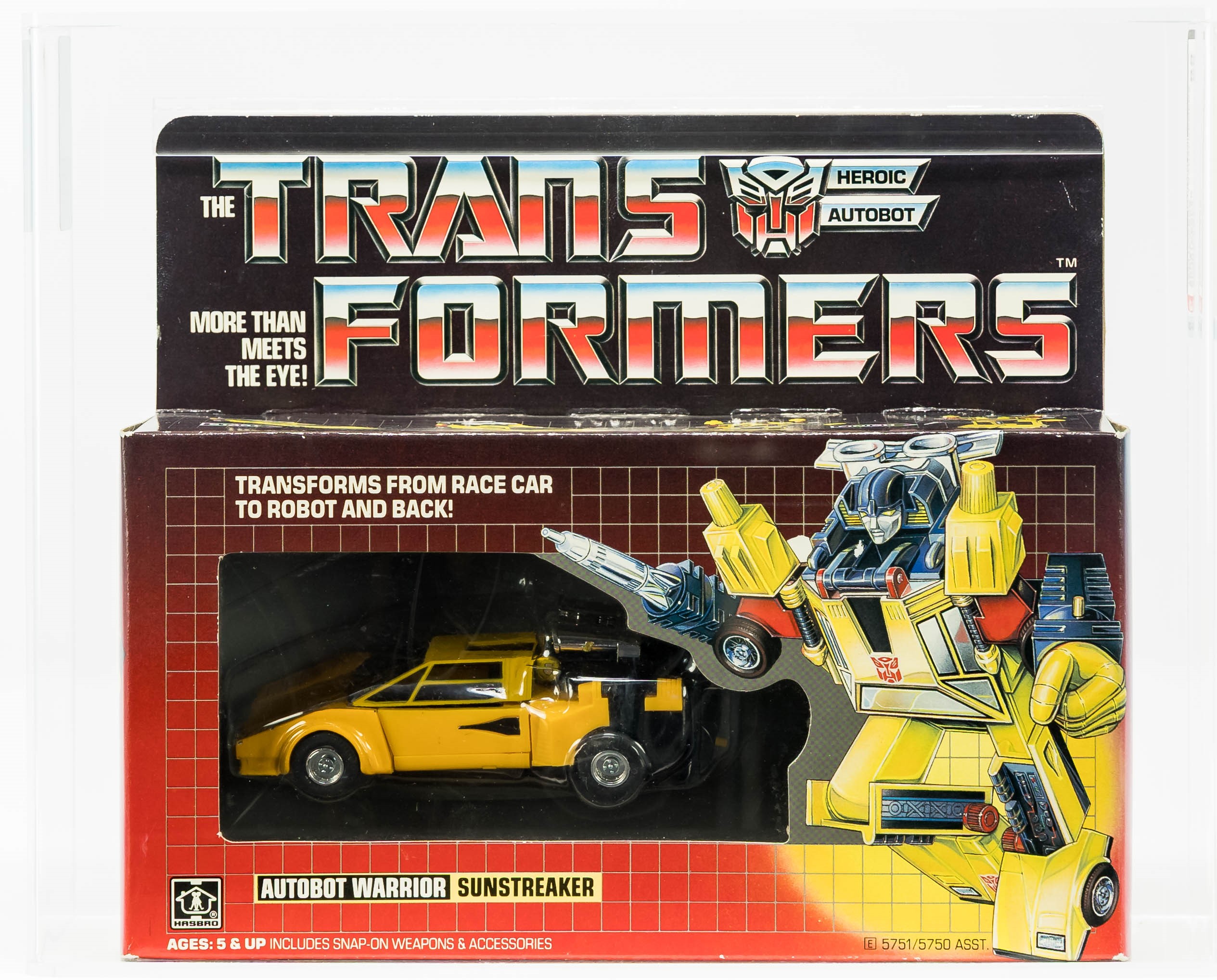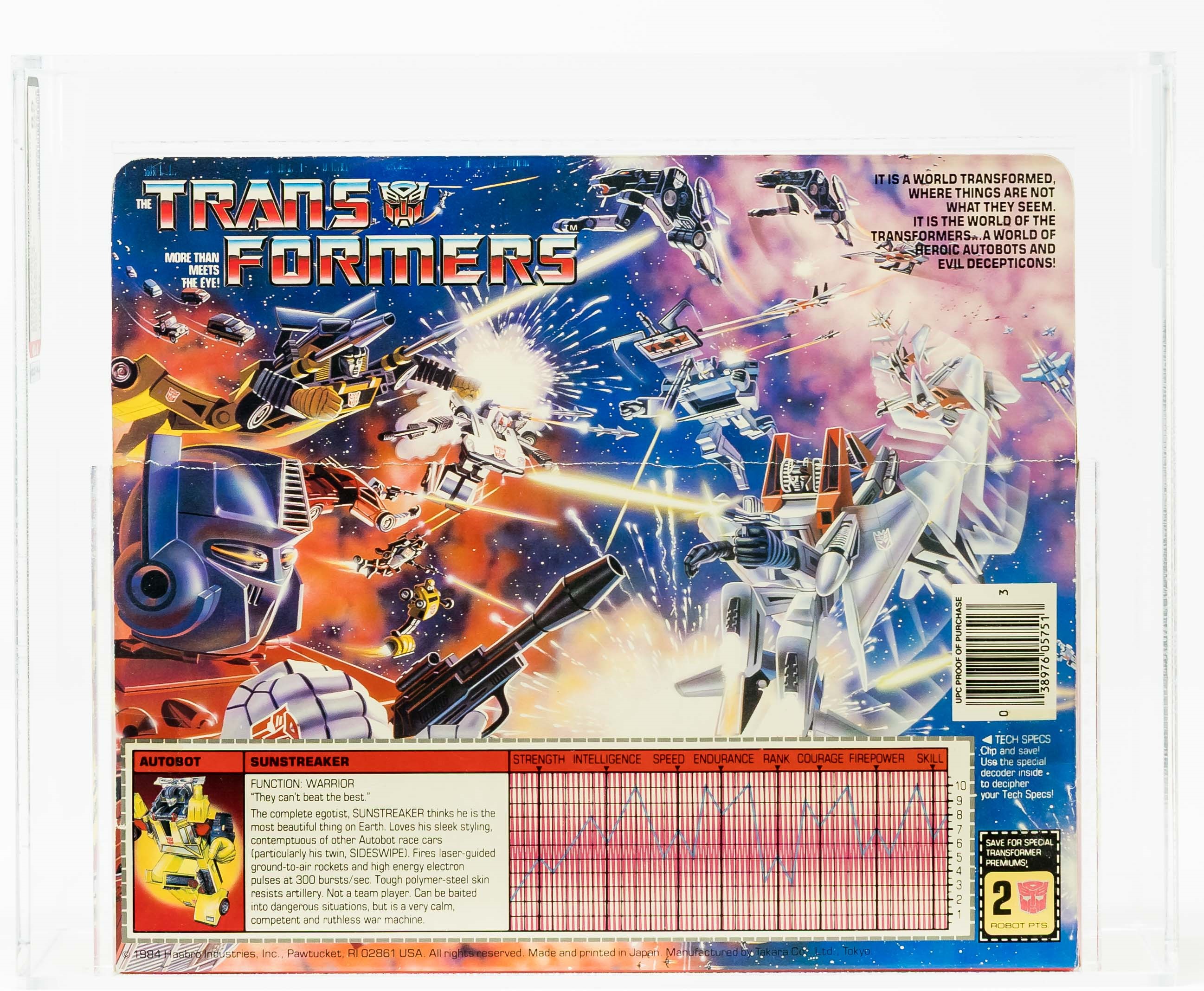 Desirable early release “Prerub” Sunstreaker from Series 1 released in 1984. Outstanding MISB example with few notable flaws. The flap crease on the reverse is the main culprit. Each end is firmly factory tape sealed and there is no colorbreak along either of the front edges. Display window is crystal clear as is the bubble that holds Sunstreaker in place. Sunstreaker car looks outstanding within. A golden opportunity to acquire an ultra-high grade Prerub Autobot car from Series 1. Encapsulated by AFA (85, 85-85-85), #17282082