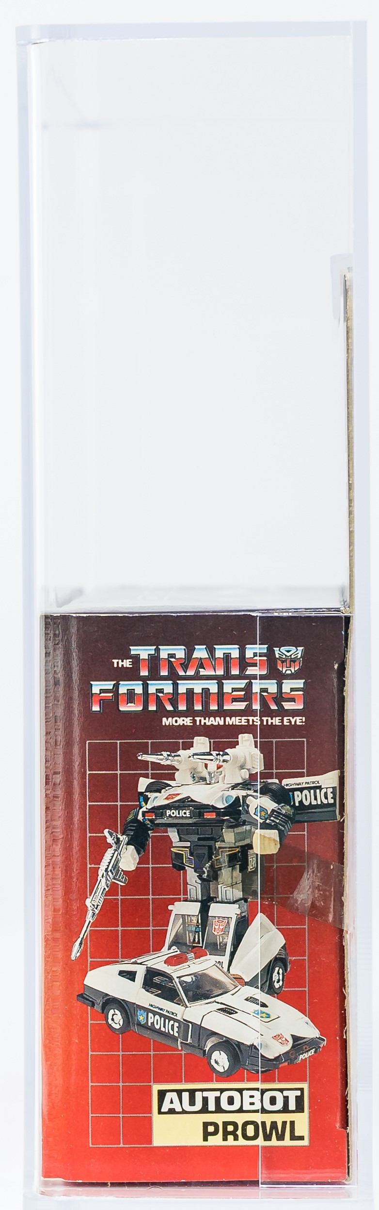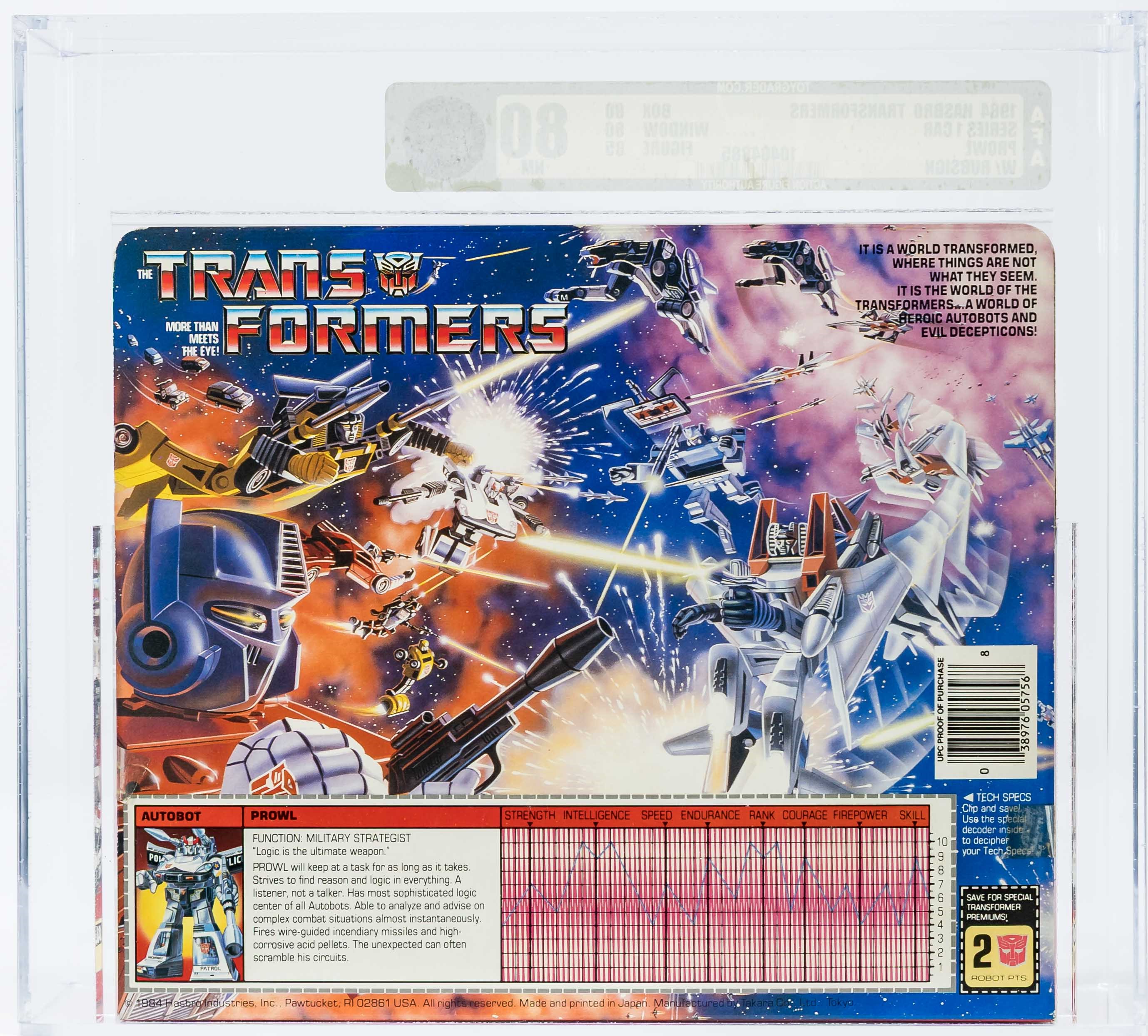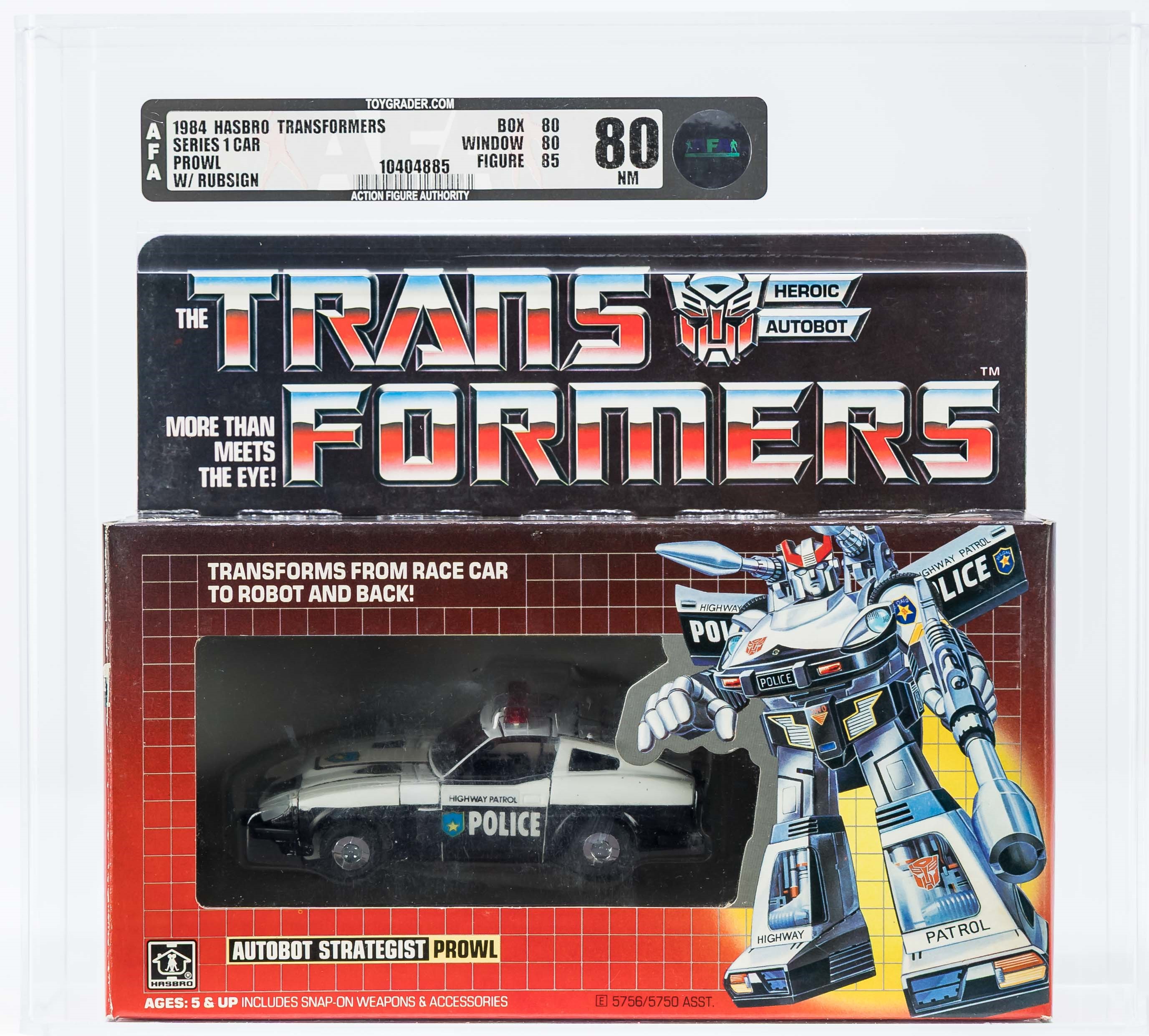 Solid box with few blemishes. We identified a bit of surface wear in the black color found on the top panel and upper flap. Also, a small tear on the top panel under “Start”. Nice box overall but not exceptional – in our opinion, the 80 subgrade is accurate. Each end has tape present. The left side has tape attached (based on the outline, it appears to have moved from its original position) and there is color break present along the front edge. On the right, the end of the tape is lifted but appears attached near the edge. No colorbreak along the right front edge. Display window is clear but there is some surface wear. Bubble within is clear as is firmly attached to the cardboard backing. Prowl car looks excellent with no yellowing. Encapsulated by AFA (85, 80-85-90), #16294108