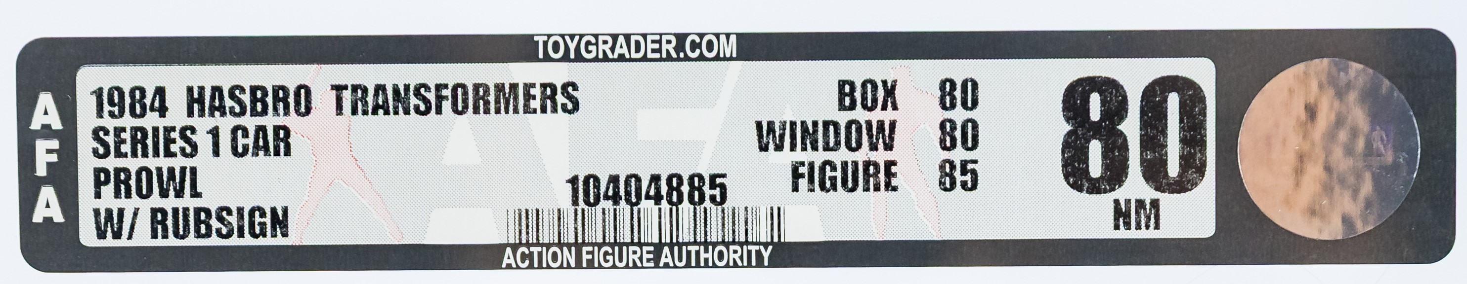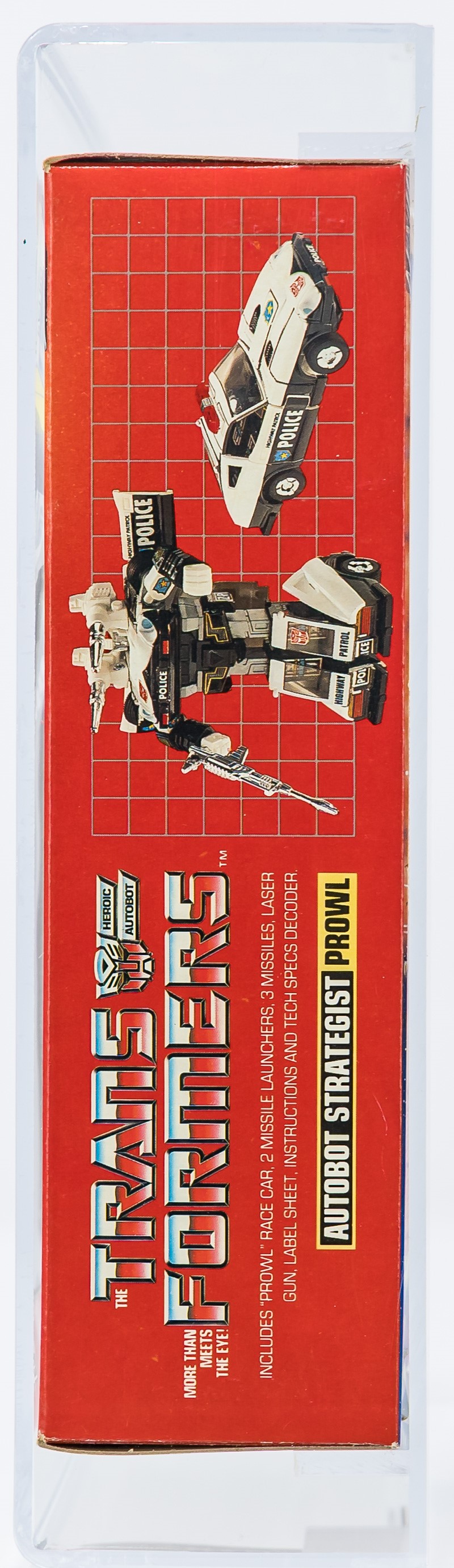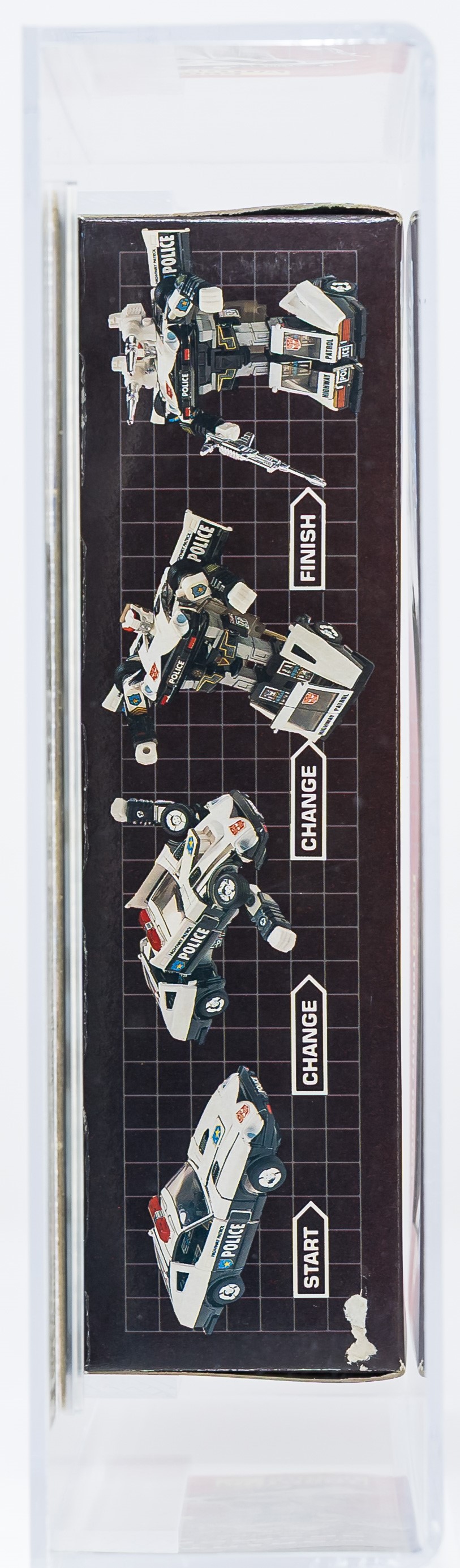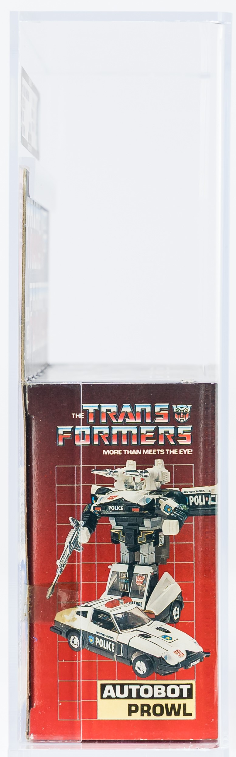 Solid box with few blemishes. We identified a bit of surface wear in the black color found on the top panel and upper flap. Also, a small tear on the top panel under “Start”. Nice box overall but not exceptional – in our opinion, the 80 subgrade is accurate. Each end has tape present. The left side has tape attached (based on the outline, it appears to have moved from its original position) and there is color break present along the front edge. On the right, the end of the tape is lifted but appears attached near the edge. No colorbreak along the right front edge. Display window is clear but there is some surface wear. Bubble within is clear as is firmly attached to the cardboard backing. Prowl car looks excellent with no yellowing. Encapsulated by AFA (85, 80-85-90), #16294108