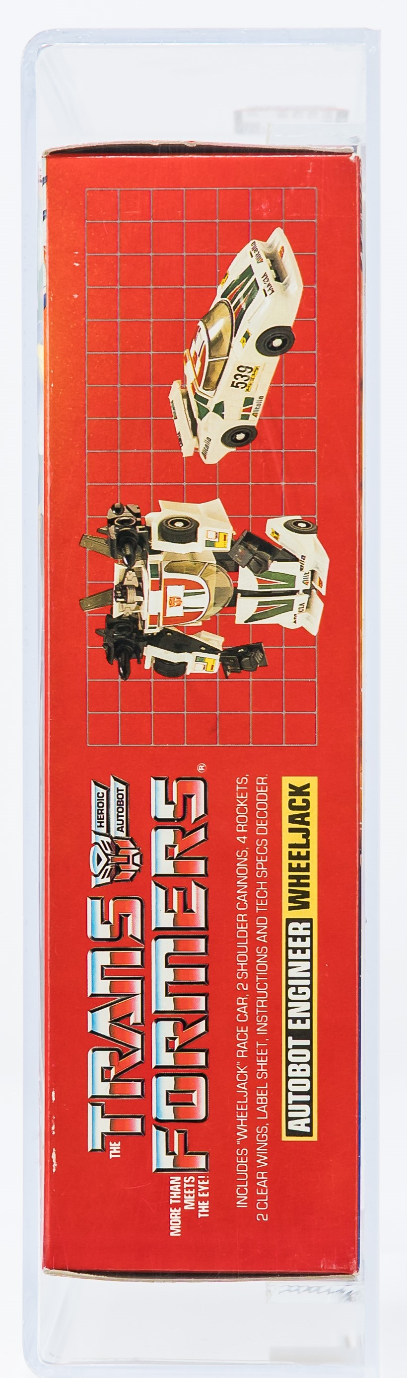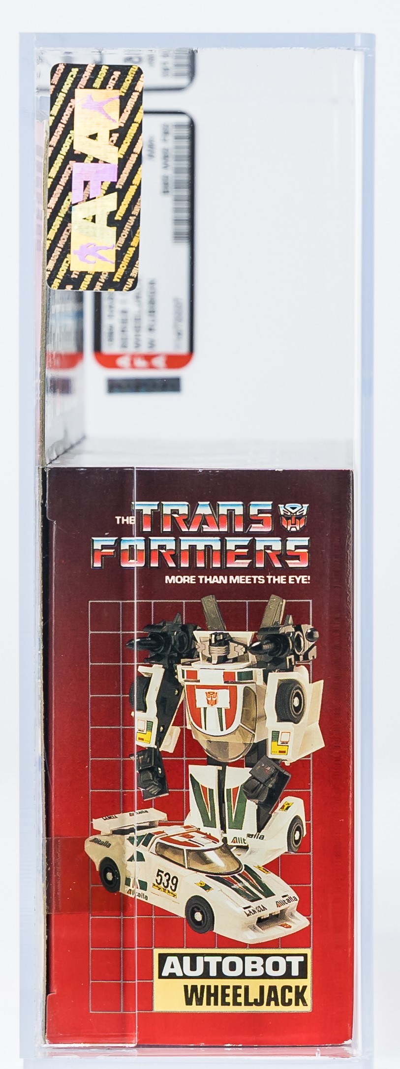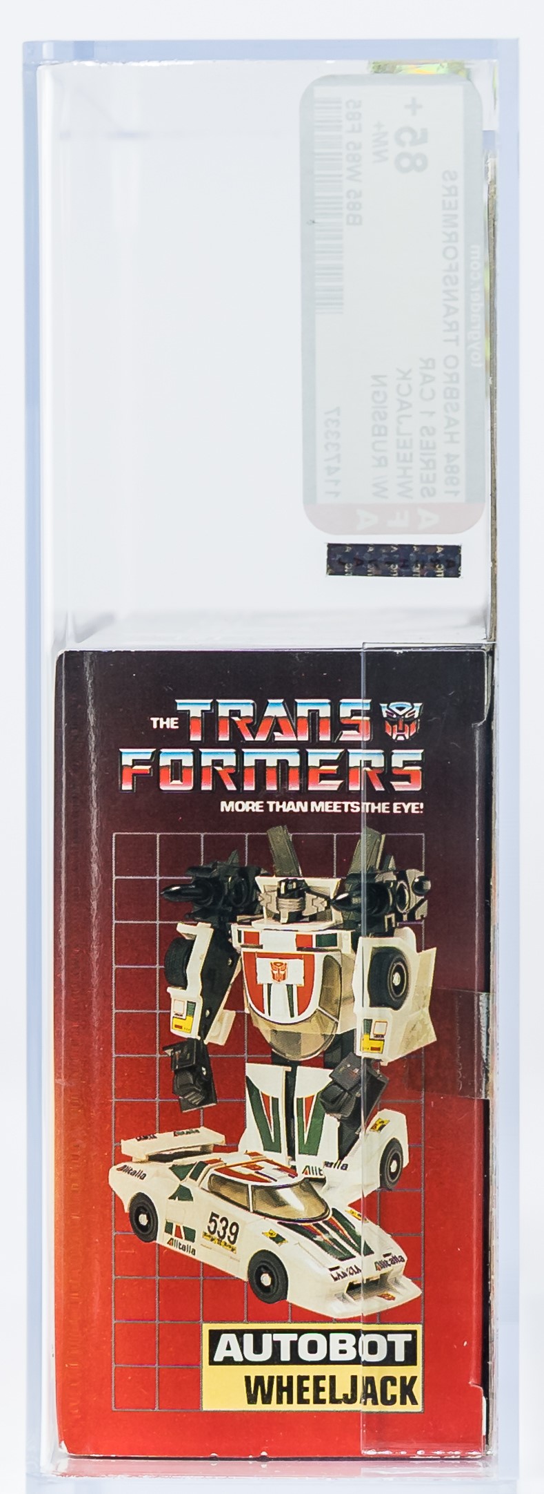 Exceptional ultra high-grade MISB example of popular Series One car: Wheeljack. An extraordinary MISB example in all respects. As expected, this piece exhibits no colorbreak whatsoever along the front edges and the factory tape is present and remains firmly intact on each end. The reverse is flawless and free of the typical G1 flap crease. An extremely rare opportunity to acquire a miraculous AFA 85+ car, which would be a tremendous addition to any upper-end G1 collection. In regard to eye appeal, this is the finest example of Wheeljack that we’ve handled. Sourced from a world class G1 collection. Encapsulated by AFA (85+, 85-85-85), #11473337