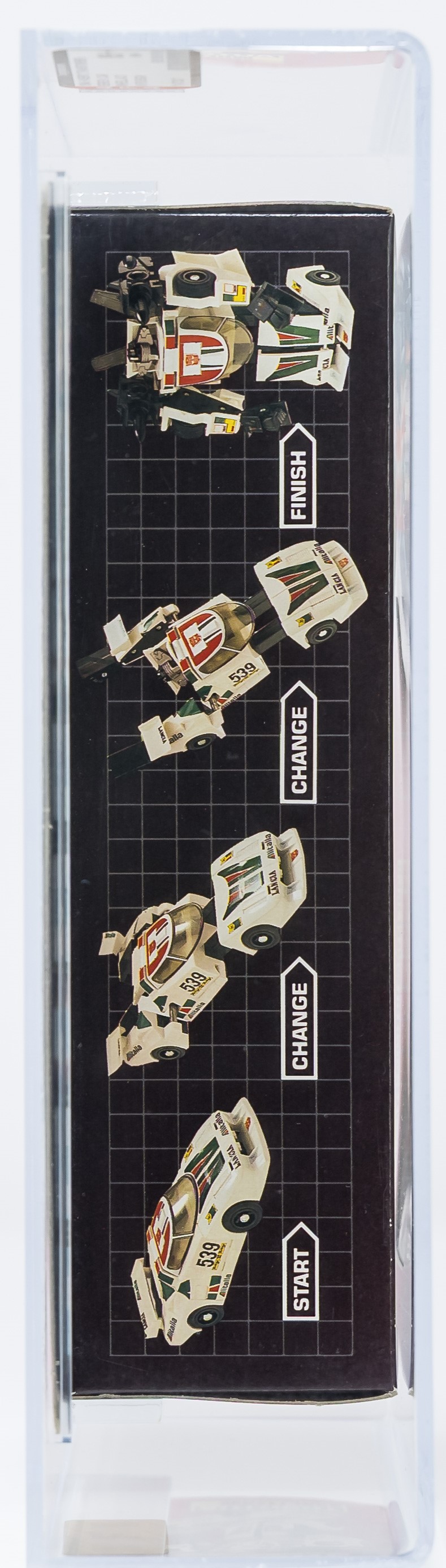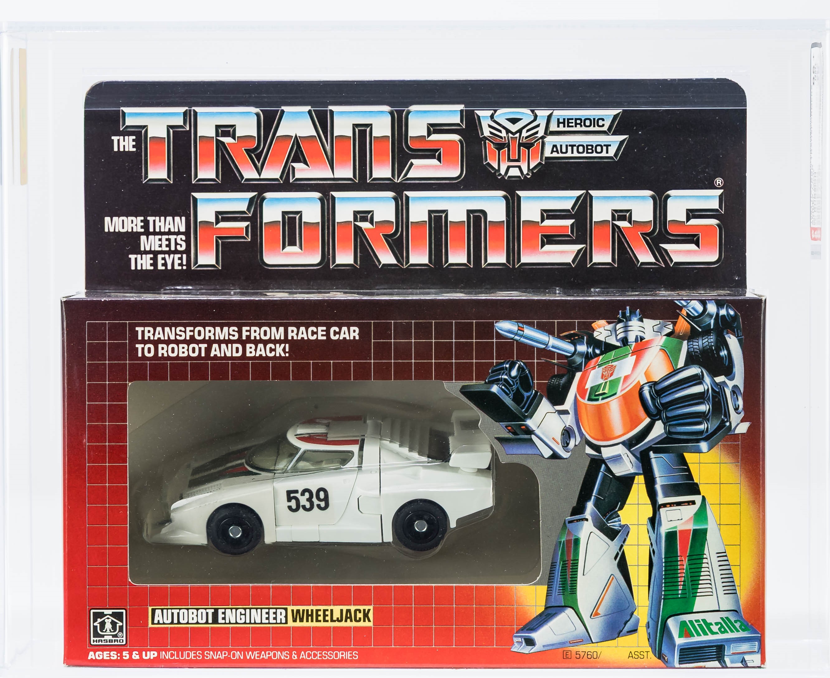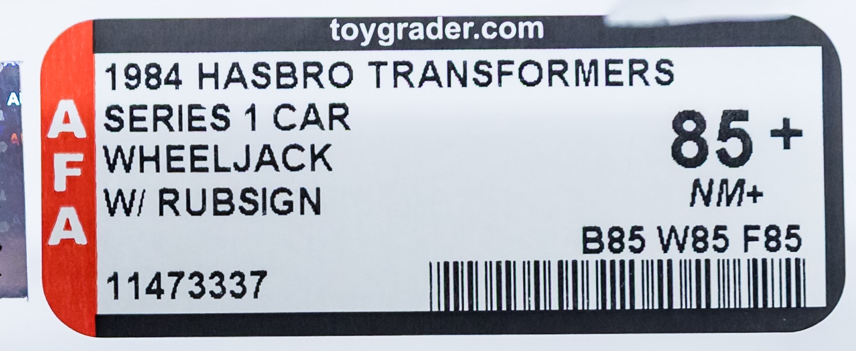 Exceptional ultra high-grade MISB example of popular Series One car: Wheeljack. An extraordinary MISB example in all respects. As expected, this piece exhibits no colorbreak whatsoever along the front edges and the factory tape is present and remains firmly intact on each end. The reverse is flawless and free of the typical G1 flap crease. An extremely rare opportunity to acquire a miraculous AFA 85+ car, which would be a tremendous addition to any upper-end G1 collection. In regard to eye appeal, this is the finest example of Wheeljack that we’ve handled. Sourced from a world class G1 collection. Encapsulated by AFA (85+, 85-85-85), #11473337