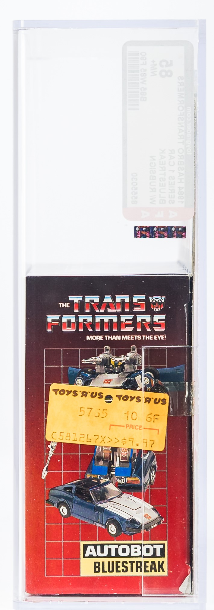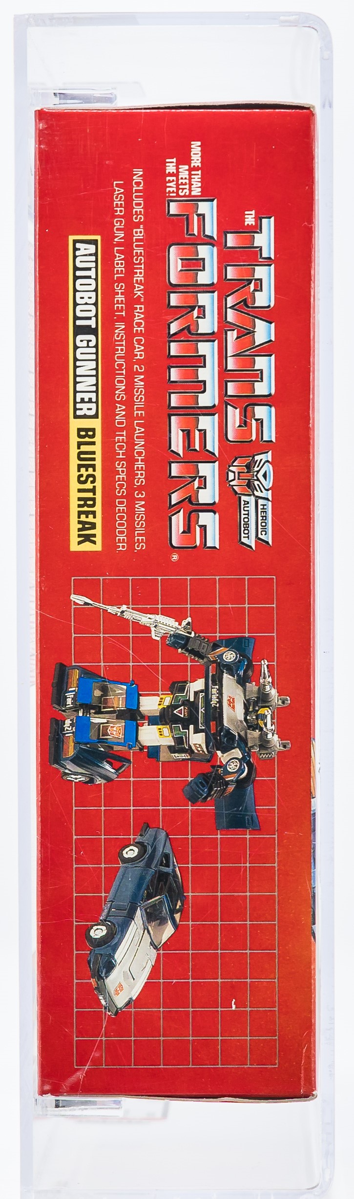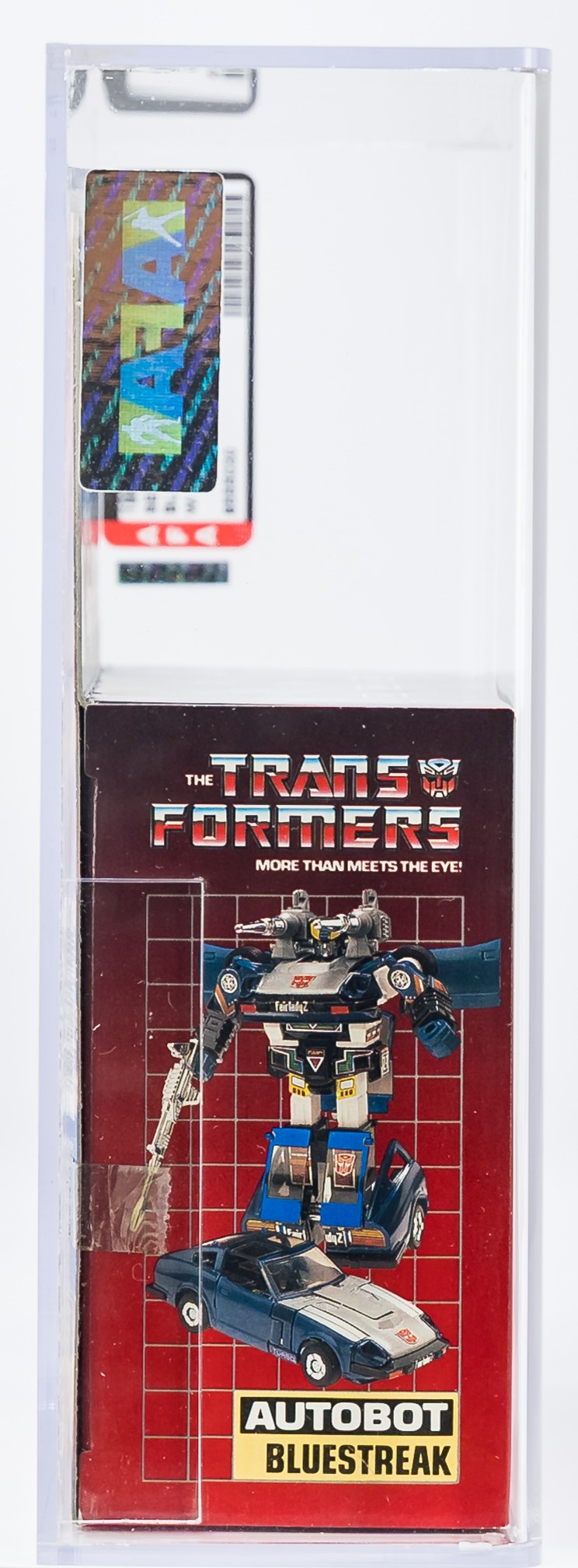 Gorgeous MISB Bluestreak from Series 1 released in 1984. Box is nearly flawless, the only culprit of note is a light flap crease on the reverse. Each end is factory tape sealed and there is no colorbreak along either of the front edges. Display window is clear as is the bubble that holds Bluestreak in place. Bluesteak car is in mind condition. Please note there is a light scratch on the outside of the acrylic casing near the top of the window. Encapsulated by AFA (85, 85-85-90), #8555030