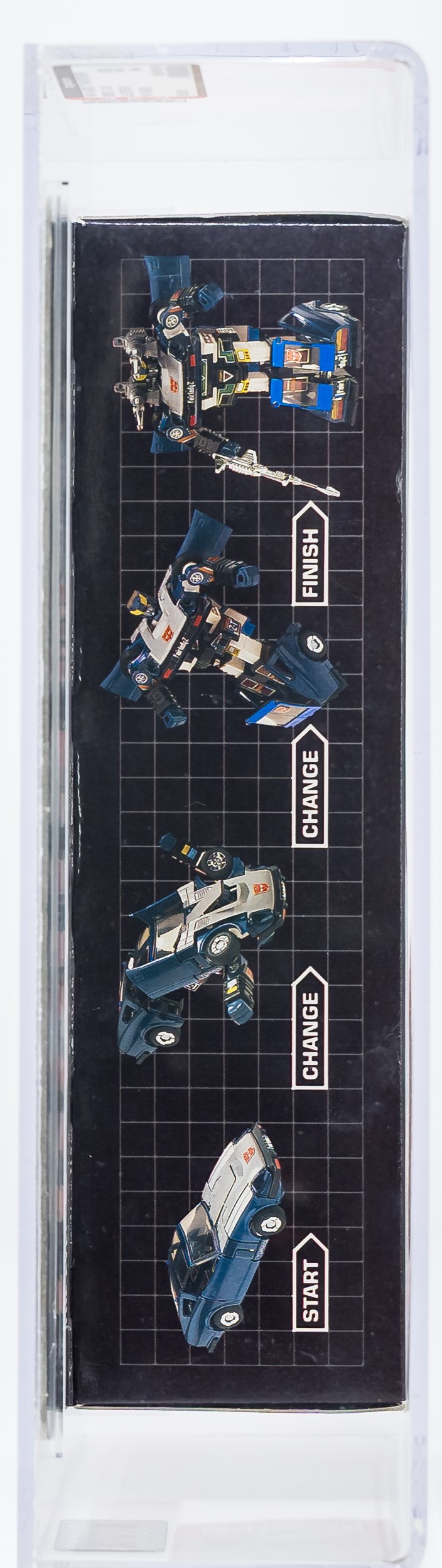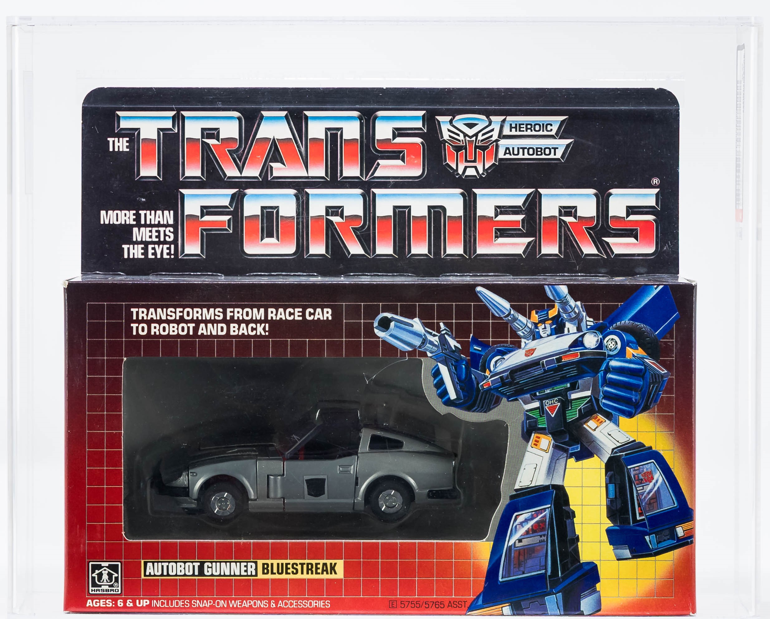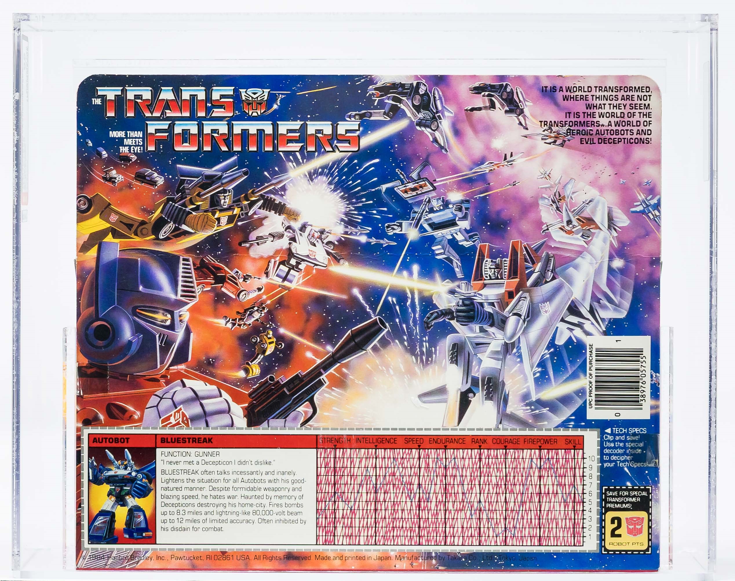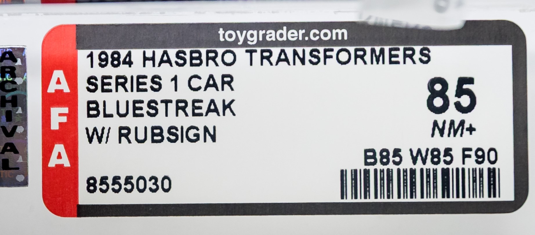 Gorgeous MISB Bluestreak from Series 1 released in 1984. Box is nearly flawless, the only culprit of note is a light flap crease on the reverse. Each end is factory tape sealed and there is no colorbreak along either of the front edges. Display window is clear as is the bubble that holds Bluestreak in place. Bluesteak car is in mind condition. Please note there is a light scratch on the outside of the acrylic casing near the top of the window. Encapsulated by AFA (85, 85-85-90), #8555030